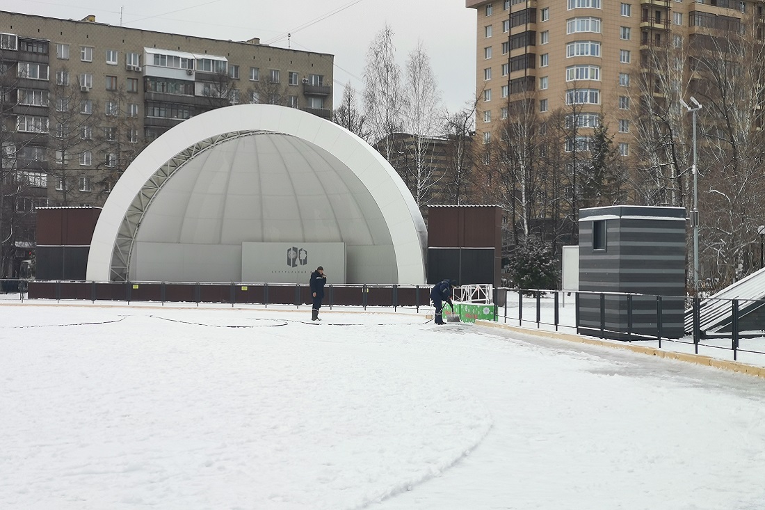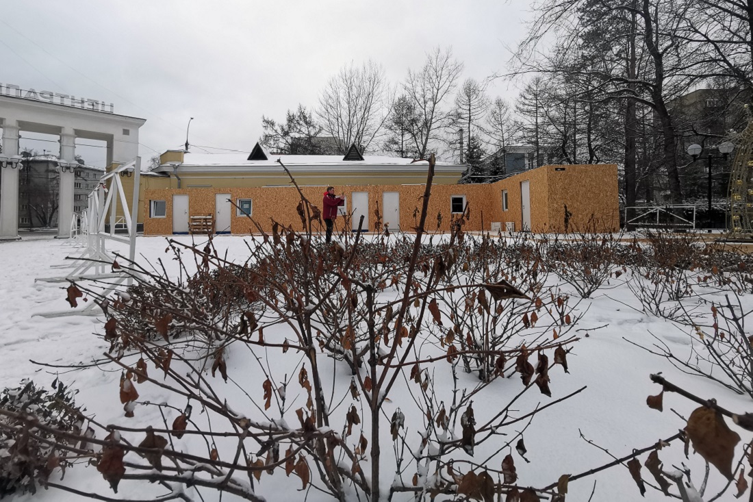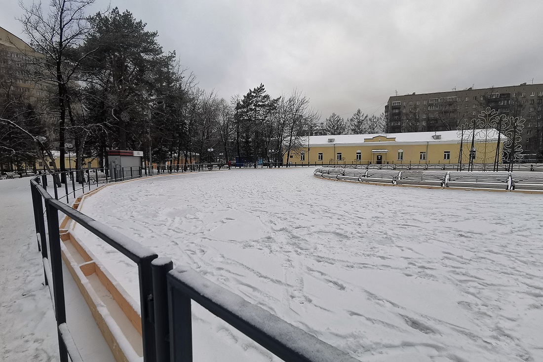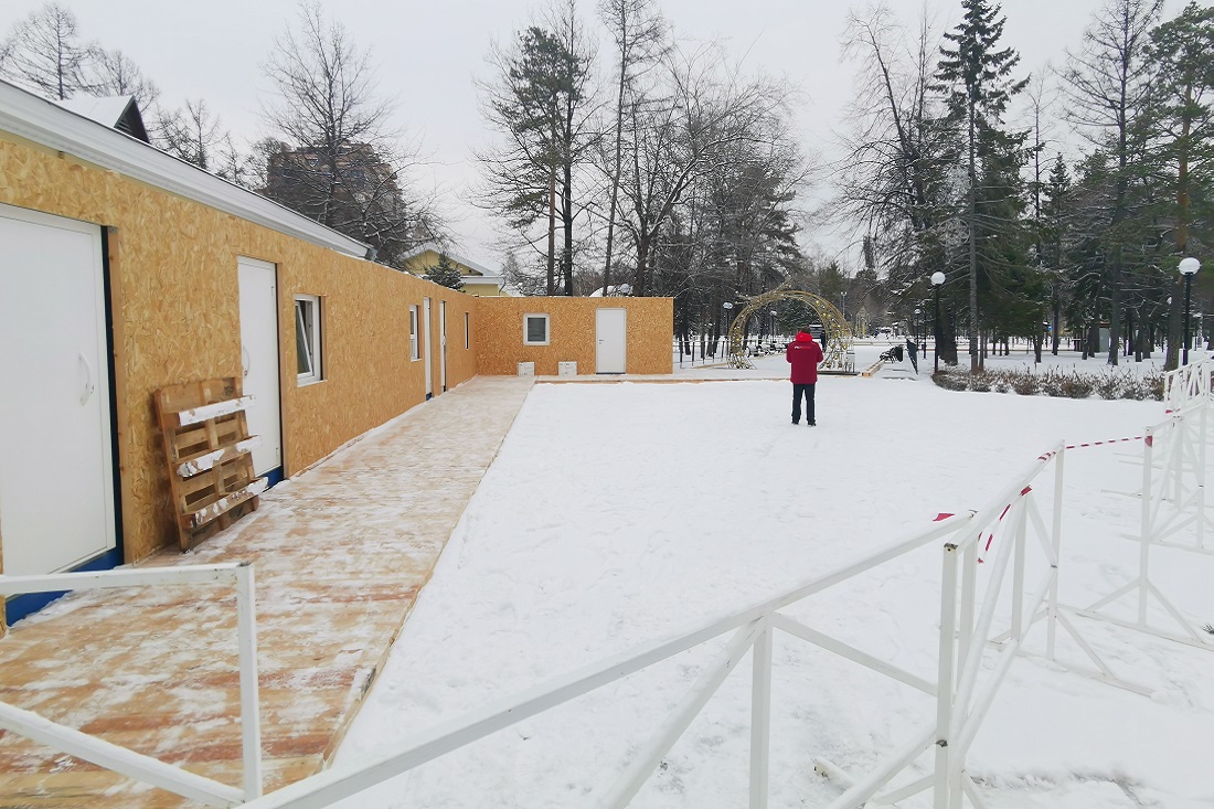 В Центральном парке тем временем заливают каток. По его периметру установили ограждения и деревянные бортики. У входа на территорию собрали пункт проката коньков.