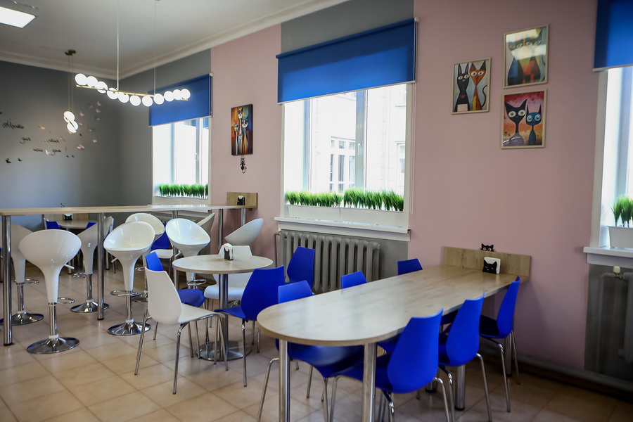 Столовая называется «Котокафе». Интерьер украсили картинами с милыми животными.