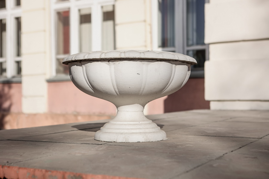 На старых чёрно-белых фотографиях можно увидеть на пилонах крыльца две симметричные стелы, а на крыше — шпиль. И то и другое сейчас утрачено. Вместо стел входную группу украшают аккуратные вазоны для цветов. Это новые элементы благоустройства. А тот объёмный вазон, что находится рядом со зданием, — исторический.