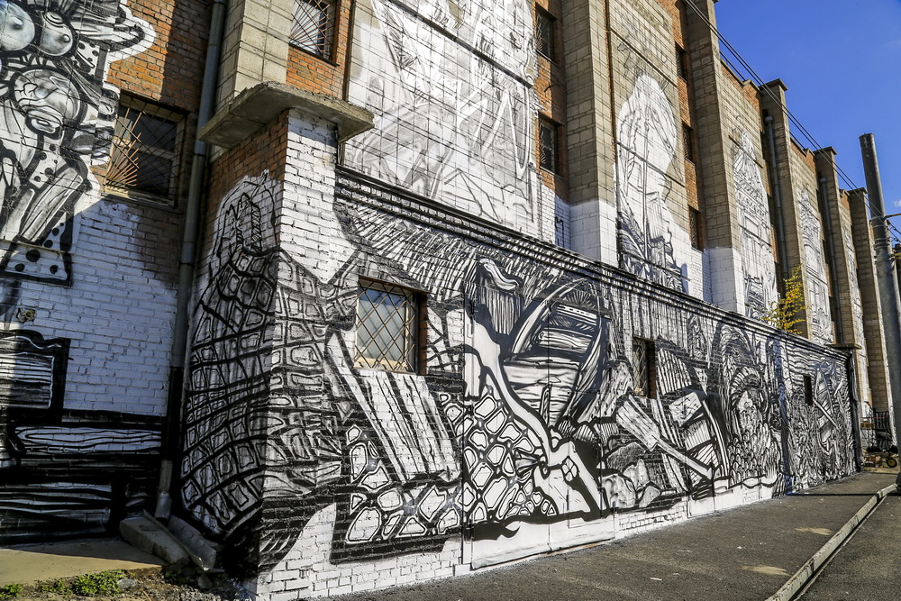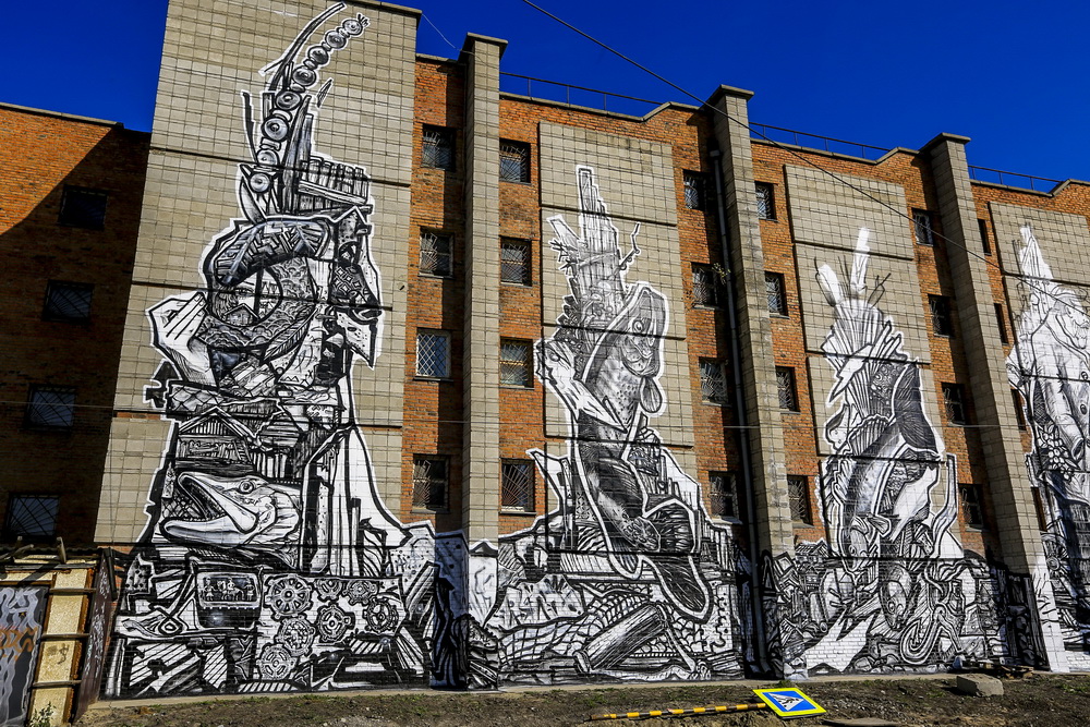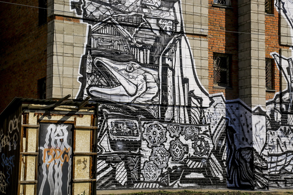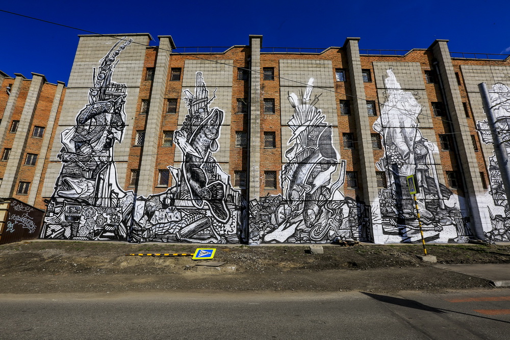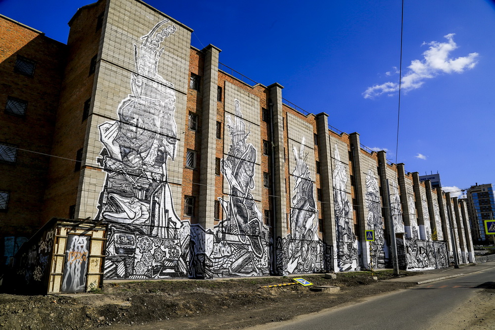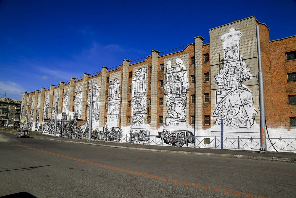 Масштабный мурал создают в центре Новосибирска. Работа под названием «Страницы истории 2.0» украсит стену гаражного комплекса на улице Серебренниковской.