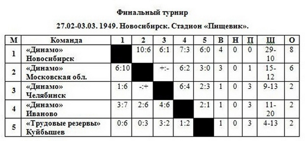 Далее вверх рядом со спасательной станцией размещалось футбольное поле общества «Пищевик». Здесь осенью 1948 года соорудили первую хоккейную коробку. А 27 февраля 1949-го в город пришёл большой хоккей. Победители пяти территориальных зон съехались в Новосибирск для проведения финала первенства РСФСР. Более 2000 болельщиков облепили снежный вал вокруг коробки «Пищевика». Только что созданная команда «Динамо» (Новосибирск) выиграла все матчи как зональных соревнований, так и решающего турнира и стала чемпионом республики. Валентин Кузин, будущий обладатель золота Олимпиады — 1956, в четырёх играх финала забросил в ворота соперников 19 шайб!