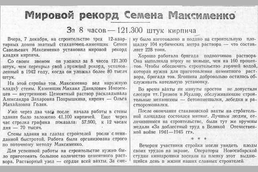 Один рабочий раскладывал раствор, другой — стройматериал. Максименко вёл внешнюю стену, каменщик Иноземцев — внутреннюю. Ещё двое делали за ними забутовку. Один ряд стен бригада укладывала за 16 минут. За две недели полностью построили основу трёх двухэтажных 12-квартирных домов. Стоят они и сегодня, позднее наращённые ещё на этаж.