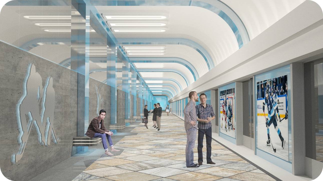 И там, где метромост переходит в остеклённую эстакаду, появится 14-я станция метро, в едином стиле с ледовым комплексом. Дизайн «Спортивной» выбирали всем городом из шести предложенных вариантов.