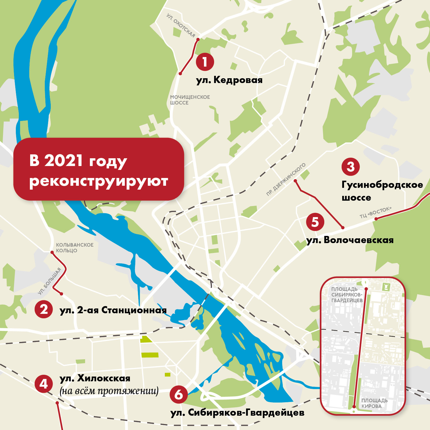 По данным пресс-центра мэрии, в будущем году по нацпроекту в Новосибирске отремонтируют как минимум шесть участков дорог. Продолжат реконструкцию Кедровой, 2-й Станционной и ГБШ. Также в планах — ремонт улицы Хилокской на всей её протяжённости, улицы Волочаевской (от проспекта Дзержинского до Гусинобродского шоссе) и улицы Сибиряков-Гвардейцев от одноимённой площади до площади Кирова.