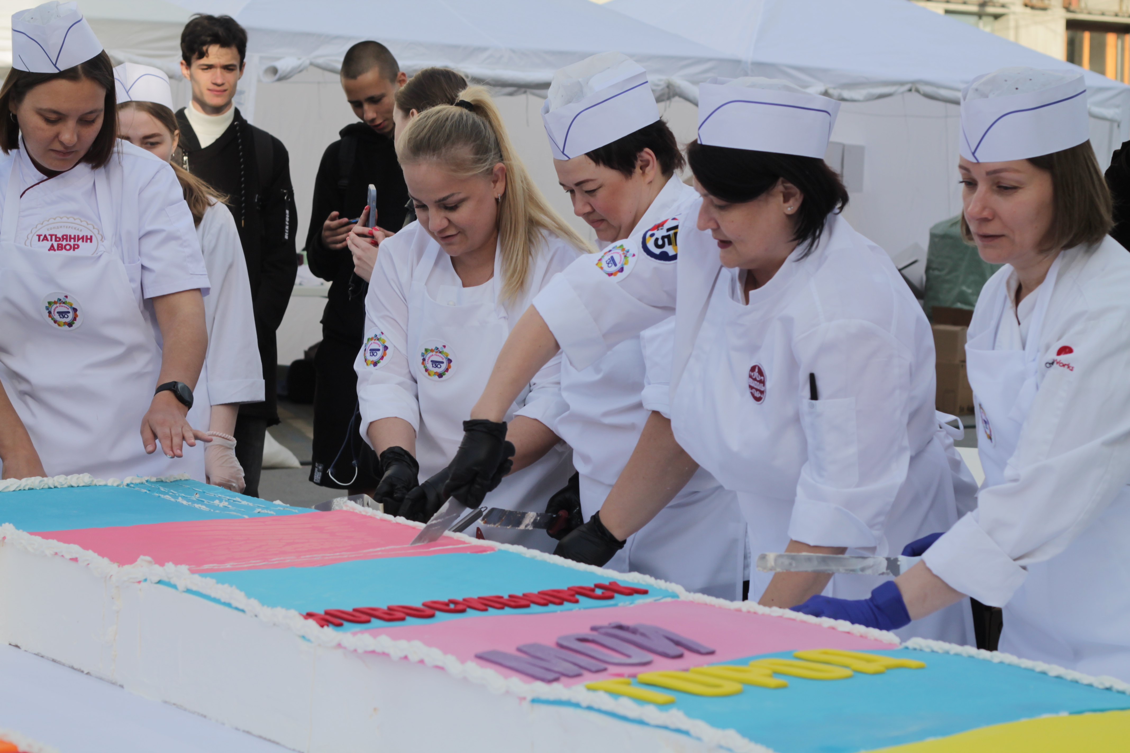 Над созданием бисквитов трудились полсотни кондитеров. Из готовых коржей выложили цифру «130» с высотой символов более 3,5 метров. Композиция заняла площадь в 22,5 кв. метра. По словам участников, на сладкое произведение ушло 4670 яиц, 300 килограммов растительных сливок, несколько десятков литров сгущенки.