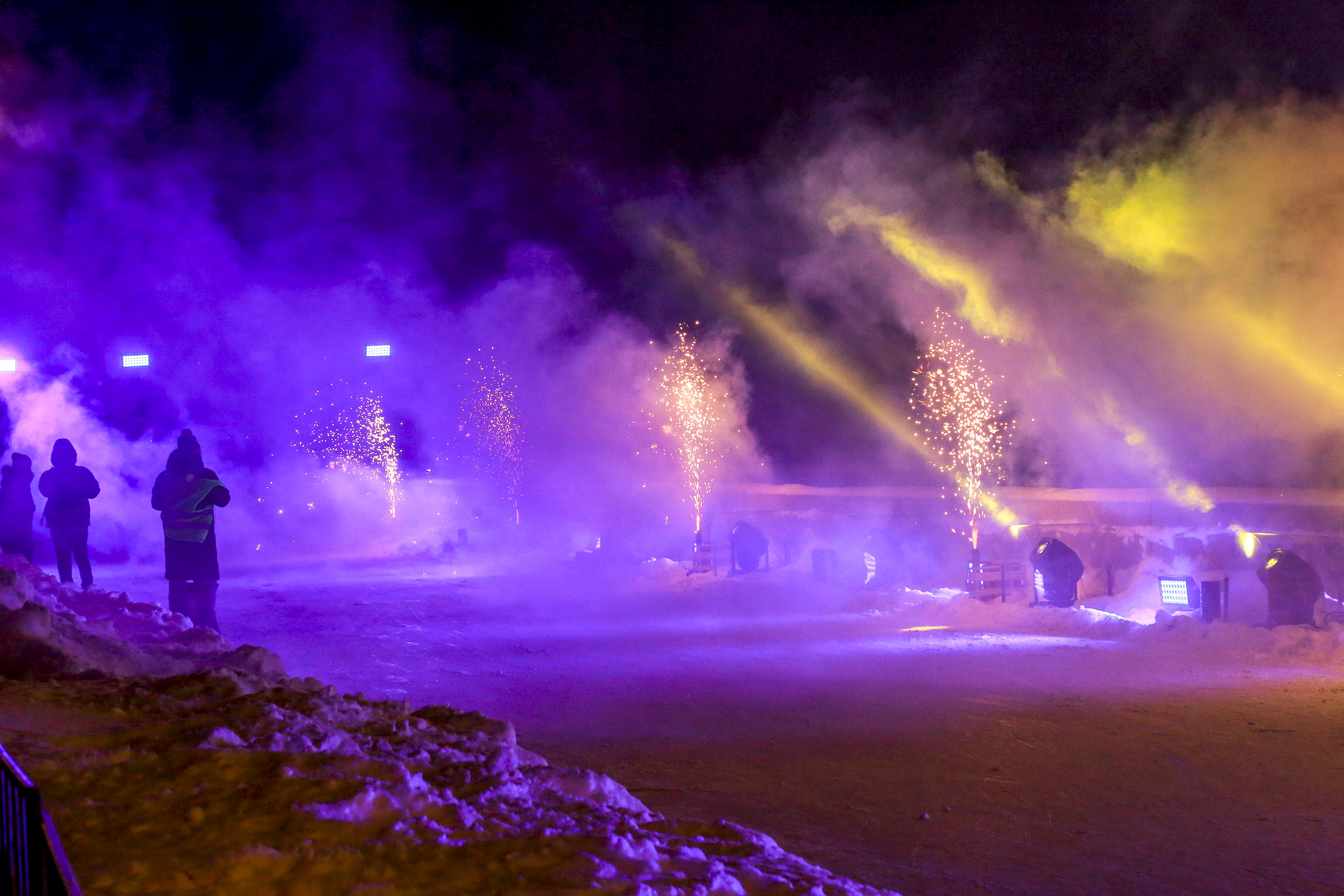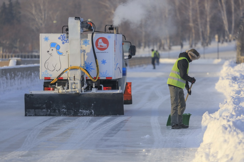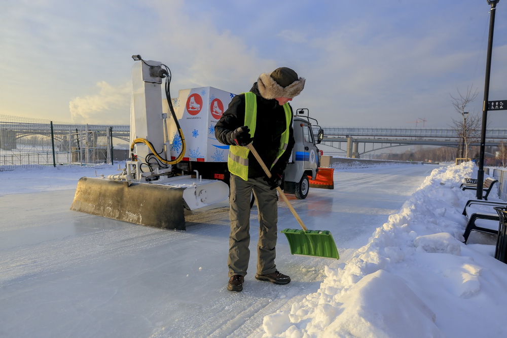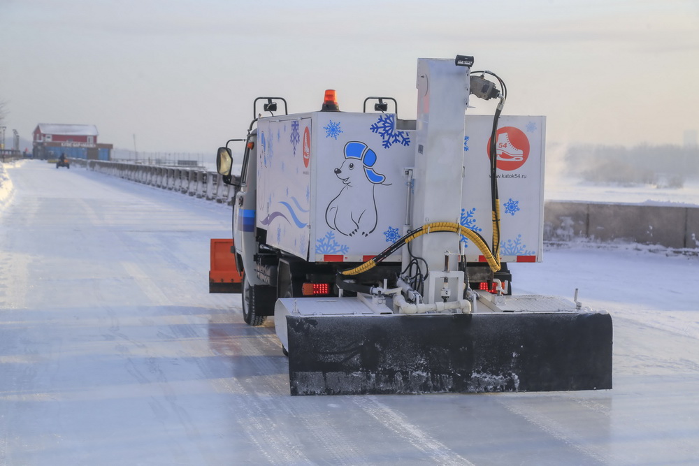 Чтобы рекорд состоялся, в парк свезли 1400 кубометров снега, залили получившуюся подушку сначала холодной водой, а после использовали девять тонн горячей. Её подавали по смонтированной ради этого 20-метровой трубе со старейшей насосной станции города №1, рассказывают в Сибирской генерирующей компании, которая содействовала появлению ледовой площадки.