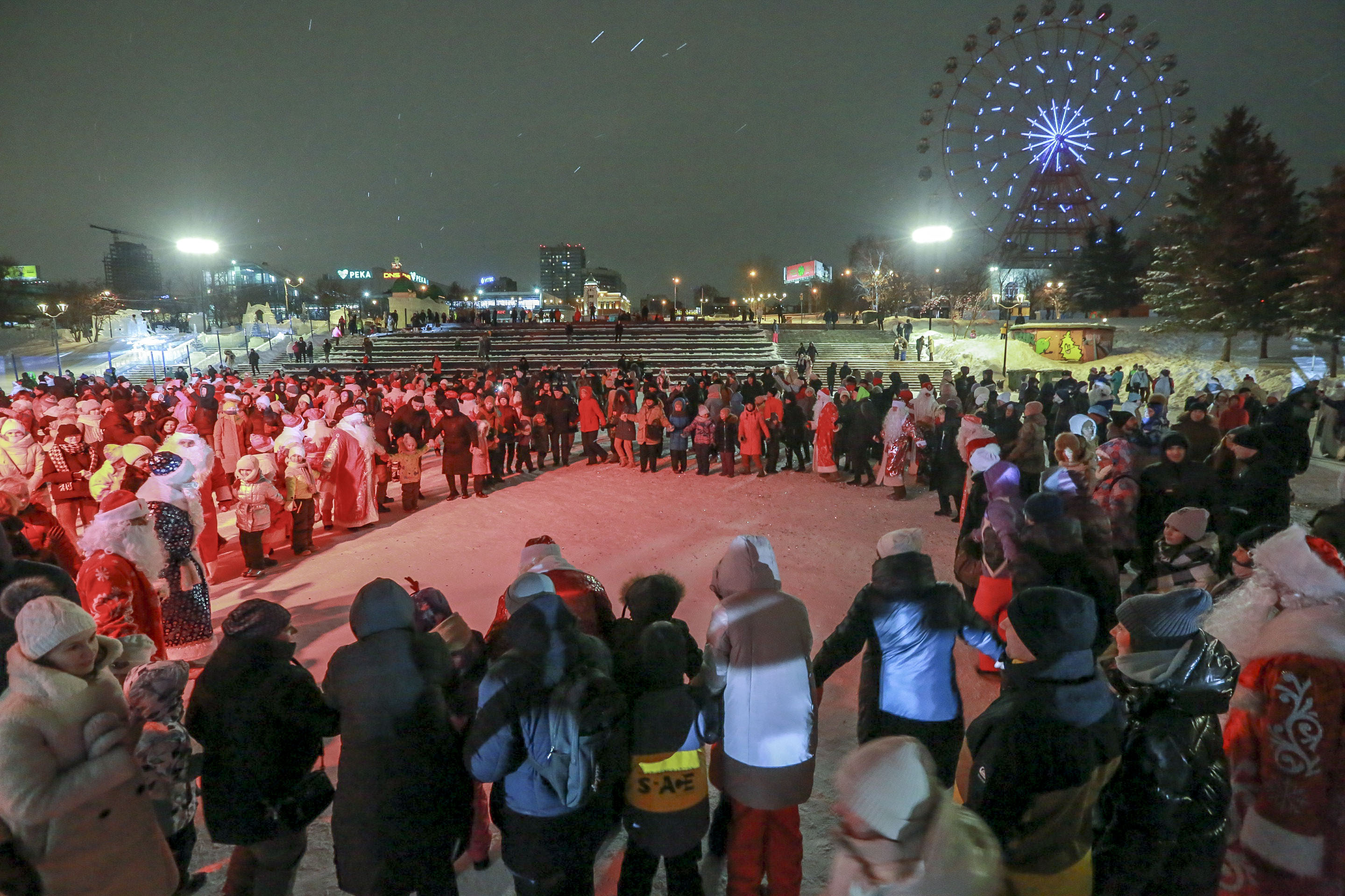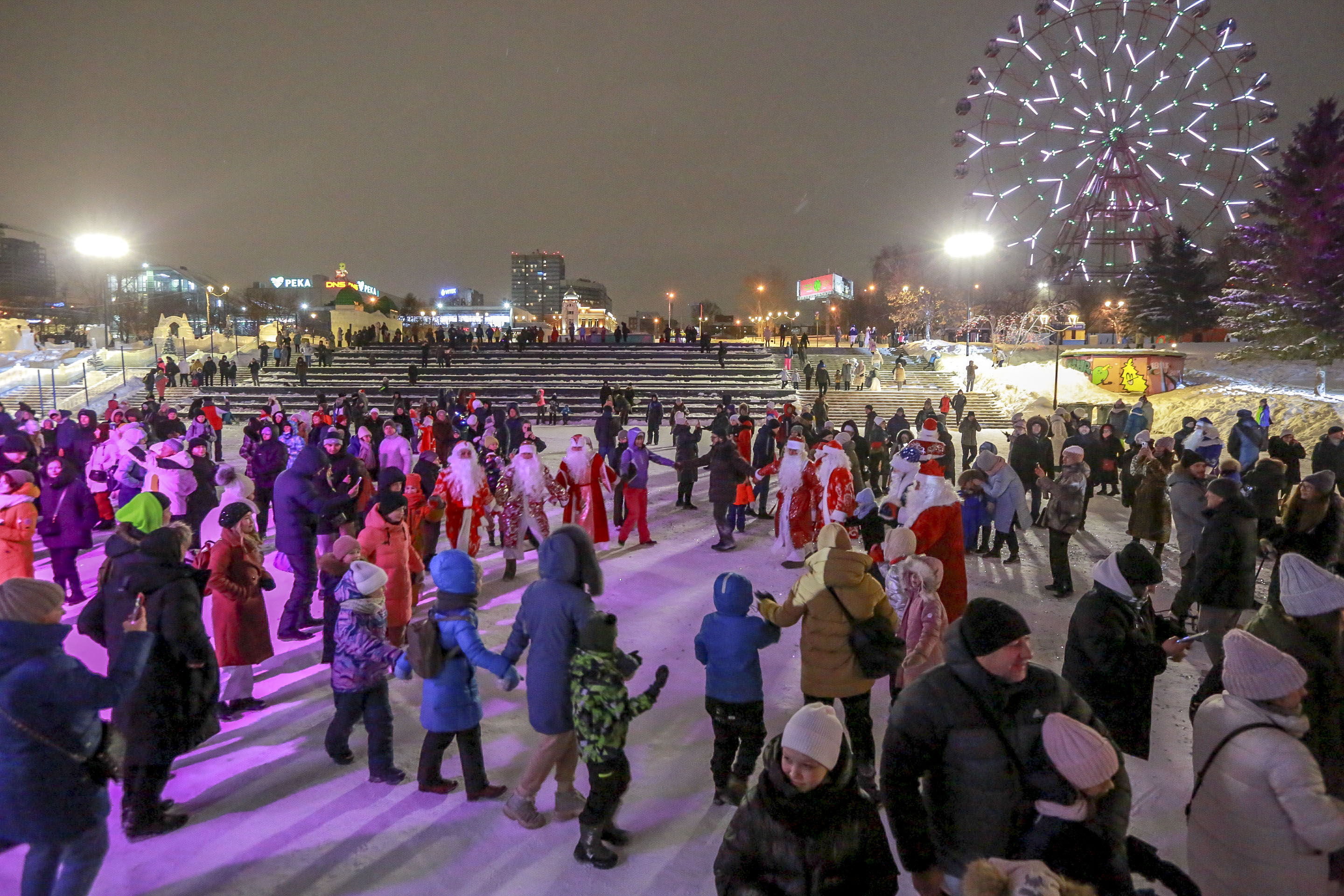 1300-метровая дорога из натурального льда протянулась по нижнему променаду от парка «Городское начало» до пристани Речного вокзала. Открывать гигантский каток приехали Деды Морозы со всей страны. Такого новосибирцы и гости нашего города действительно никогда ещё не видели.