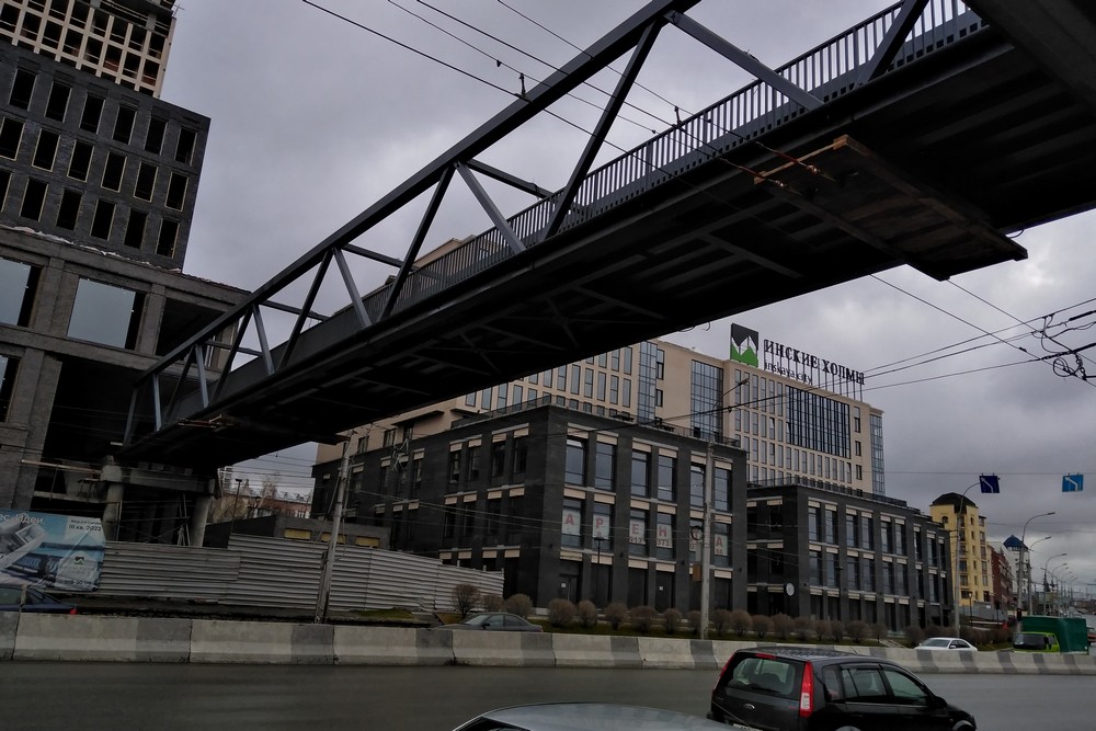 Пешеходный пролёт моста имеет проектную длину 98,6 метра, ширину три метра, весит 55 тонн. Со стороны сити-квартала выходить на эстакаду можно будет прямо из здания. На набережной у моста предусмотрели лестнично-лифтовой узел. Крыши у перехода не будет, он останется открытым. Конструкции выкрашены в тёмно-графитовый цвет, аналогичный цвет — у фасада зданий сити-квартала.