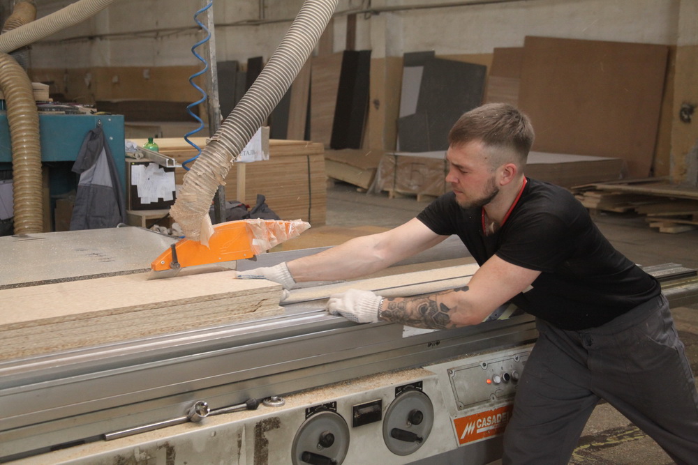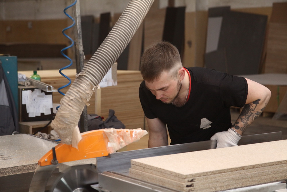 В столярном цехе трудятся в смену около 20 работников. Это, как правило, люди старше 30 лет. Они уже имеют багаж знаний и опыта, могут читать чертежи, настраивать оборудование.
