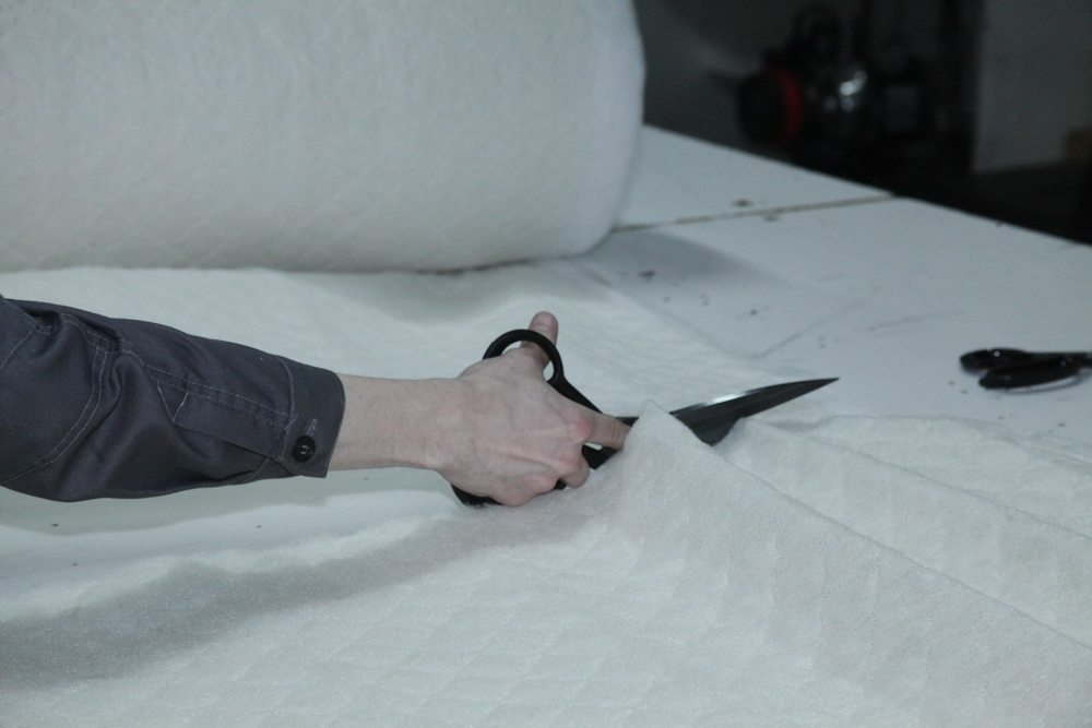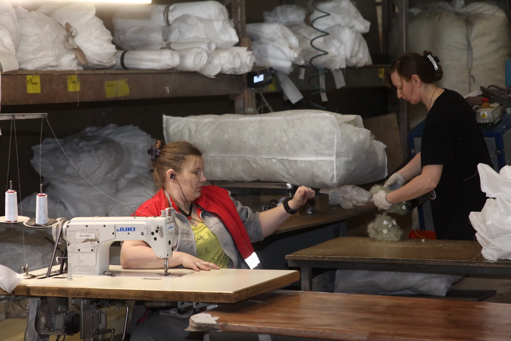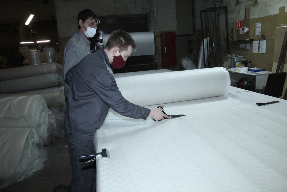 На подготовительном участке работают сотрудники от 18 до 45 лет. Женщины заняты на пошиве подушек, парни — на раскройке. Кроить — дело непростое, туда берут работников повыше ростом и сильных физически.