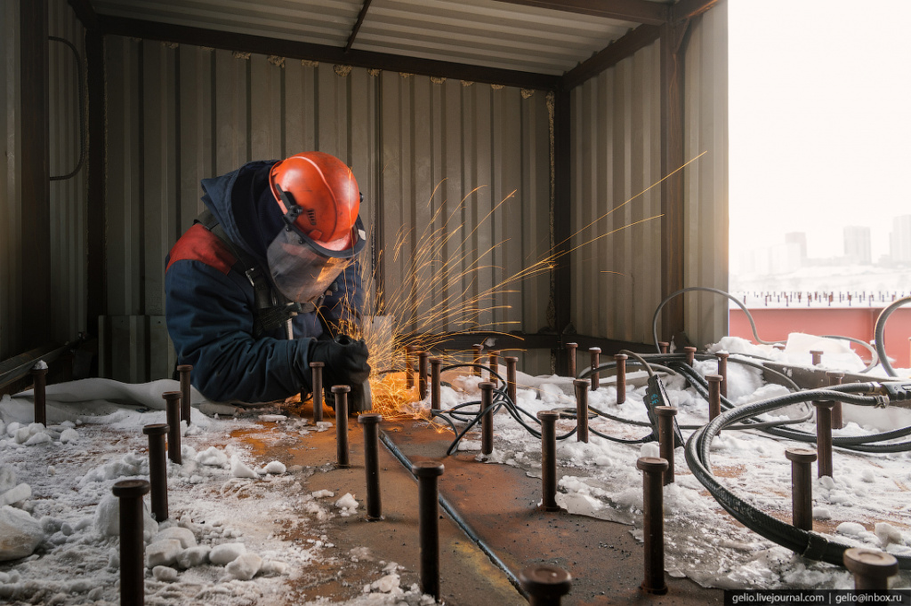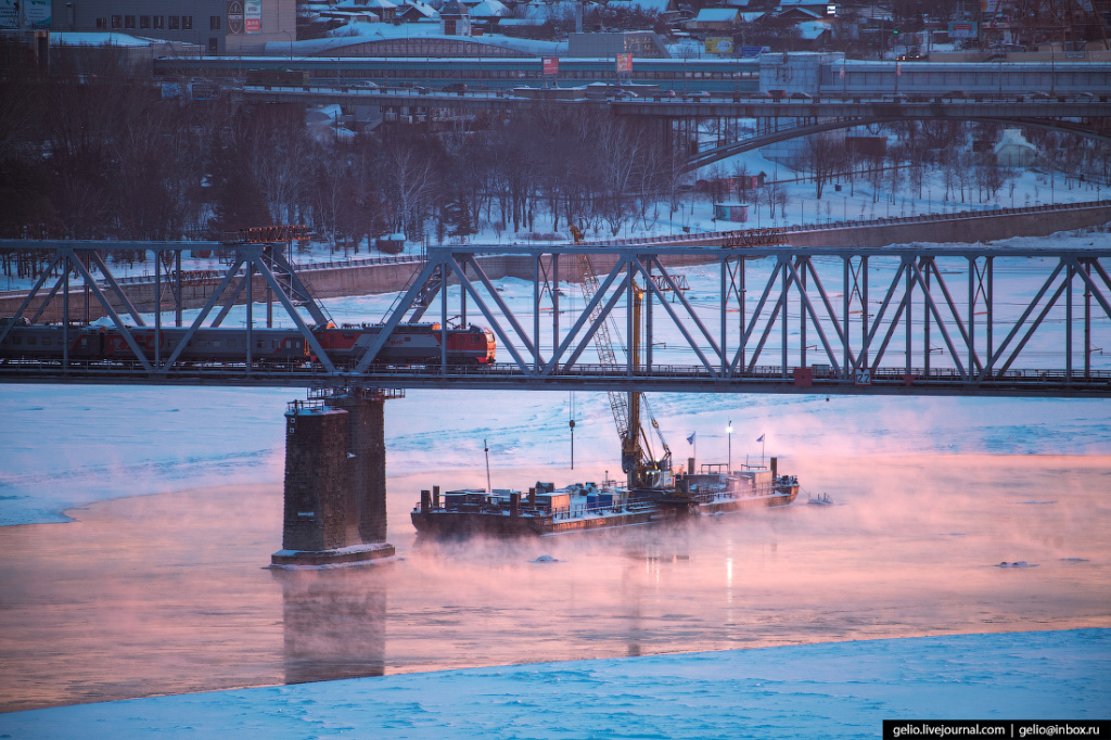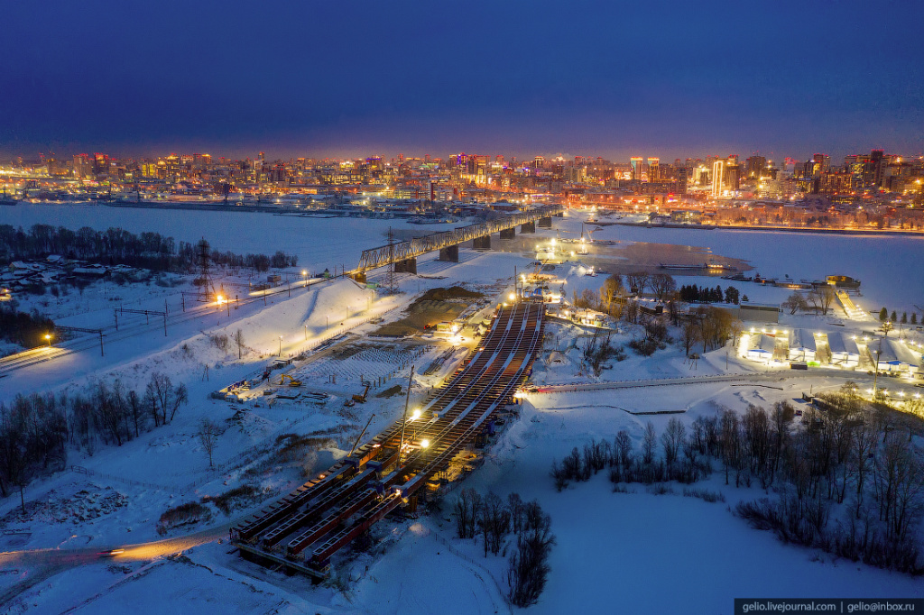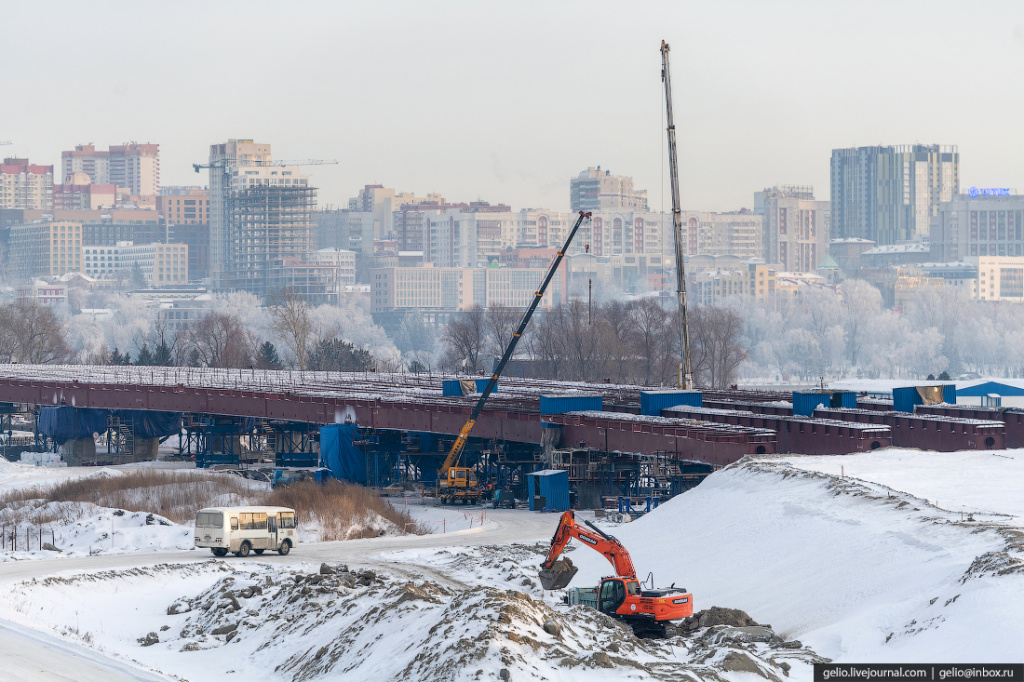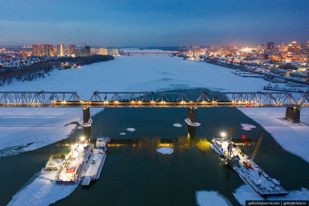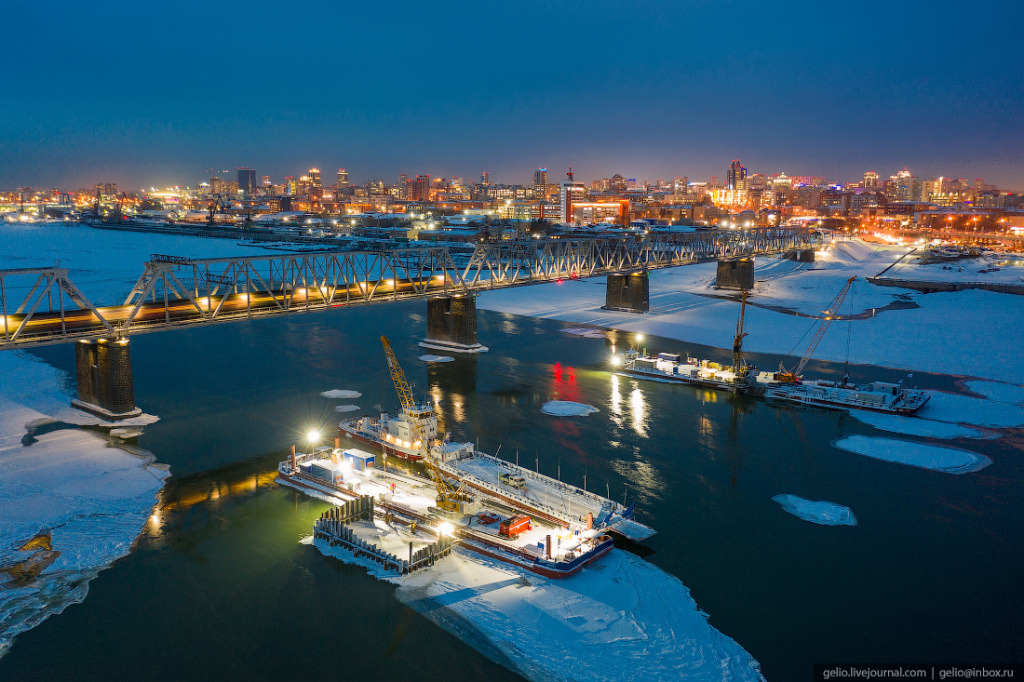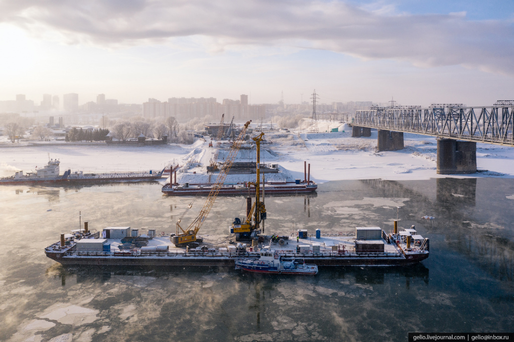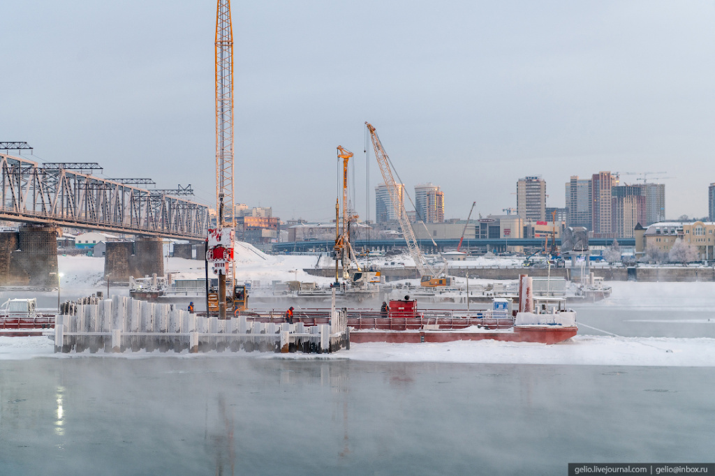 Новосибирский фотограф Слава Степанов (Gelio) в преддверии Нового года попал на площадку, где идёт строительство четвёртого моста через Обь. Смотрите, как специальный буксир ломает лёд на реке и как забивают сваи в воде.