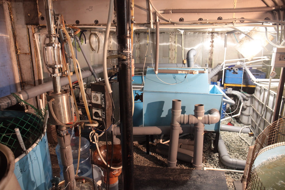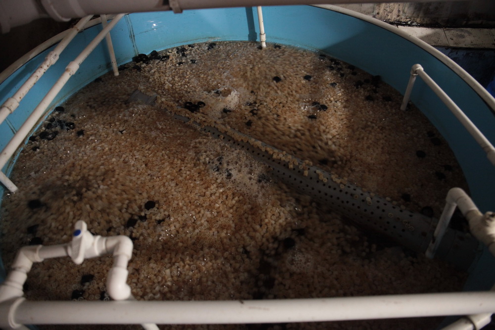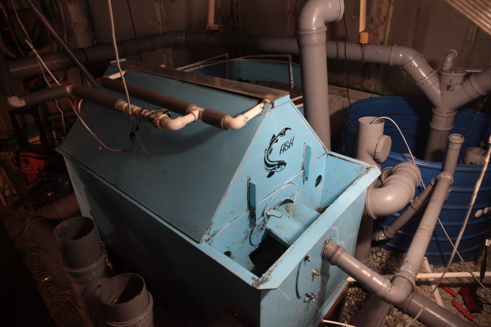 Воду для бассейнов фермер берёт из водопровода, фильтрует её, очищая от хлора. В гараже довольно шумно, потому что жидкость всё время циркулирует. Её перекачивает специальный насос. Вода идёт в бассейны, забирает всю грязь и продукты жизнедеятельности рыб и направляется в механический фильтр. Нечистоты уходят в канализацию, а вода — дальше в биофильтр, где бактерии съедают всю химию, которую производят осетры.