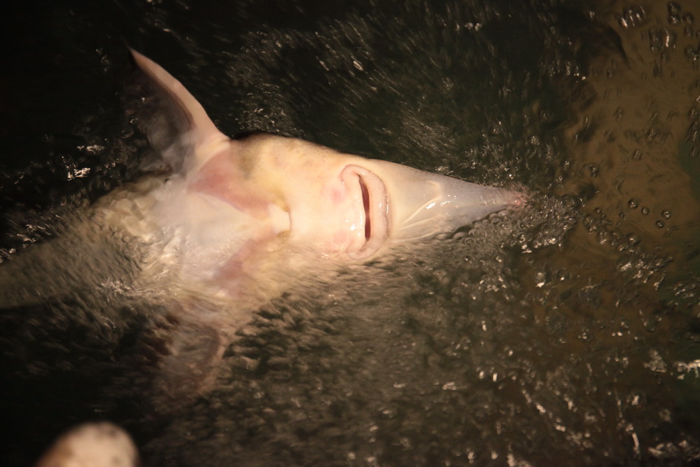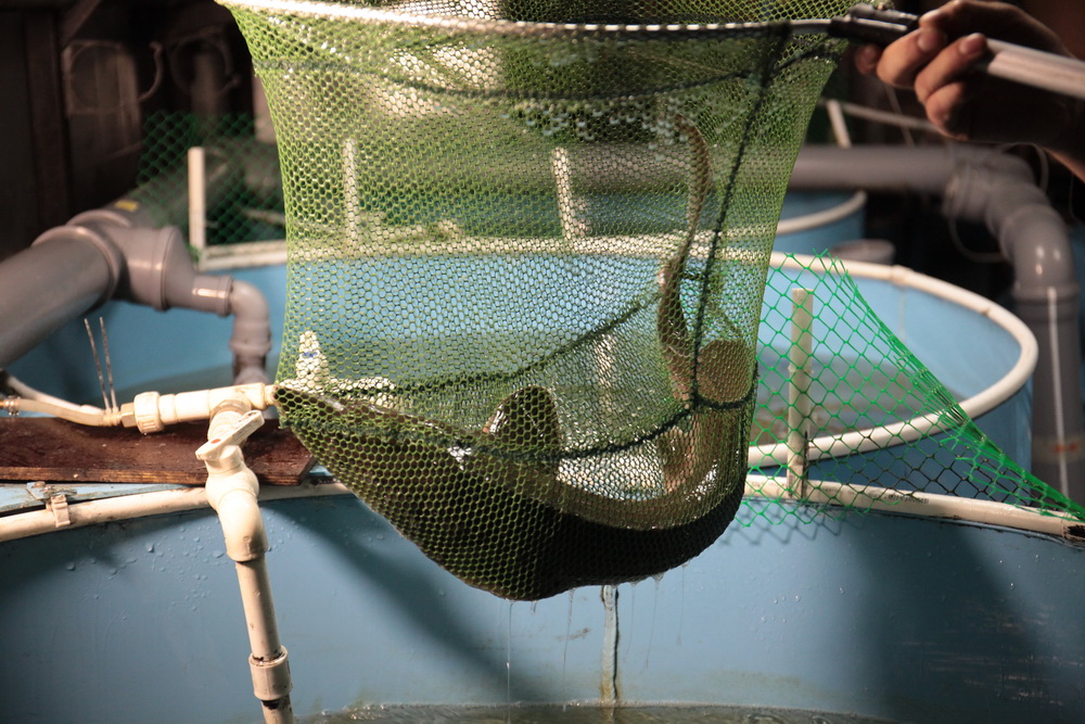 Иногда рыб бывает нужно лечить. Так, однажды заболели 50 маленьких калуг. Их пришлось высадить из бассейна в ёмкость со специальным раствором. Часть рыб погибла, но большинство выздоровели.