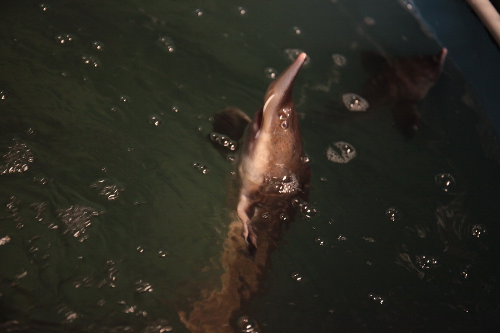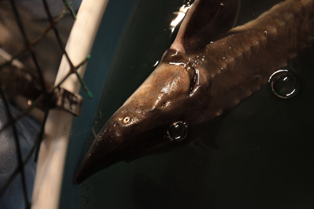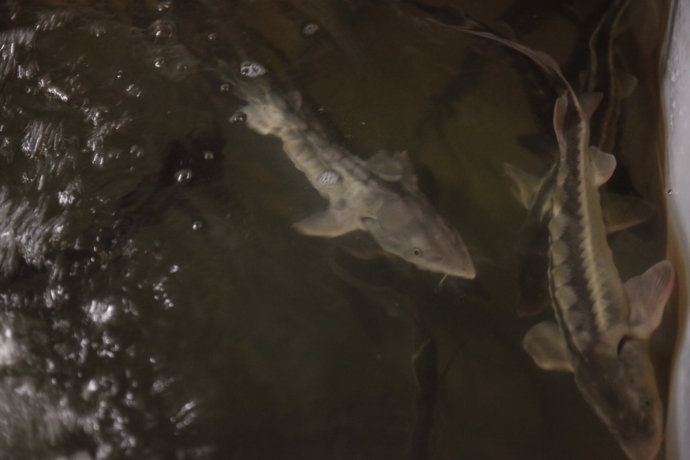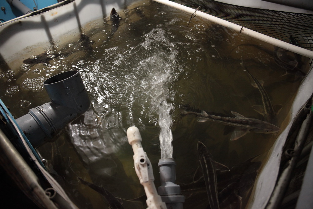 Перед продажей осетров две недели держат в специальном бассейне с чистой водой. Так они очищаются от корма.