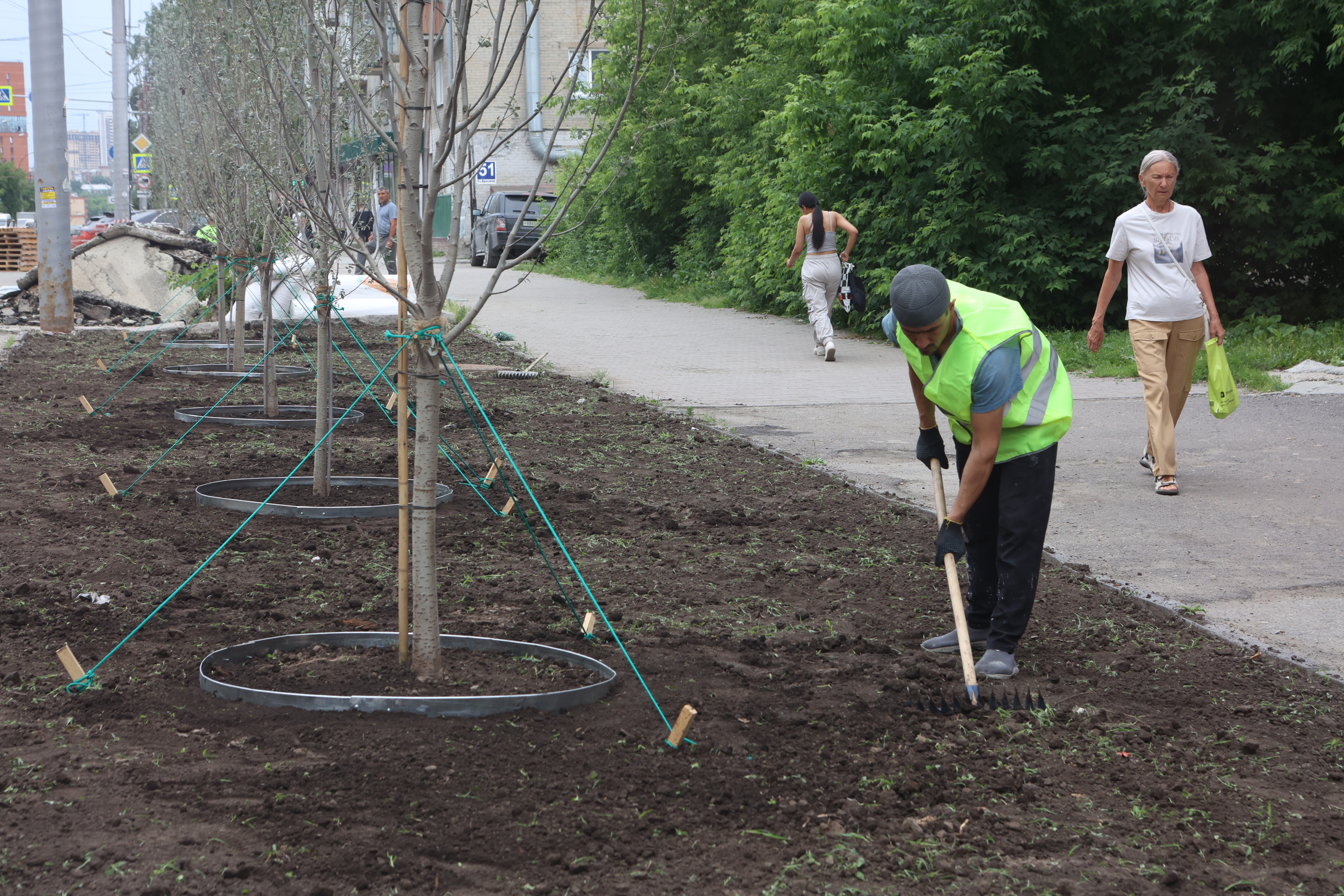 Первомайскому району на обновление газонов в этом году выделили 15 млн рублей. На них главным образом продолжили приводить в порядок озеленение улицы Эйхе. На месте запущенного участка рядом с домом №3 на Маяковского, 3 обустроили целый сквер. Его приёмка состоялась в середине июля. Тогда же наши корреспонденты стали свидетелями того, как готовят площадку под живую изгородь из дёрена у поликлиники «РЖД-Медицина».