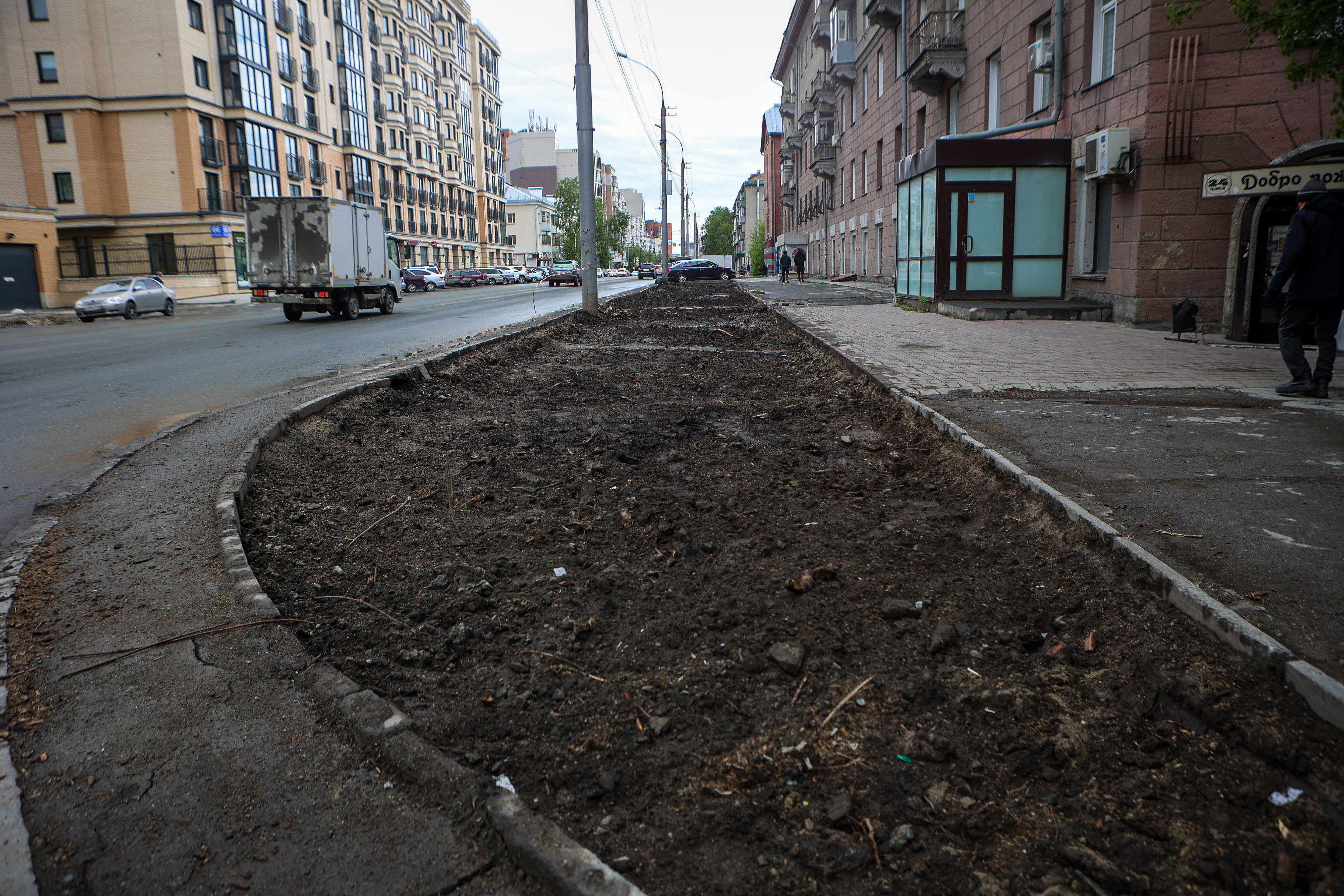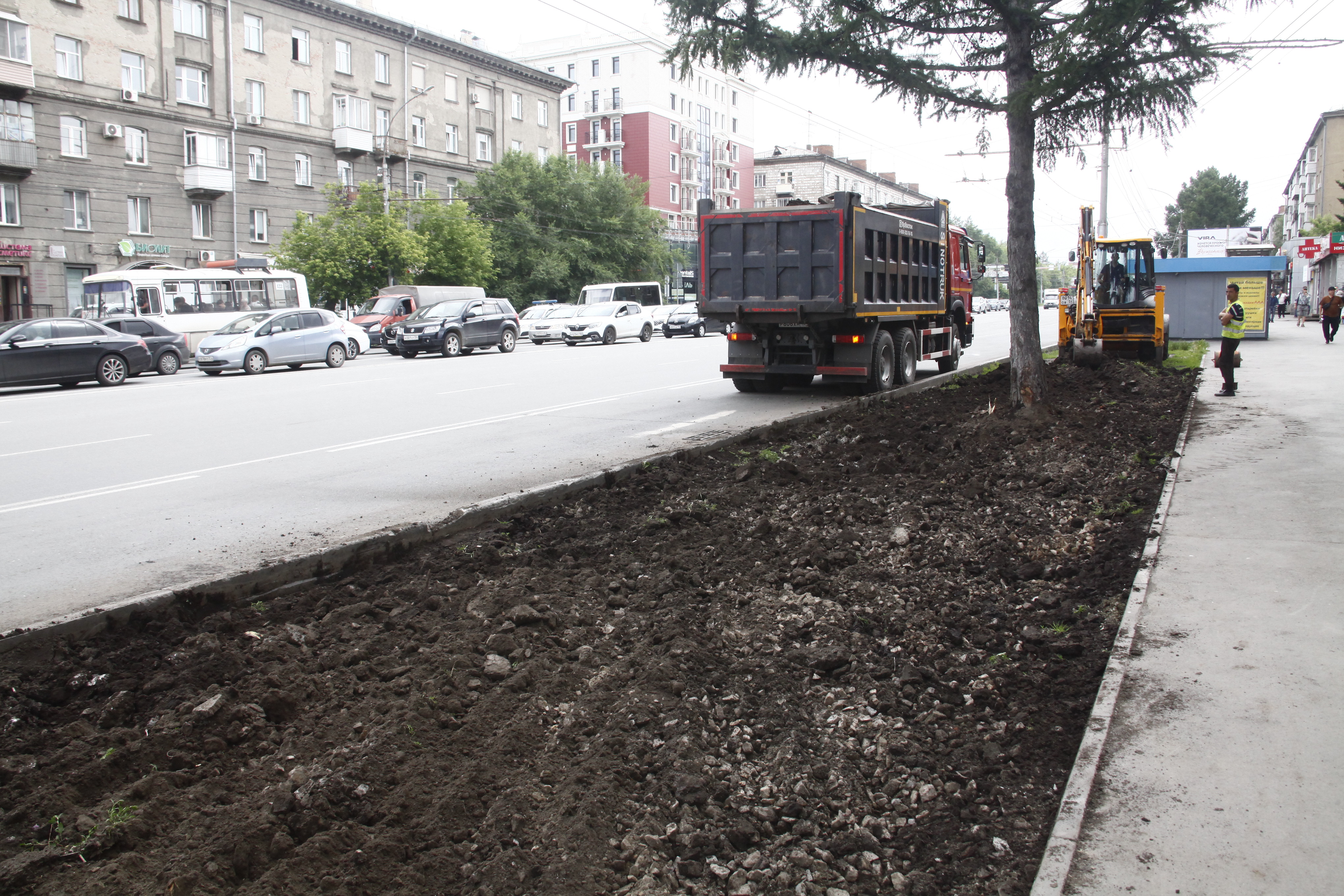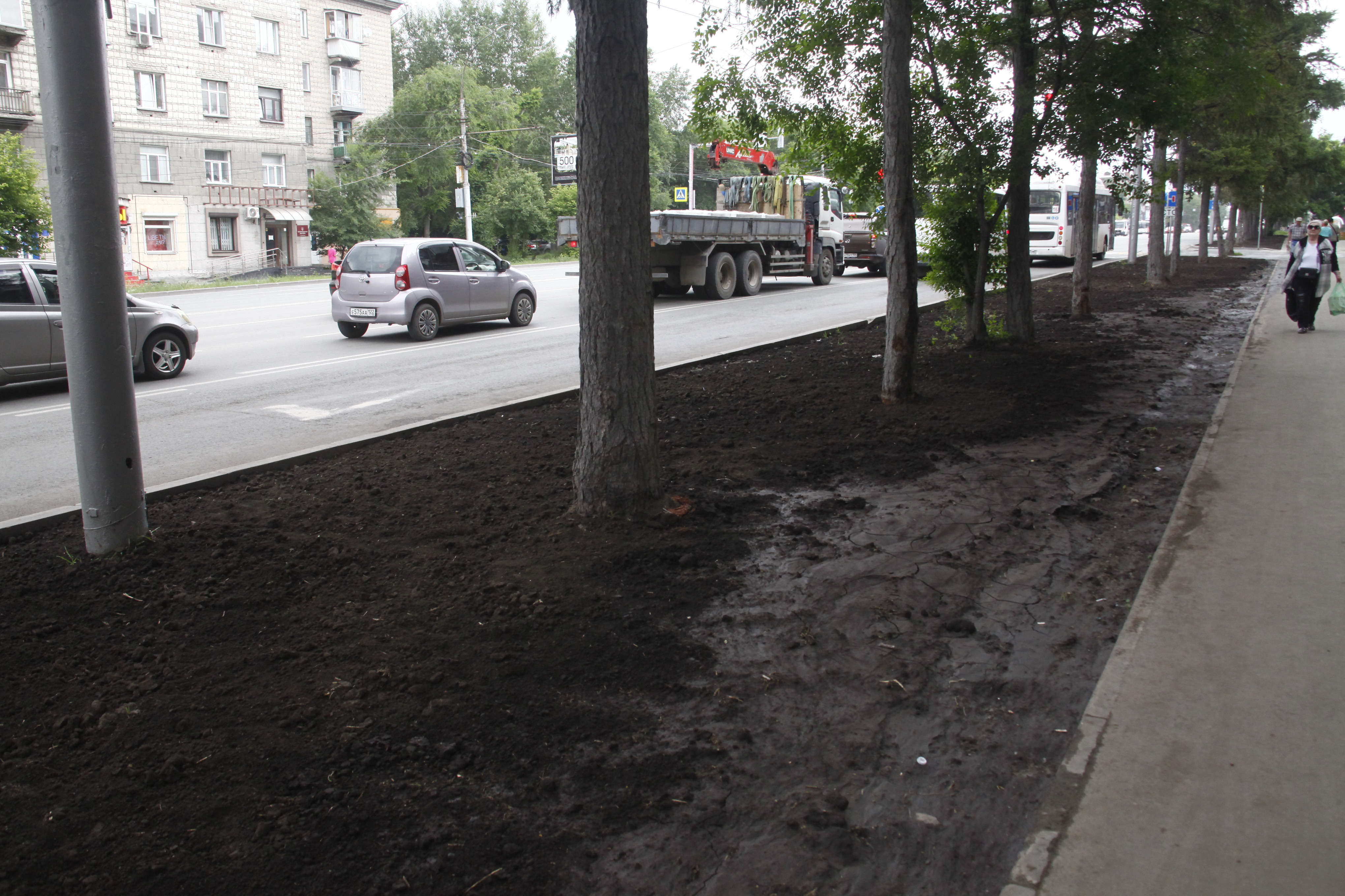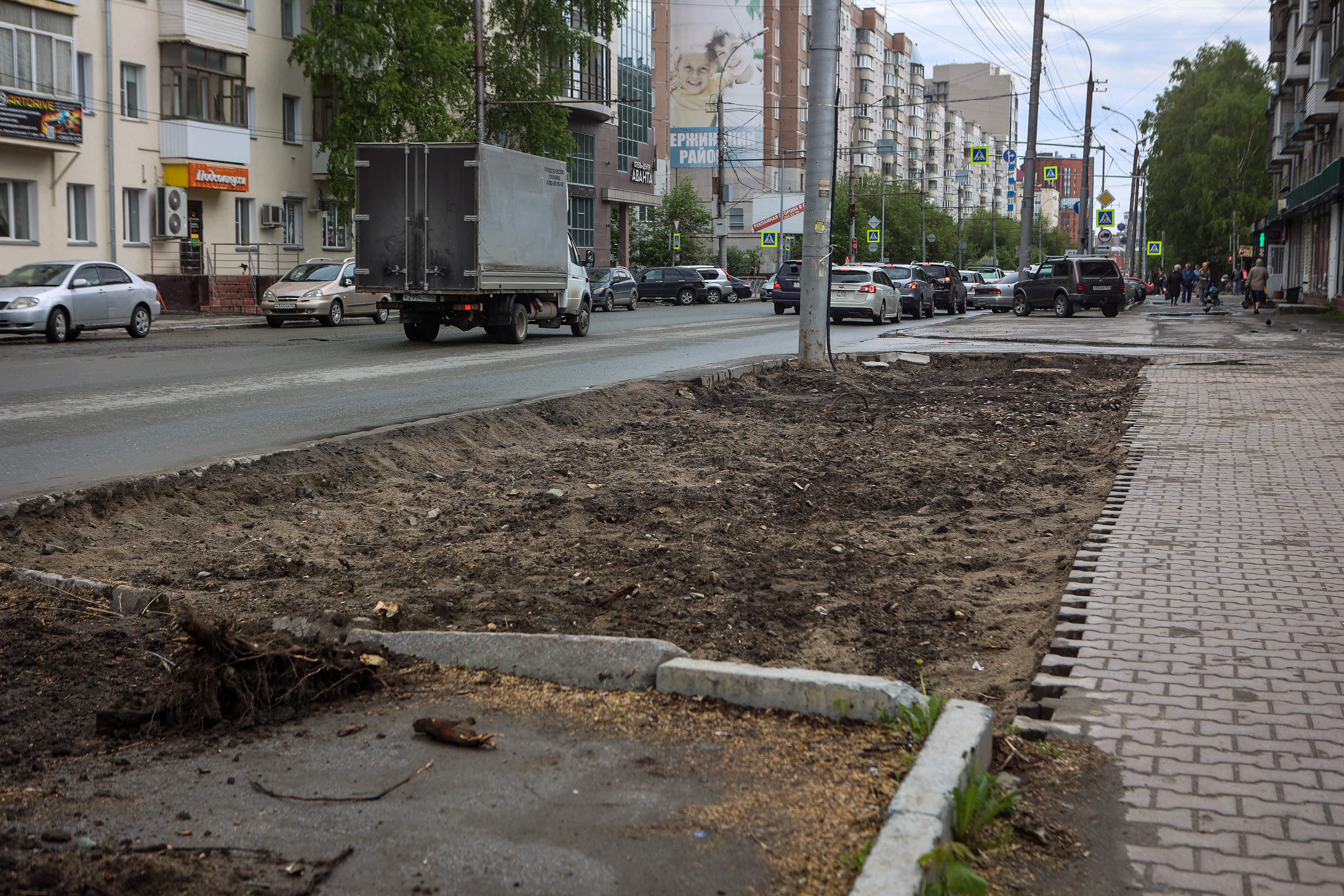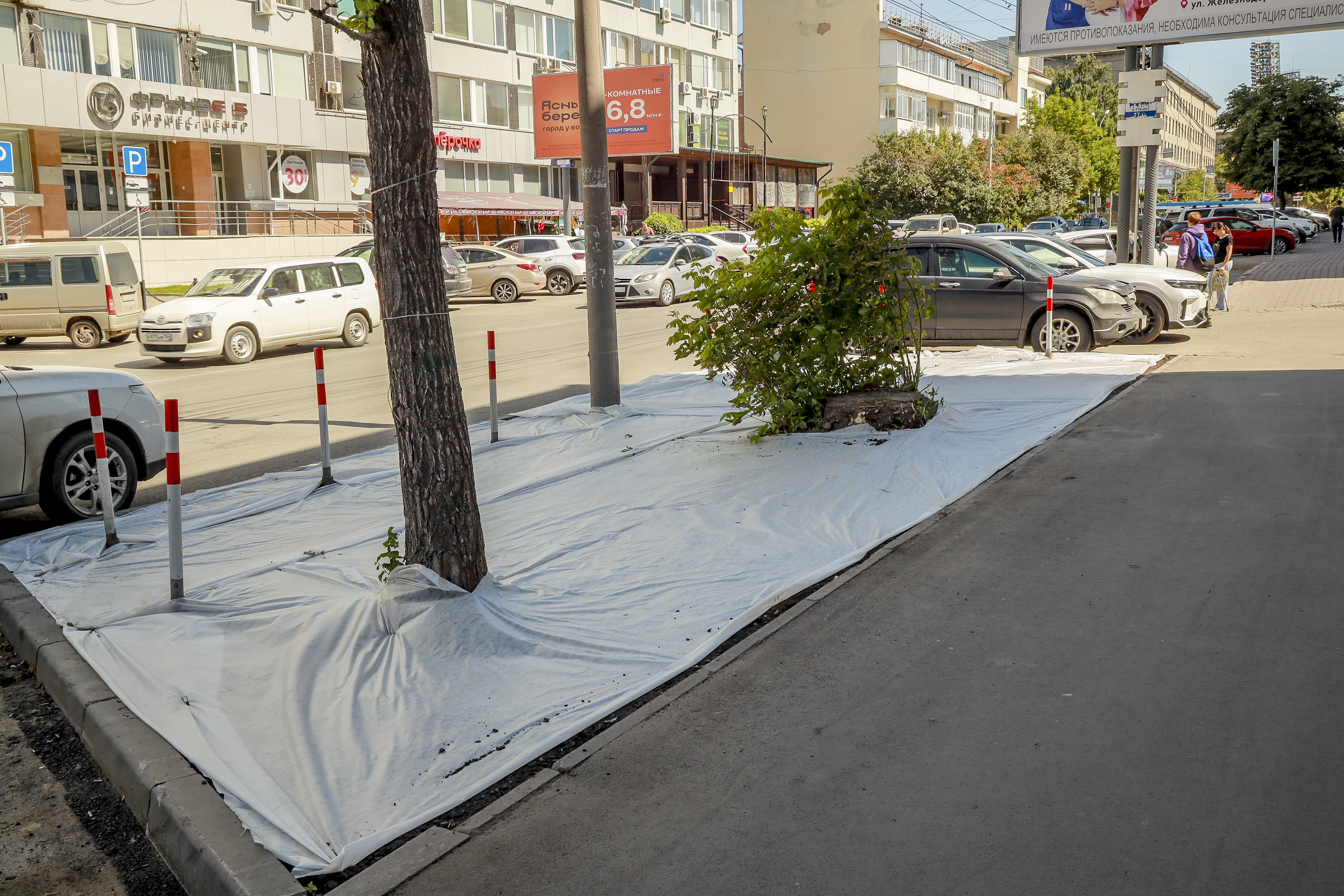 Чтобы вернуть территории презентабельный вид, подрядчики вынули истощённый дёрн, завезли чернозём, разровняли и уплотнили его — теперь поребрик на пять сантиметров выше земли, это гарантия того, что её не смоет на дорогу во время дождя и не разнесёт на колёсах по городу. Собственно, в этом и заключается главный принцип нового подхода к обустройству газонов — чтобы в городе стало меньше пыли.
