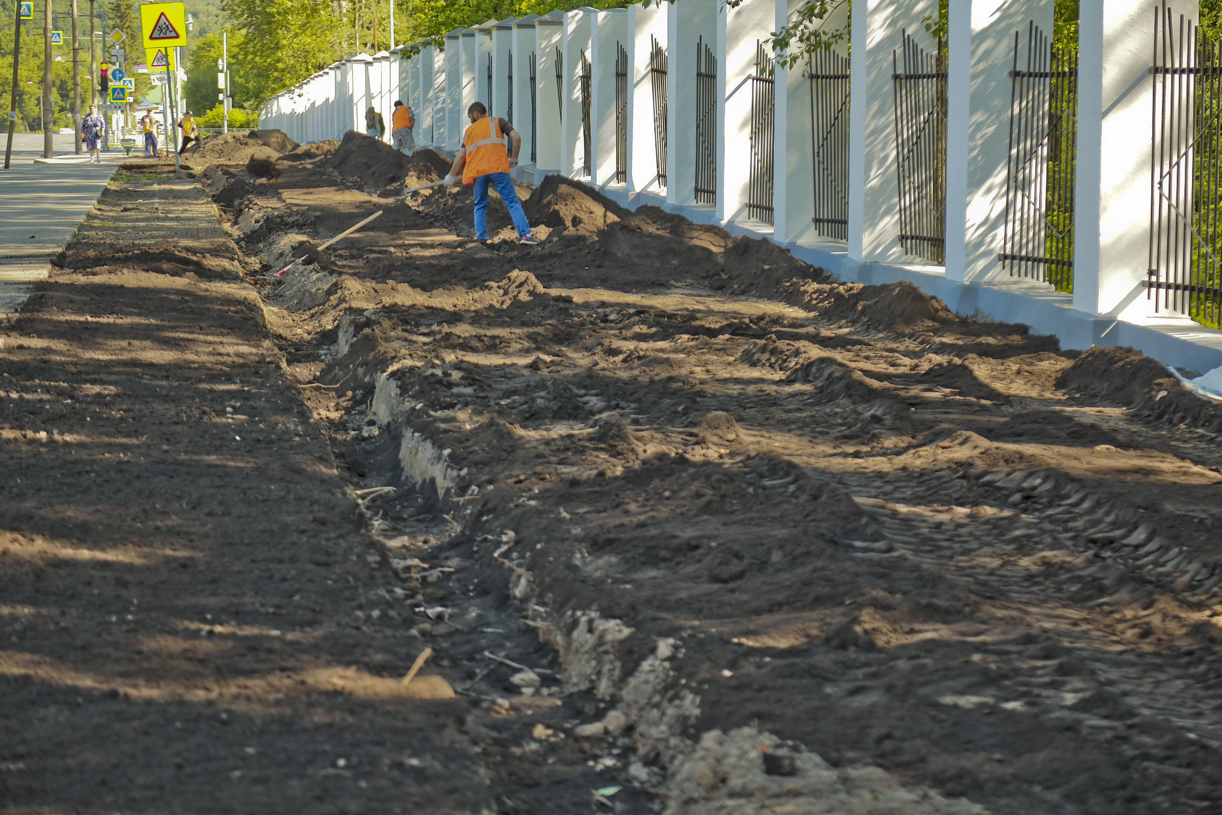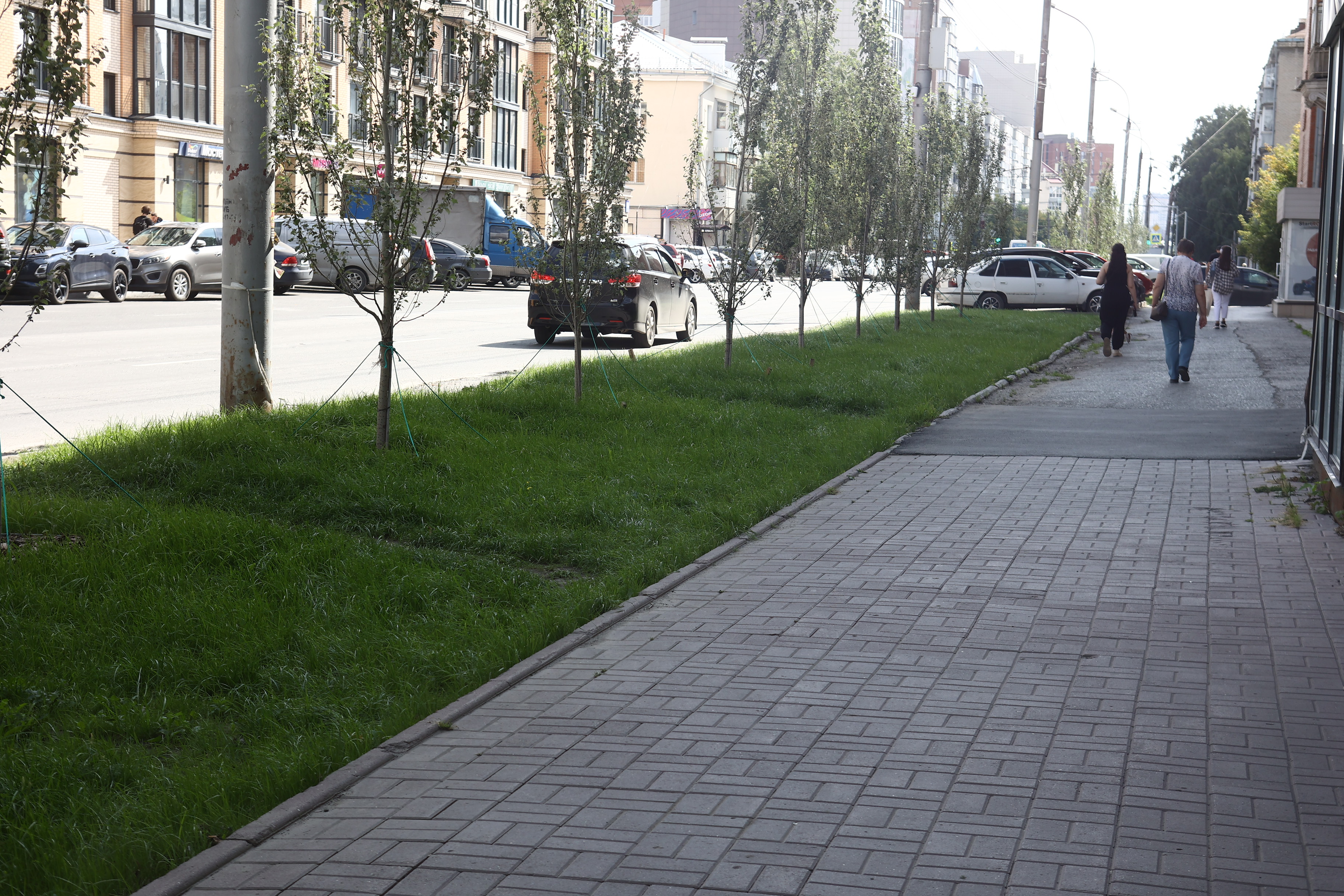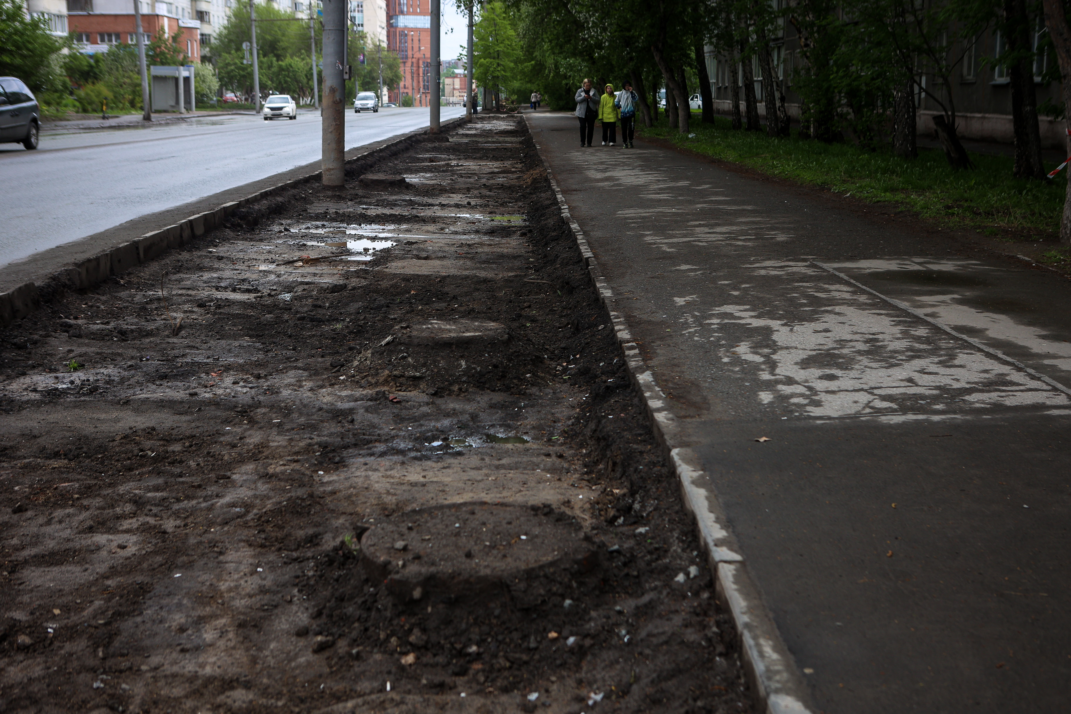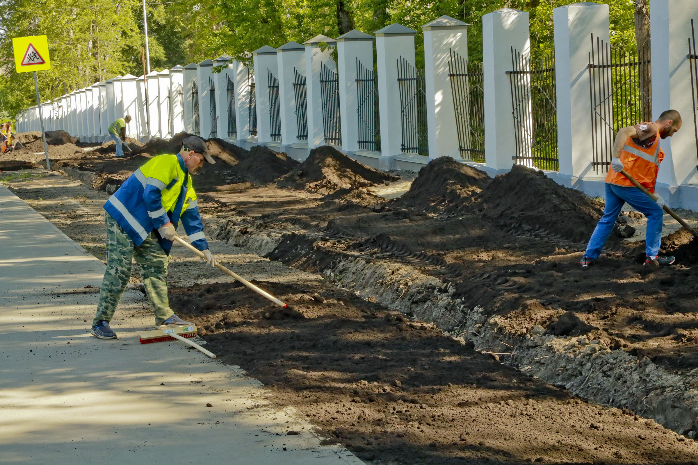 Чтобы вернуть территории презентабельный вид, подрядчики вынули истощённый дёрн, завезли чернозём, разровняли и уплотнили его — теперь поребрик на пять сантиметров выше земли, это гарантия того, что её не смоет на дорогу во время дождя и не разнесёт на колёсах по городу. Собственно, в этом и заключается главный принцип нового подхода к обустройству газонов — чтобы в городе стало меньше пыли.