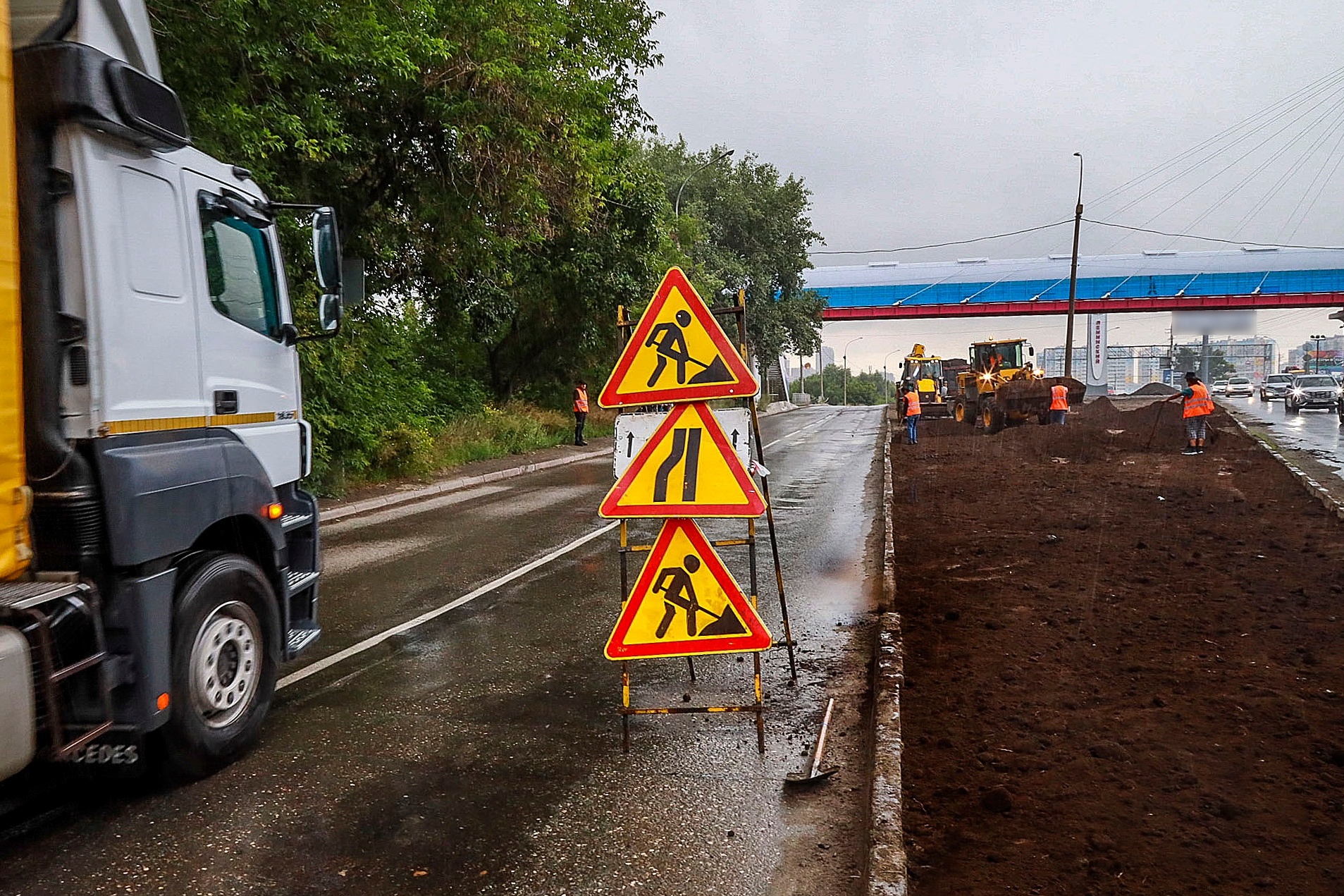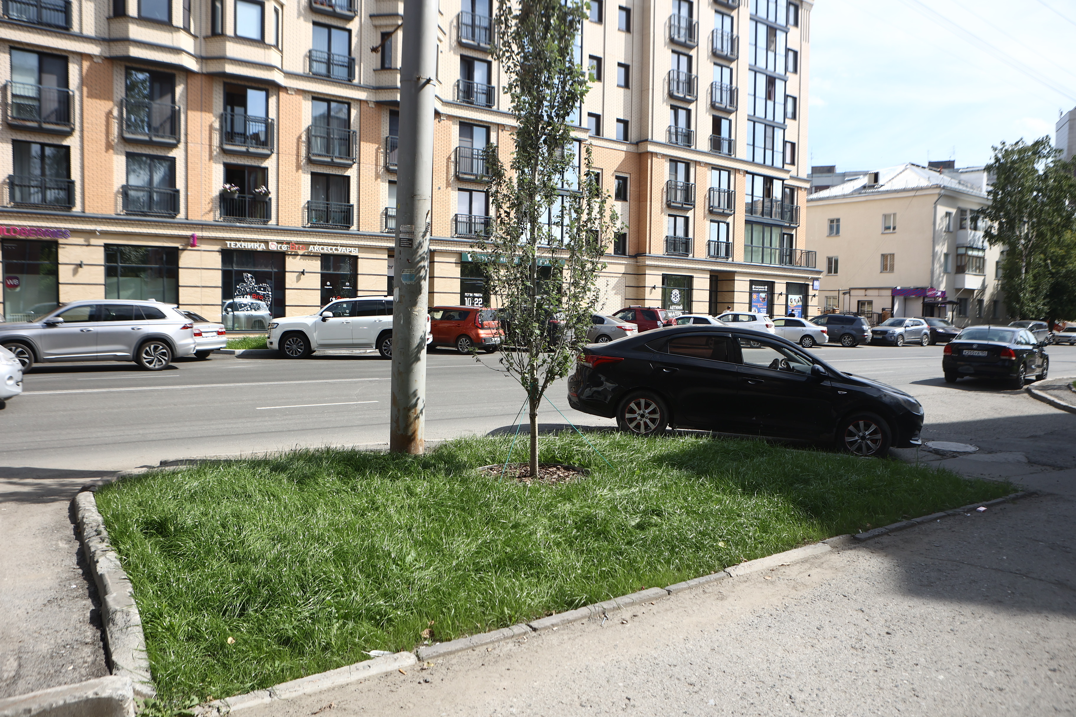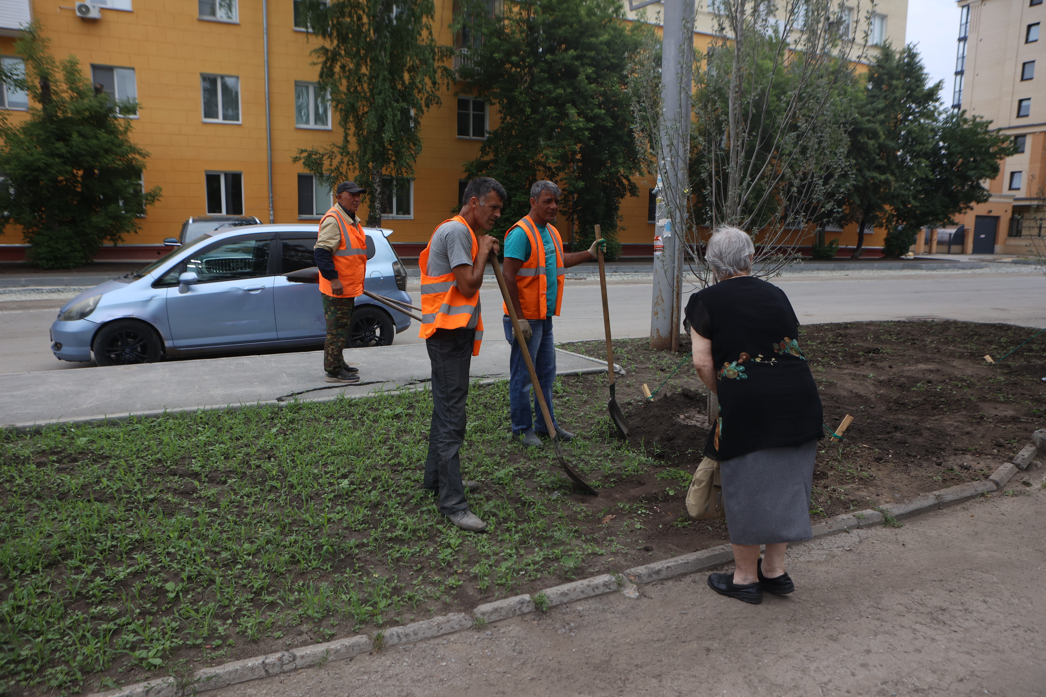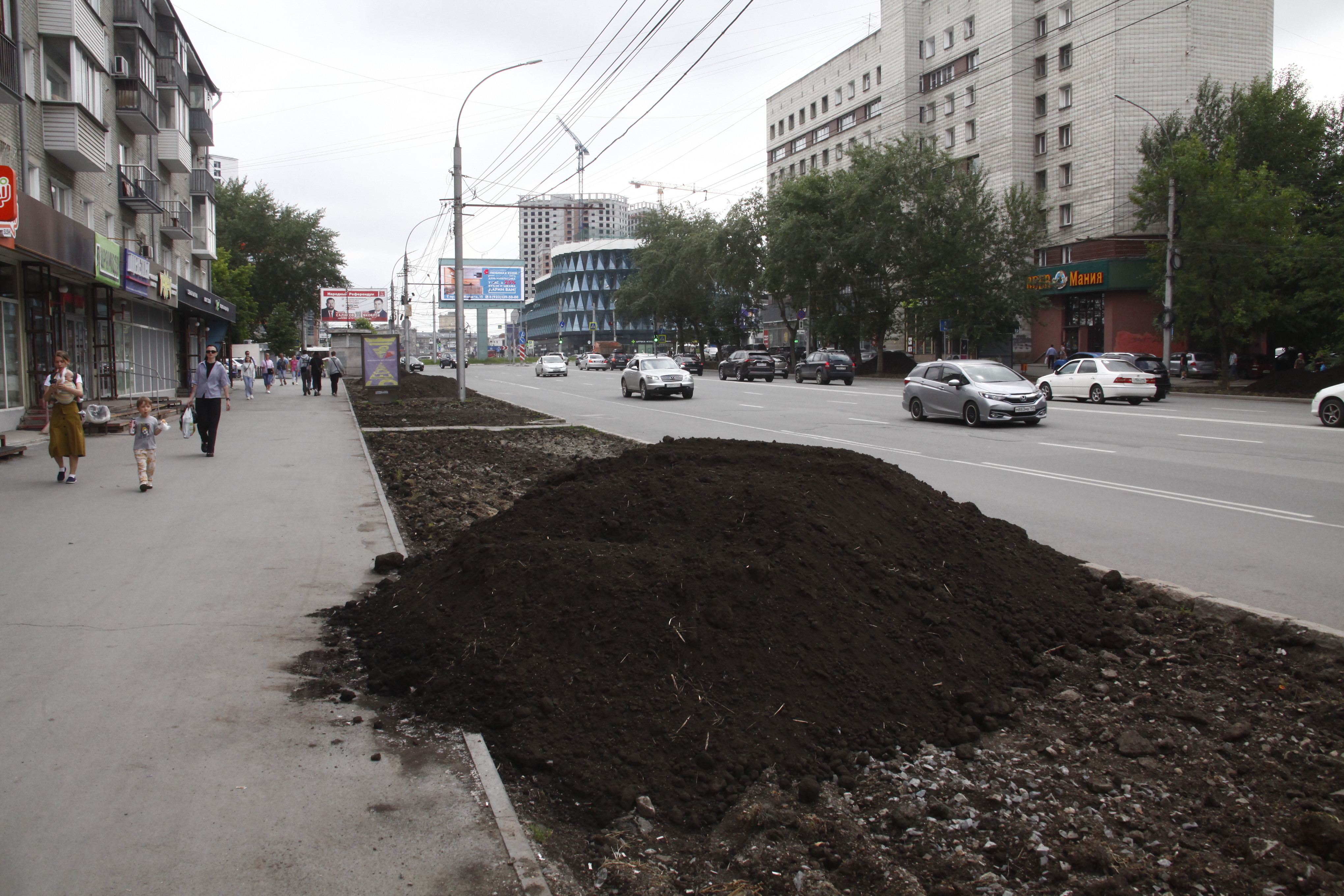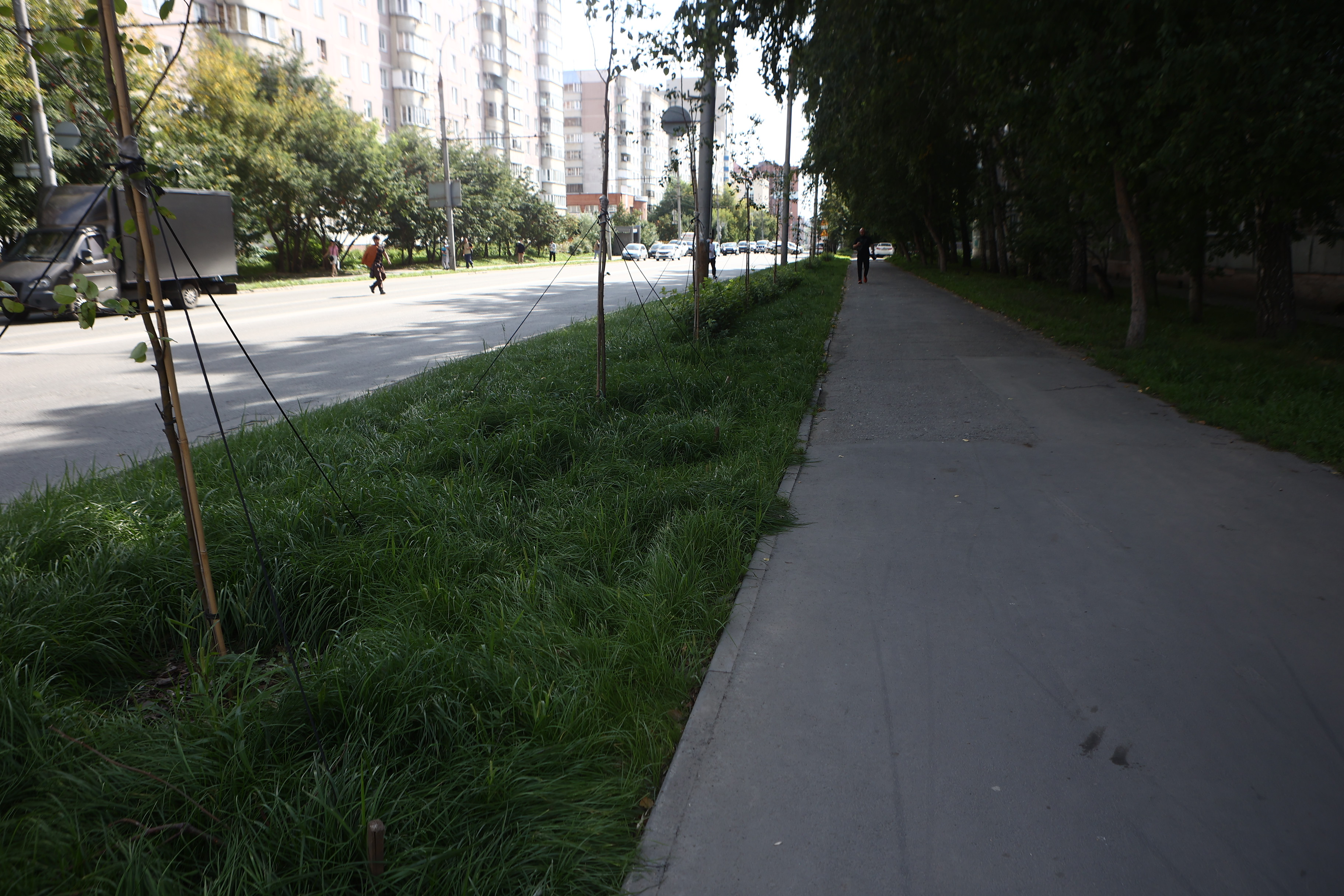 Чтобы вернуть территории презентабельный вид, подрядчики вынули истощённый дёрн, завезли чернозём, разровняли и уплотнили его — теперь поребрик на пять сантиметров выше земли, это гарантия того, что её не смоет на дорогу во время дождя и не разнесёт на колёсах по городу. Собственно, в этом и заключается главный принцип нового подхода к обустройству газонов — чтобы в городе стало меньше пыли.