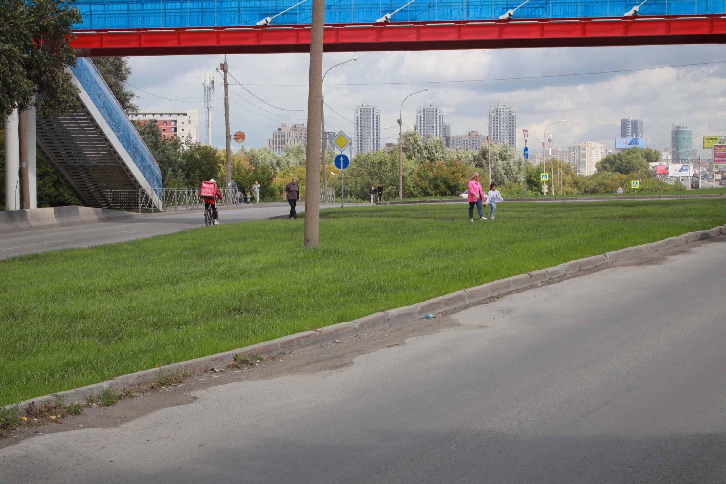 В начале июля «Новосибирские новости» снимали процесс замены грунта на этом участке. Сейчас здесь весело колышется трава, выращенная из сертифицированных семян. Хотя, к сожалению, уже местами и потоптанная.