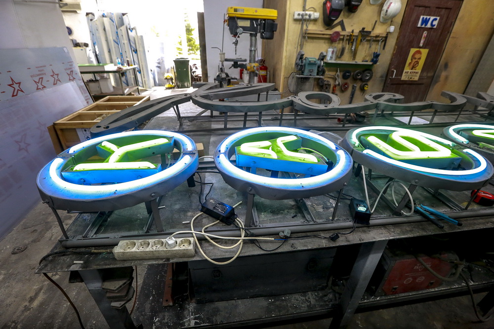 Металлическую конструкцию очистили от краски пескоструйным методом. Сейчас готовые неоновые трубки «сажают» на место, монтируют всю электрику. На следующем этапе буквы сварят, выровняют в плоскости, покрасят в тёмно-синий цвет. После того как краска высохнет, трубки зафиксируют — и они поедут на монтаж. Устанавливать вывеску на фасад дома планируют в августе, как раз пройдёт год с момента её демонтажа.