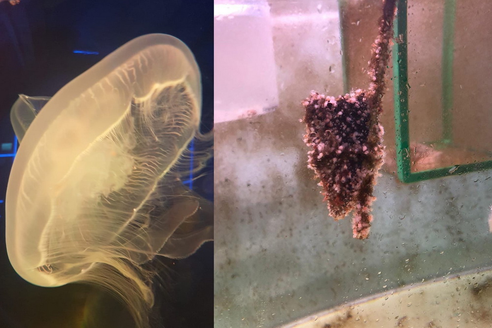 Мать-медуза (слева), полип, из которого вылупляются медузки (справа). Фото: «Дельфиния»