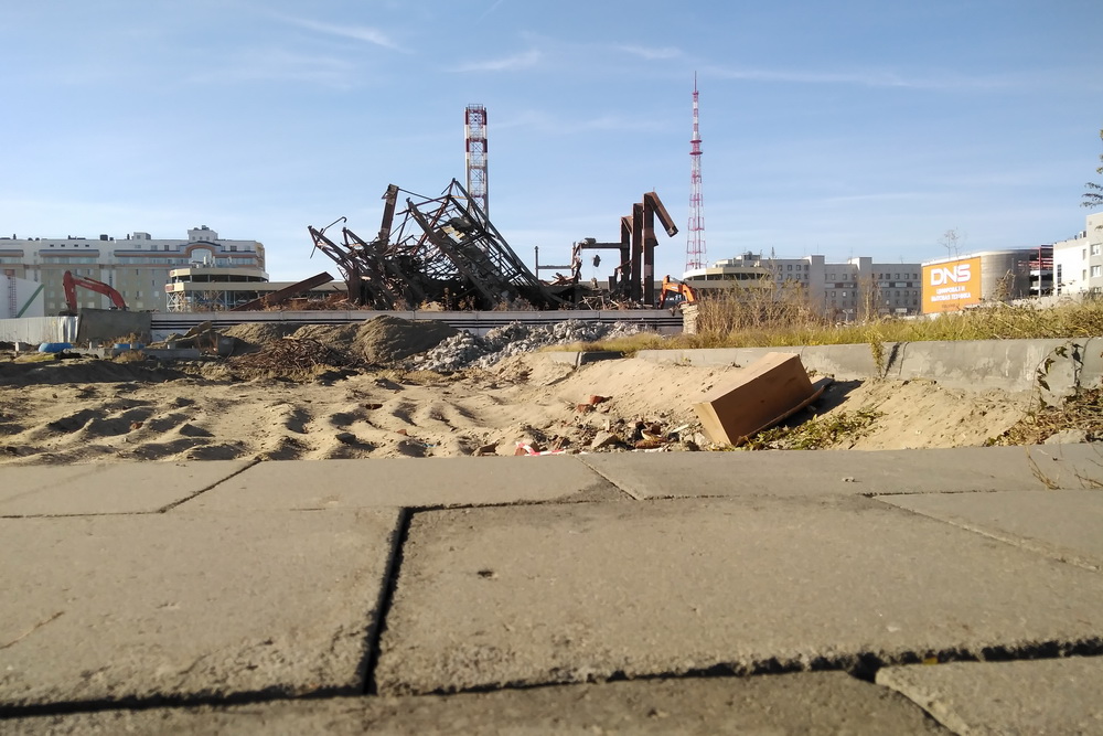 Ломать 43-летний долгострой на площади Маркса начали в середине июля. К ноябрю техника дошла до подземного этажа. Самым эпичным моментом сноса стало обрушение стального каркаса здания. Вечером 14 октября он не выдержал веса железобетонных перекрытий и со страшным скрежетом и грохотом рухнул на землю, накрыв облаком строительной пыли всю площадь.