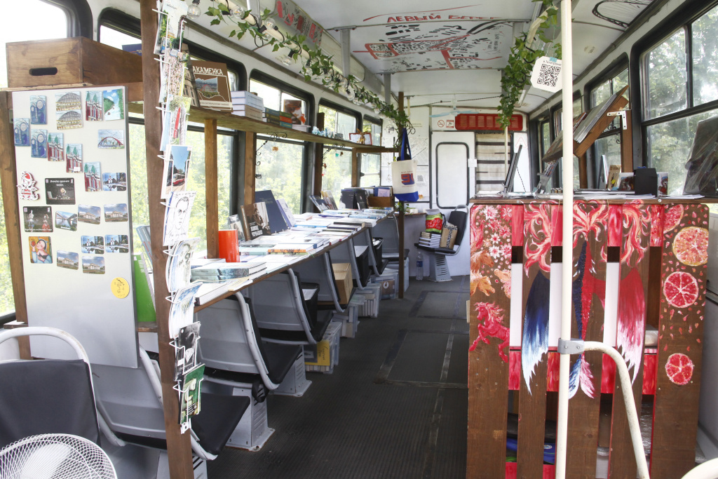 — Мы долго думали, как обычный вагон превратить в книжную площадку. Нам не хотелось терять аутентичность, ведь 13-й трамвай сам по себе является неким городским символом. Поэтому была задача организовать пространство с минимальными изменениями — так появились прилавки над креслами.