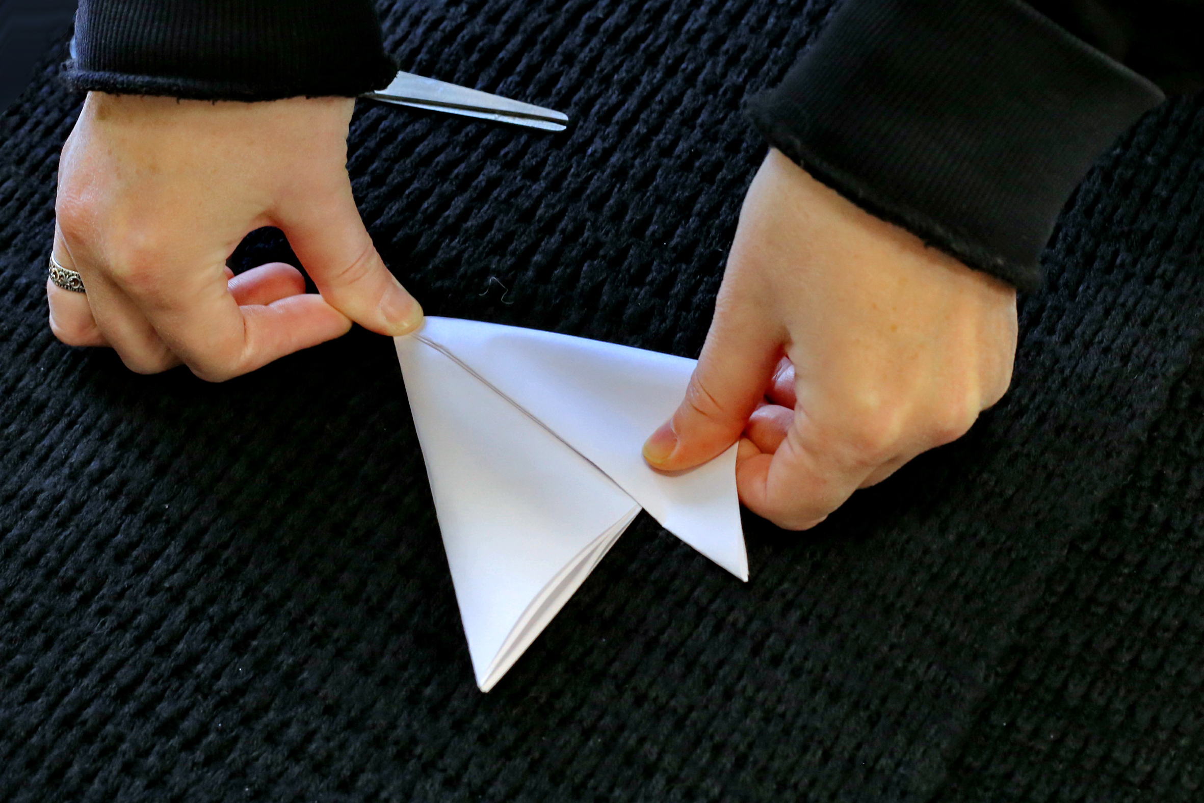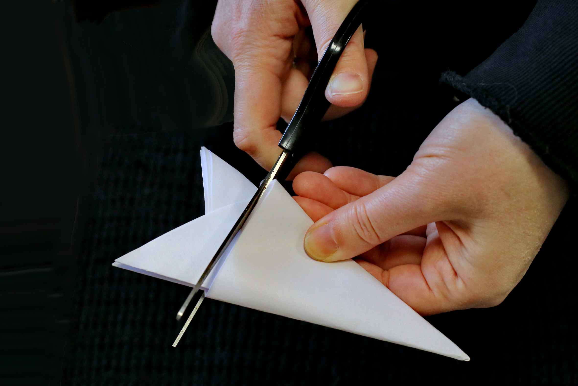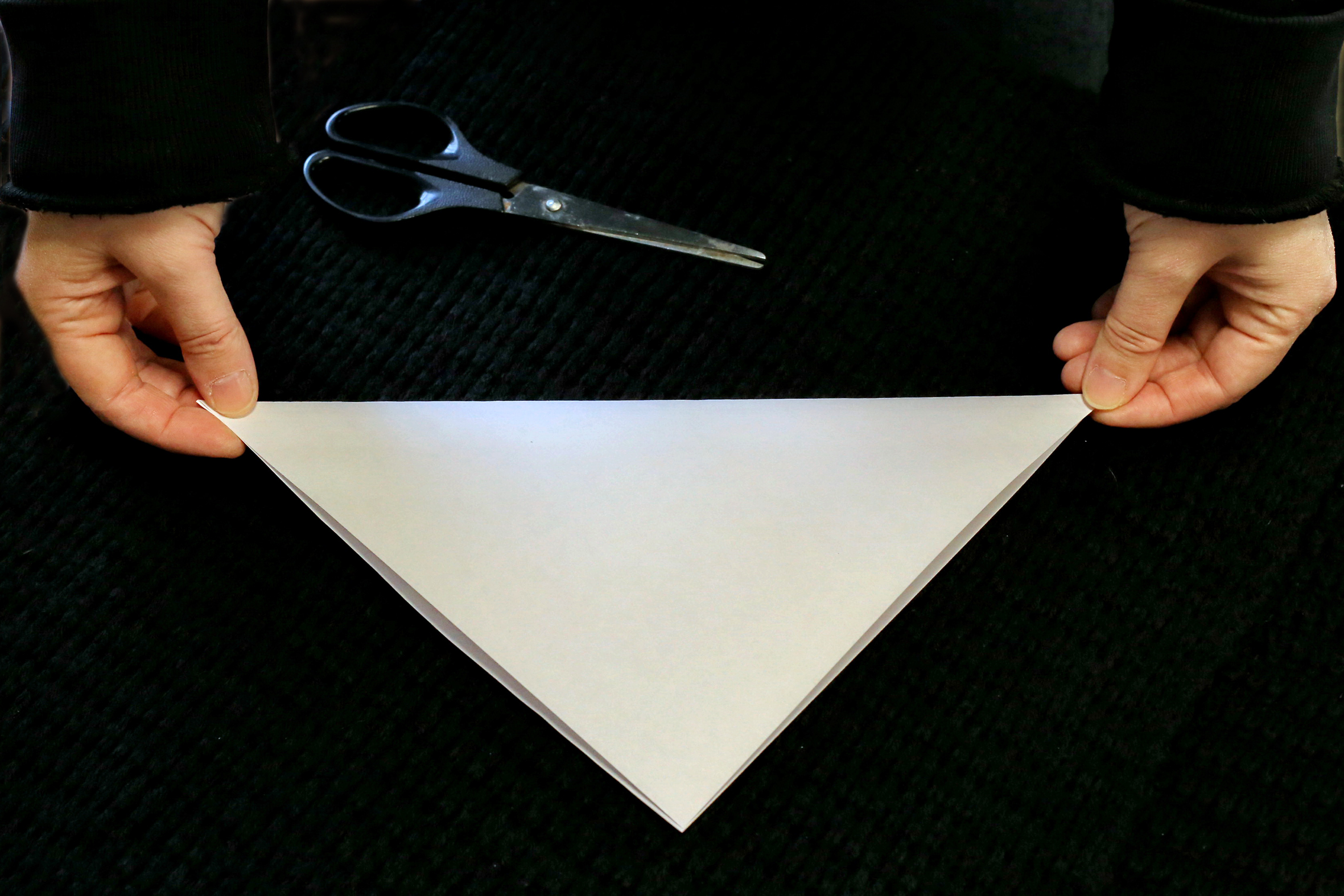 Сложили трёхчастный треугольник — берём ножницы и вырезаем снежинку.