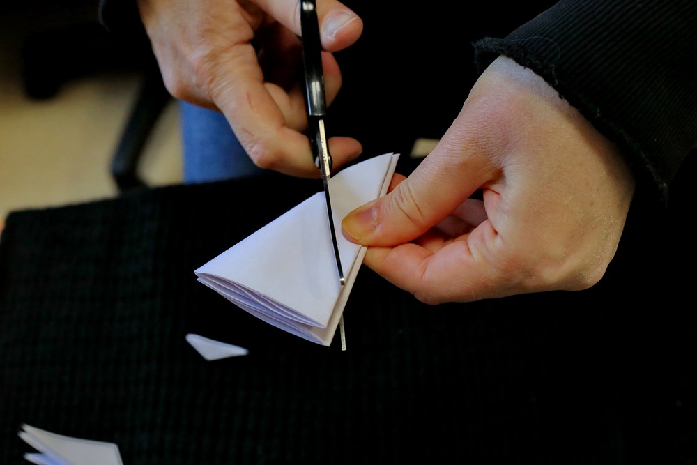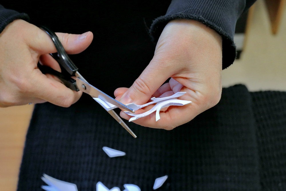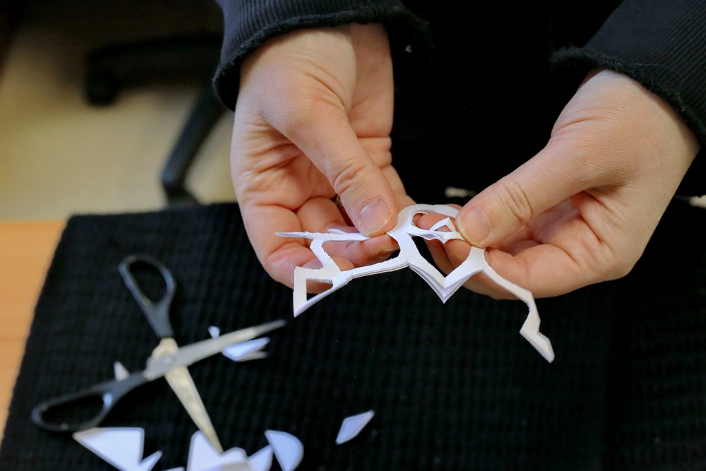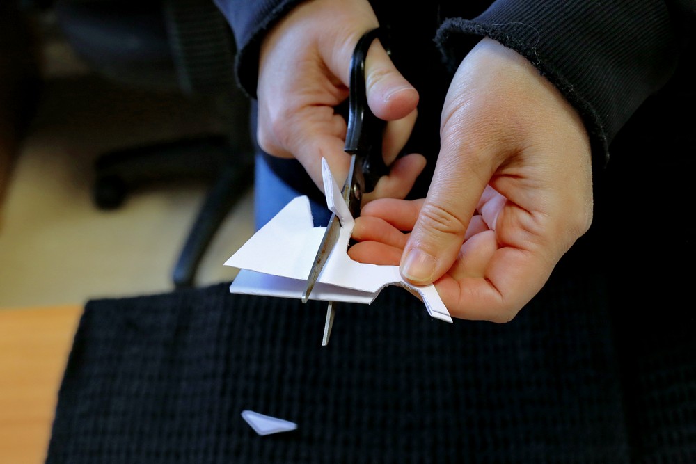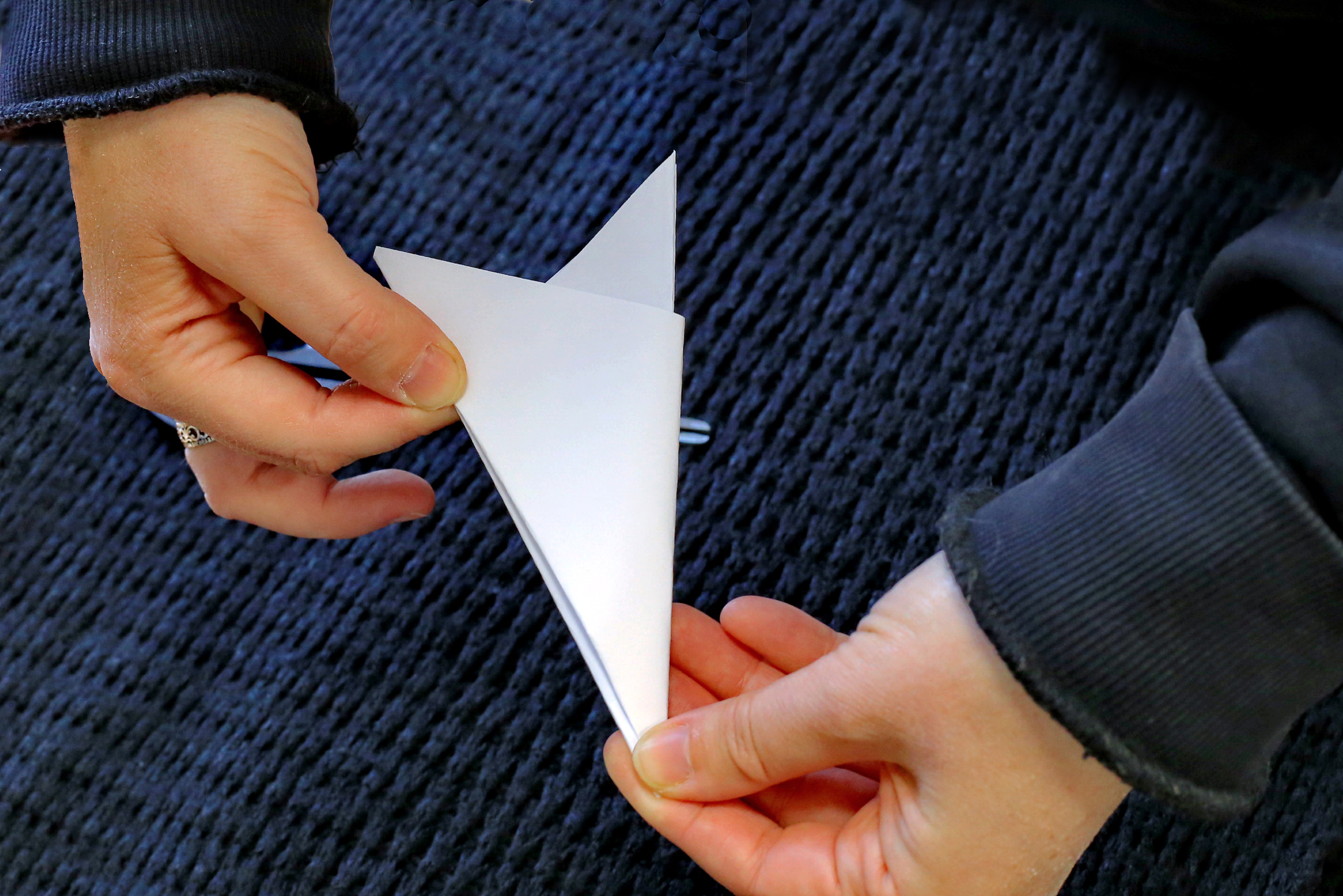 Сложили трёхчастный треугольник — берём ножницы и вырезаем снежинку.