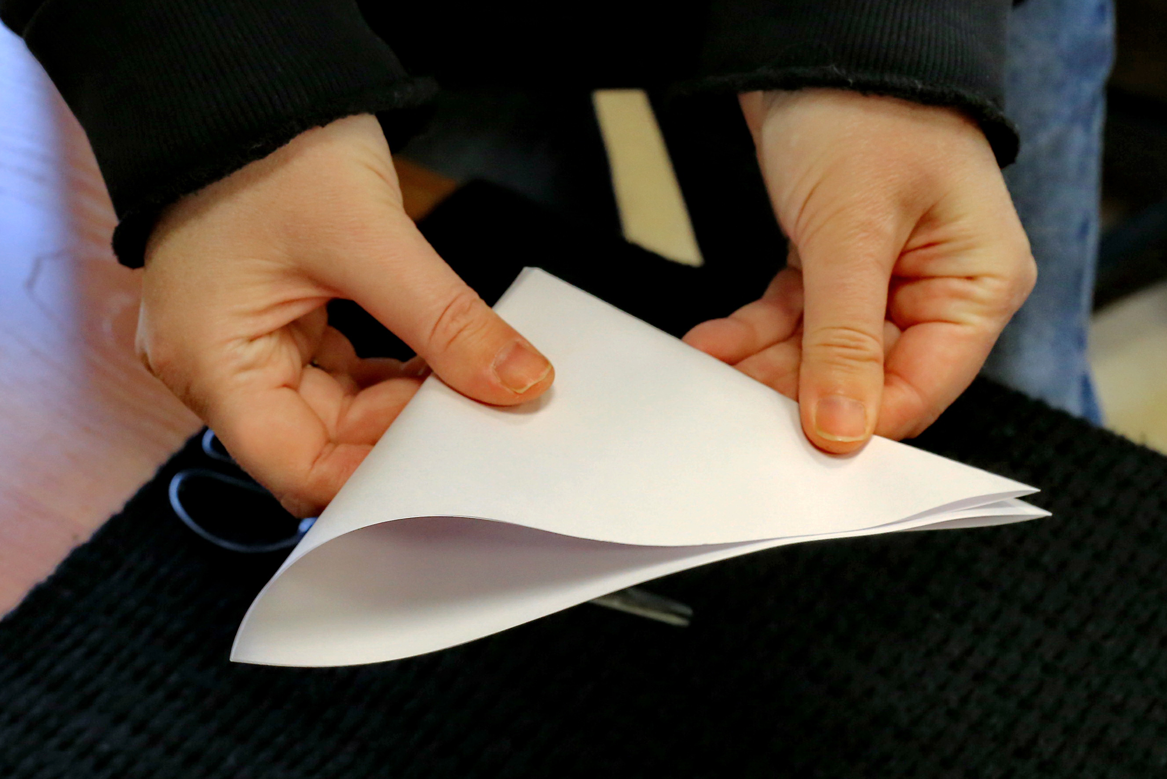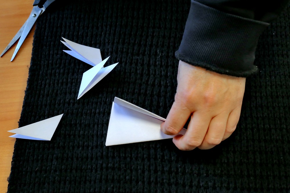 Напомним, что у настоящей снежинки, которая во время снегопада упадёт вам на шарф или варежку и которую вы как следует рассмотрите, всегда будет шесть лучиков. Не бывает снежинок другой формы. Так устроен кристалл воды. Поэтому, чтобы вырезать настоящую снежинку с шестью лучиками, нужно правильно сложить лист бумаги.