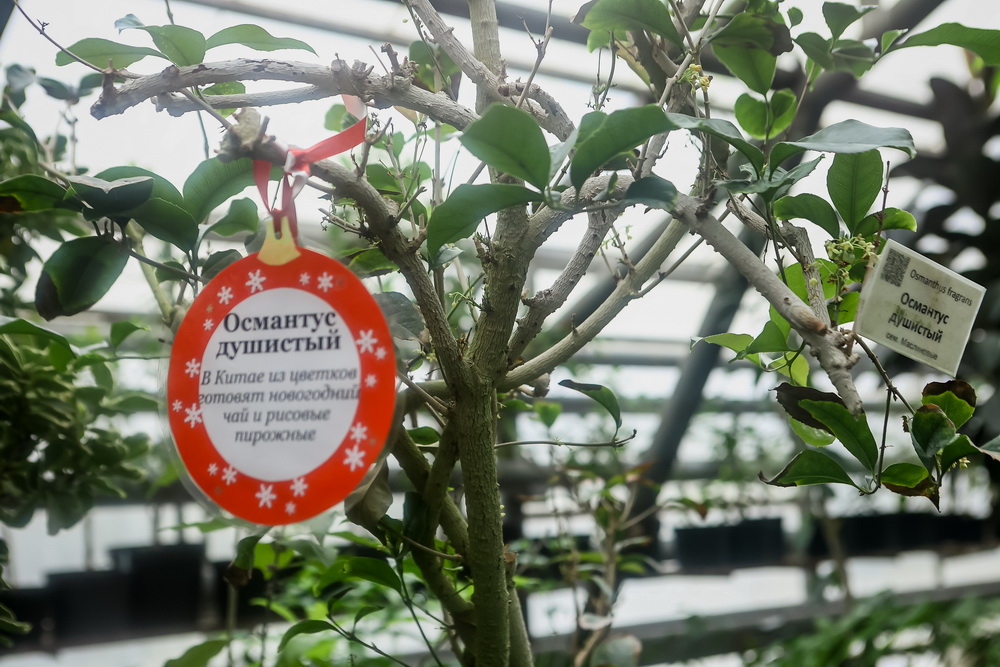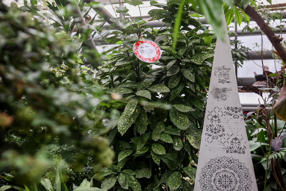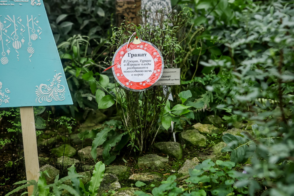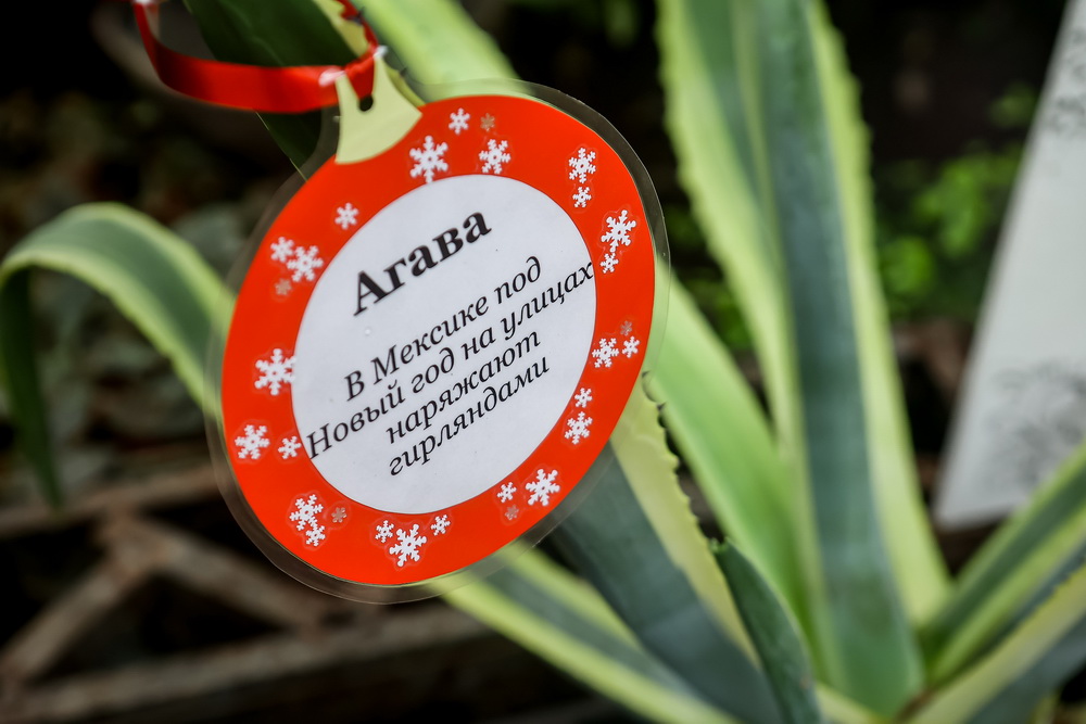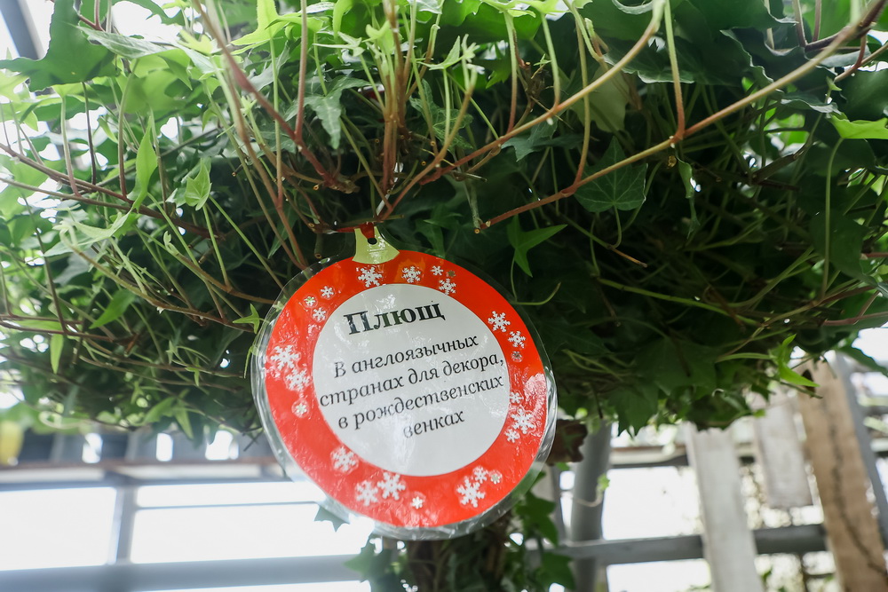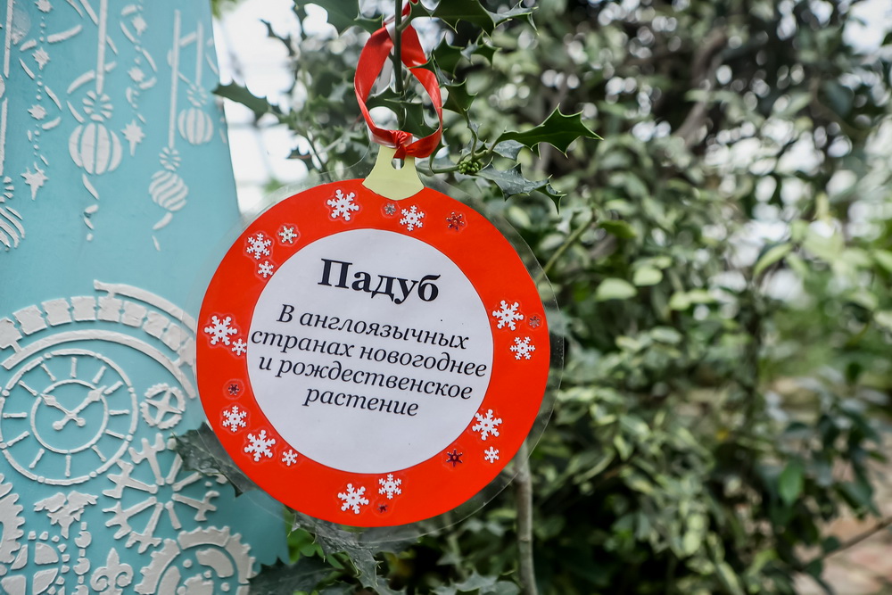Посетителей зимнего сада яркой зеленью встречает тропическая и субтропическая флора. Некоторые из её представителей украшены специальными табличками — они сообщают, что перед нами новогоднее растение.
