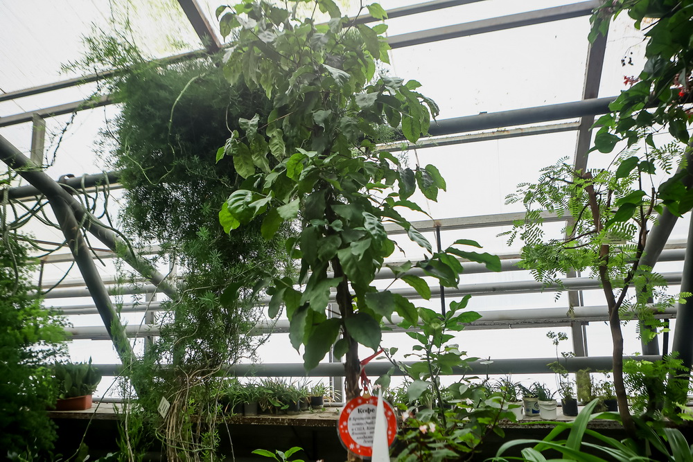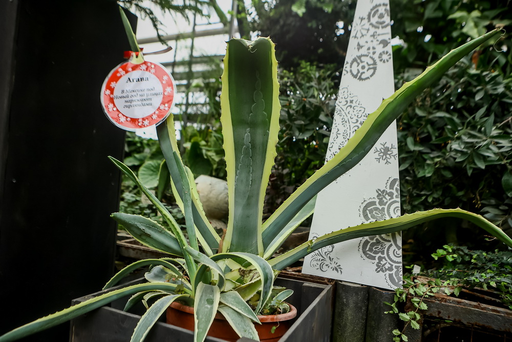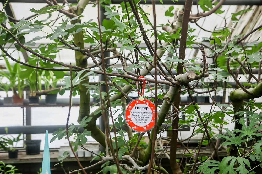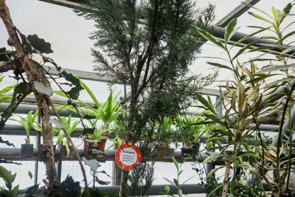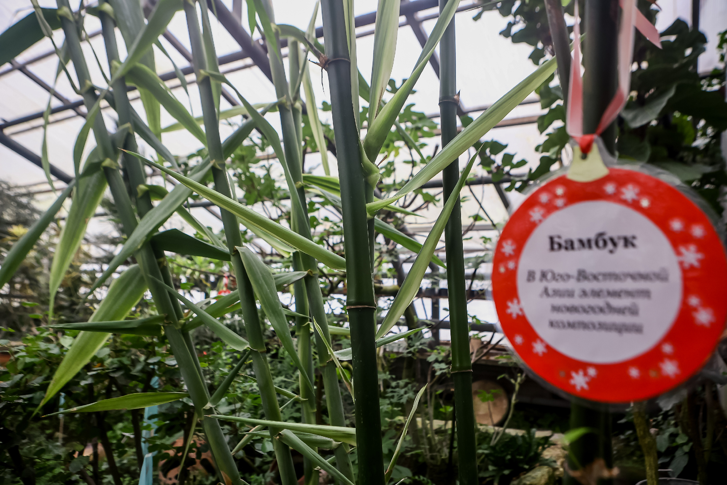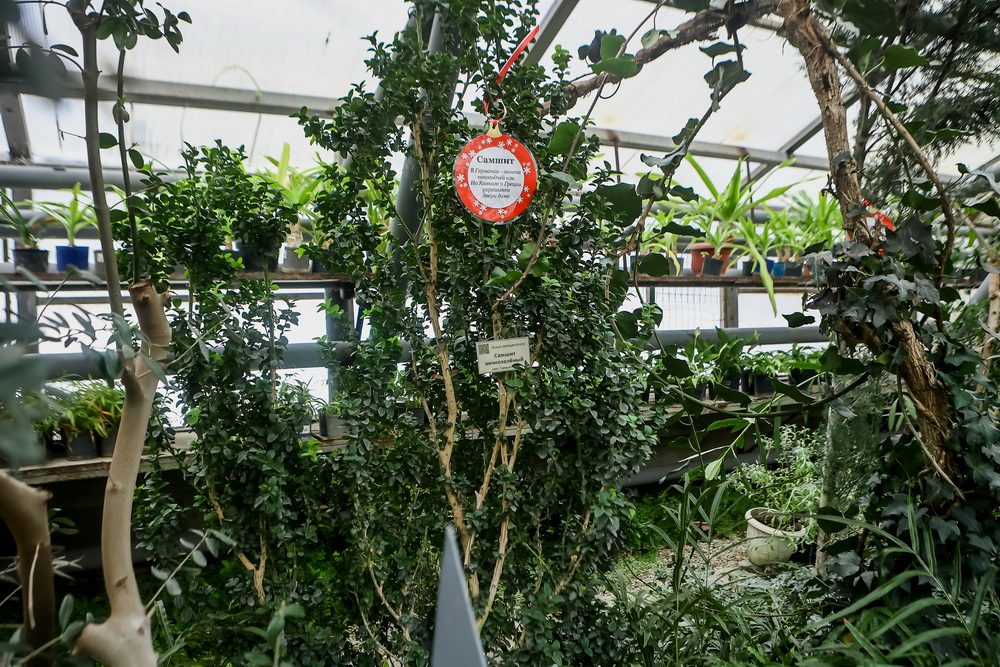 Посетителей зимнего сада яркой зеленью встречает тропическая и субтропическая флора. Некоторые из её представителей украшены специальными табличками — они сообщают, что перед нами новогоднее растение.
