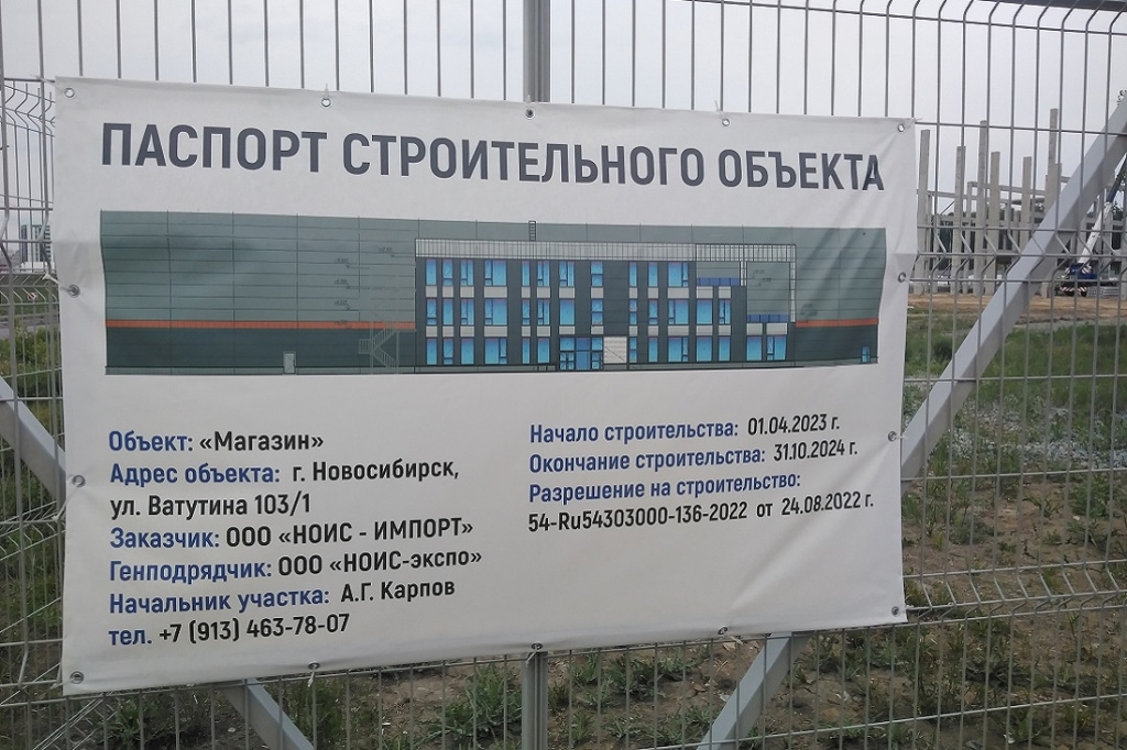 Строящееся здание занимает территорию площадью около двух гектаров за АЗС. По данным кадастровой карты, назначение участка — деловое управление (4.1). Паспорт объекта, размещённый на ограждении, сообщает, что в этом месте возводят магазин. Застройщиком выступает компания «НОИС-Импорт», а генподрядчиком — «НОИС-экспо». Проект здания разработала команда ООО «Стройпроект».