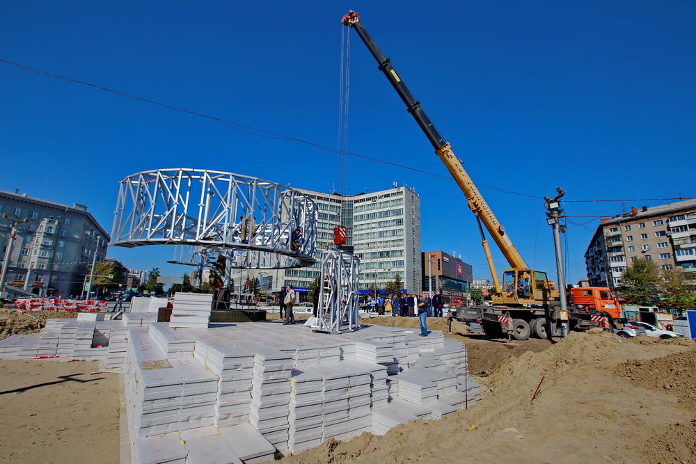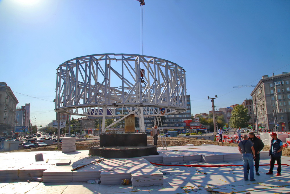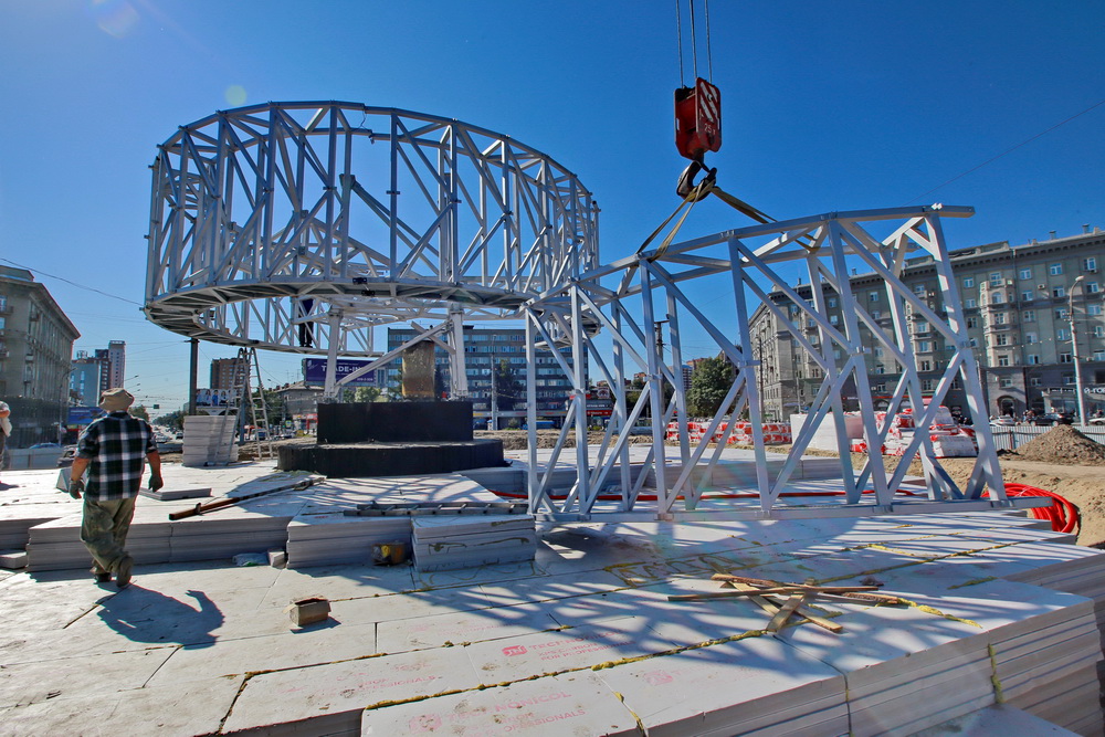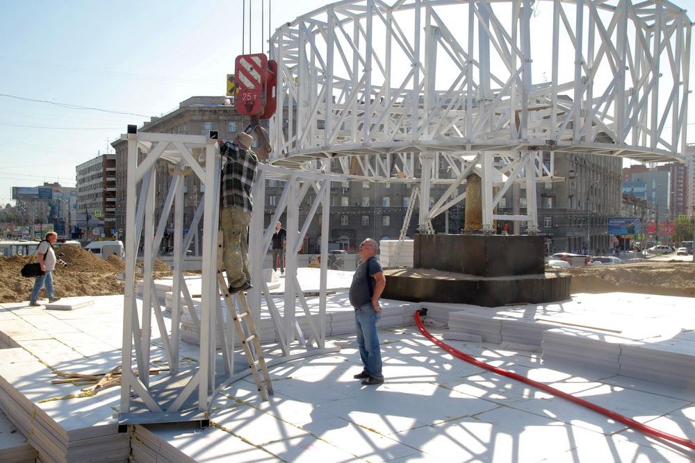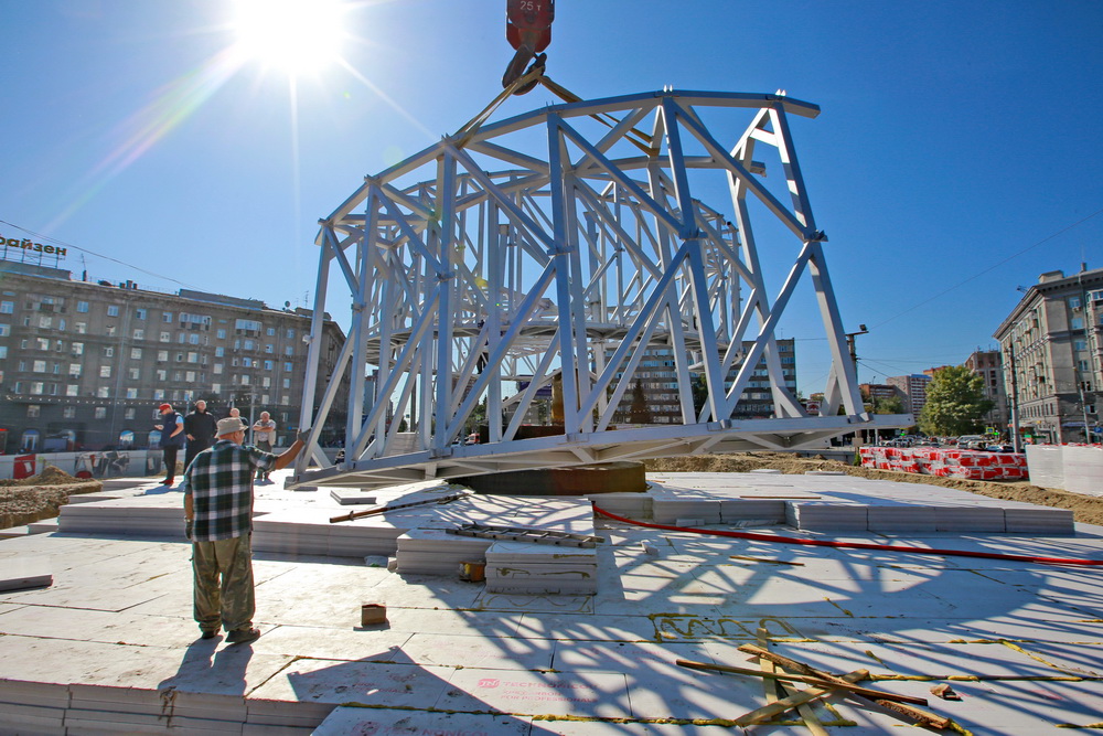 «Сейчас на заводе заканчивают шпиль. Конструкция вся будет высотой 31 метр, она будет из трёх частей. Потом привезут сюда, и уже окончательная сборка, а затем установка. До 10 сентября сборка несущей конструкции шпиля должна быть выполнена. Потом благоустройство: здесь несколько видов плитки будет», — отметил мэр Новосибирска Анатолий Локоть.
