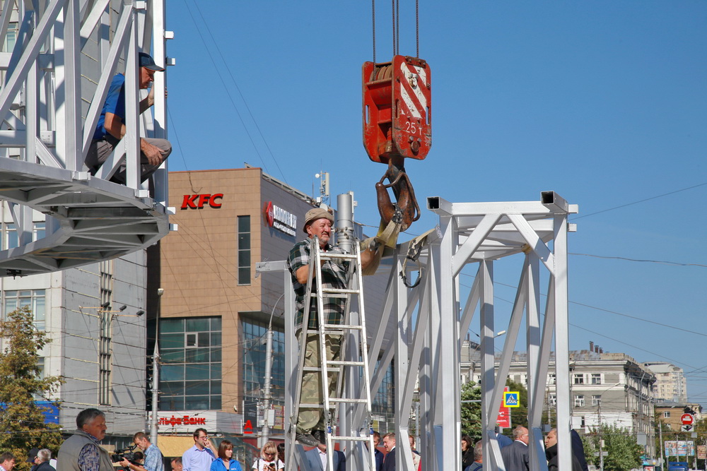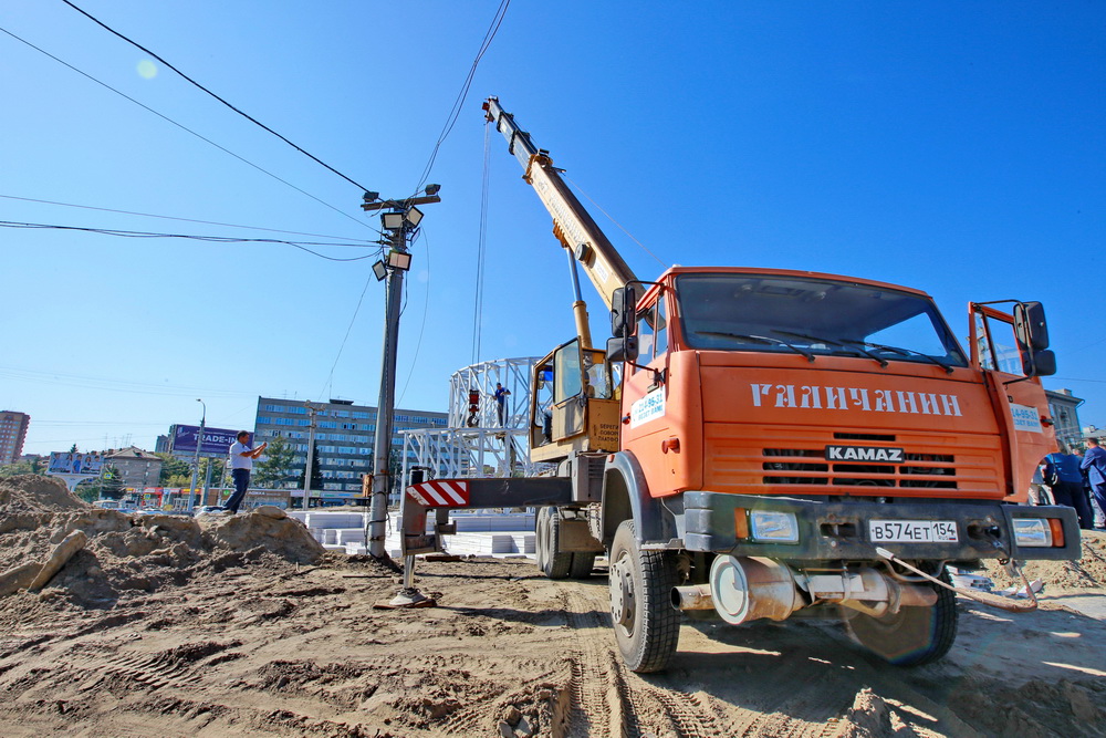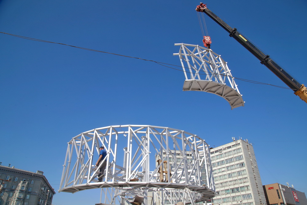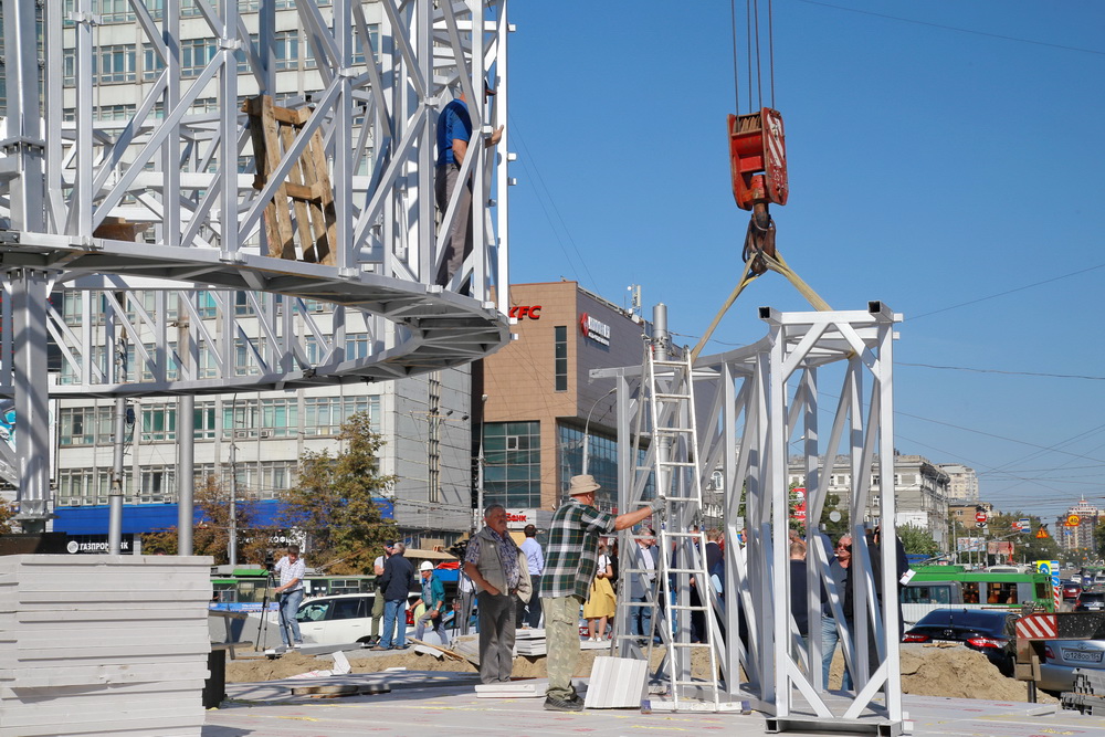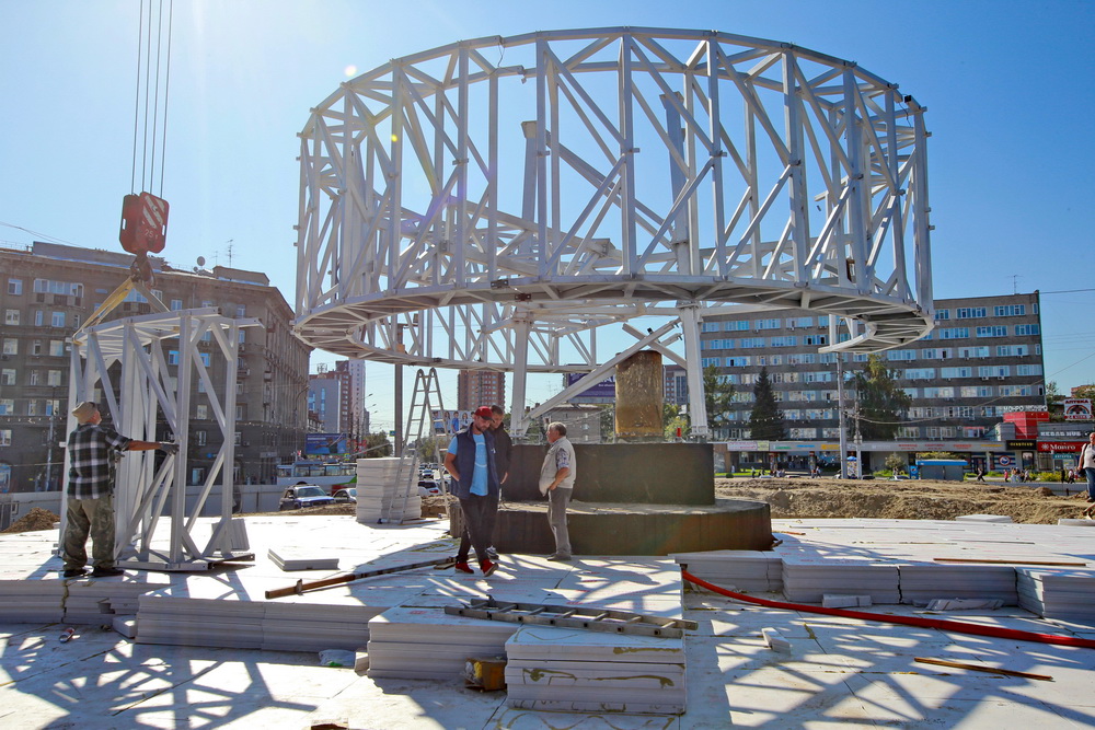 «Сейчас на заводе заканчивают шпиль. Конструкция вся будет высотой 31 метр, она будет из трёх частей. Потом привезут сюда, и уже окончательная сборка, а затем установка. До 10 сентября сборка несущей конструкции шпиля должна быть выполнена. Потом благоустройство: здесь несколько видов плитки будет», — отметил мэр Новосибирска Анатолий Локоть.