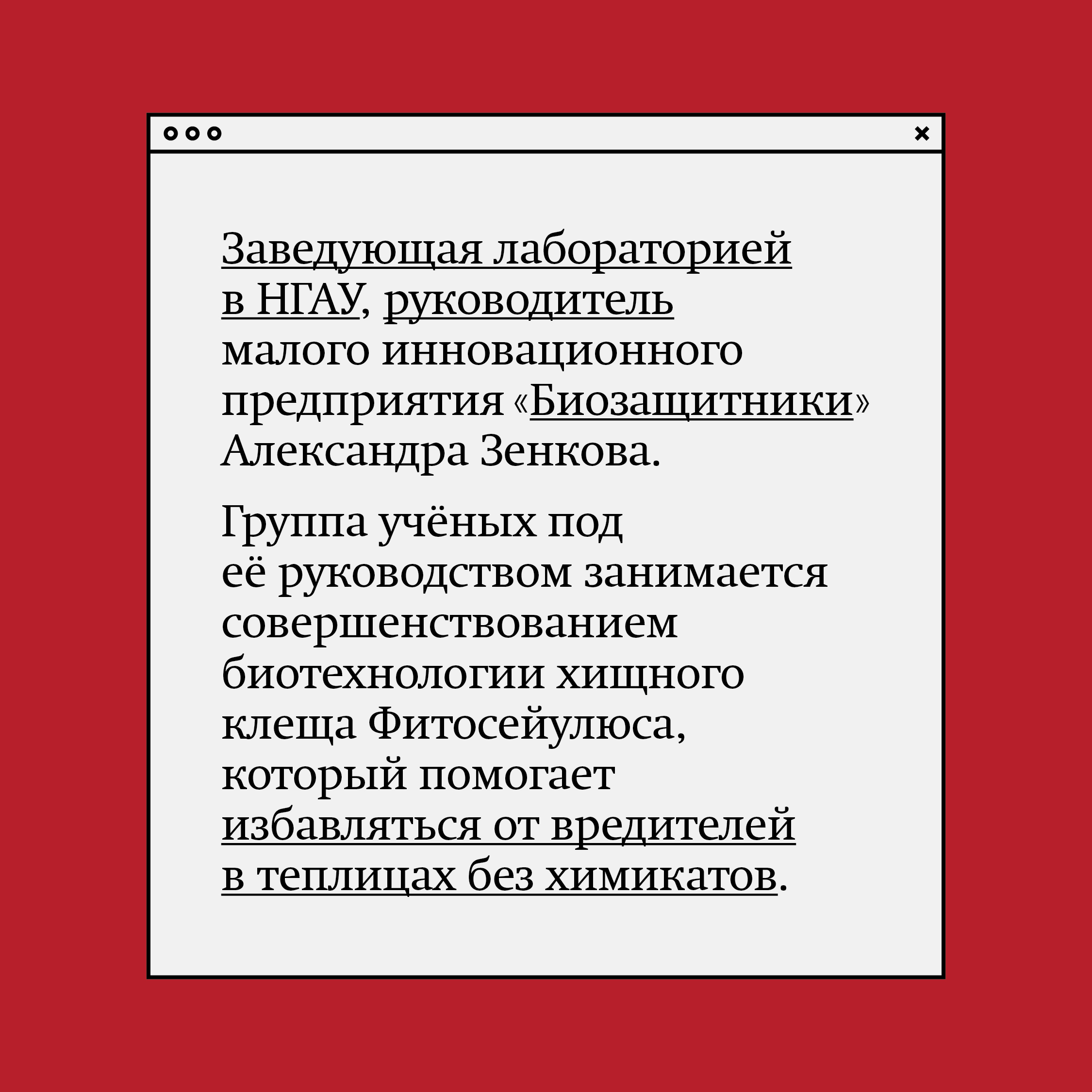 Заведующая лабораторией в НГАУ, руководитель малого инновационного предприятия «Биозащитники» Александра Зенкова получила от мэрии Новосибирска премию в 100 000 рублей в сфере науки и инноваций. Группа учёных под её руководством занимается совершенствованием биотехнологии хищного клеща Фитосейулюса, который помогает избавляться от вредителей в теплицах без химикатов. «Новосибирские новости» сходили в гости в лабораторию разведения энтомоакарифагов — микроскопических хищников...