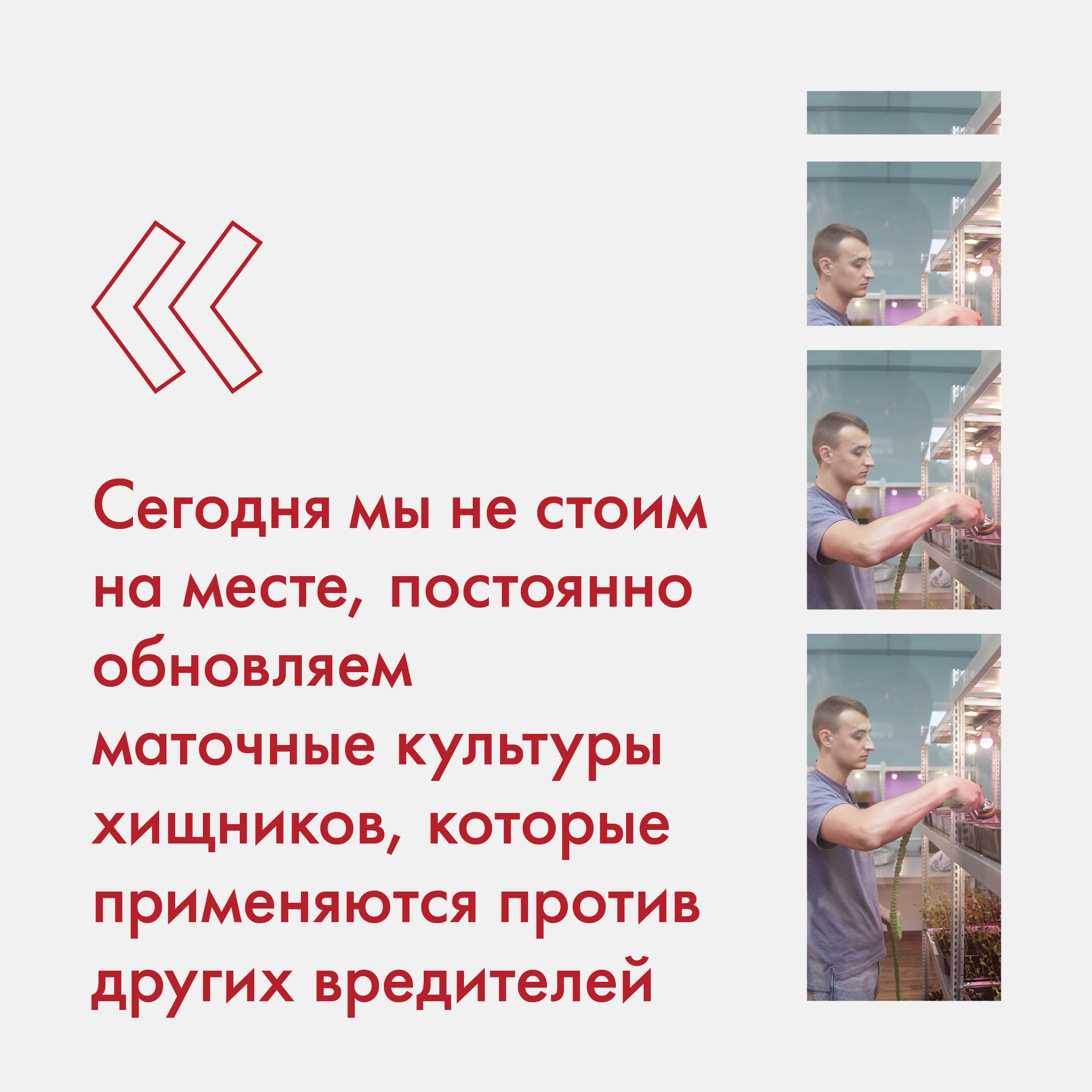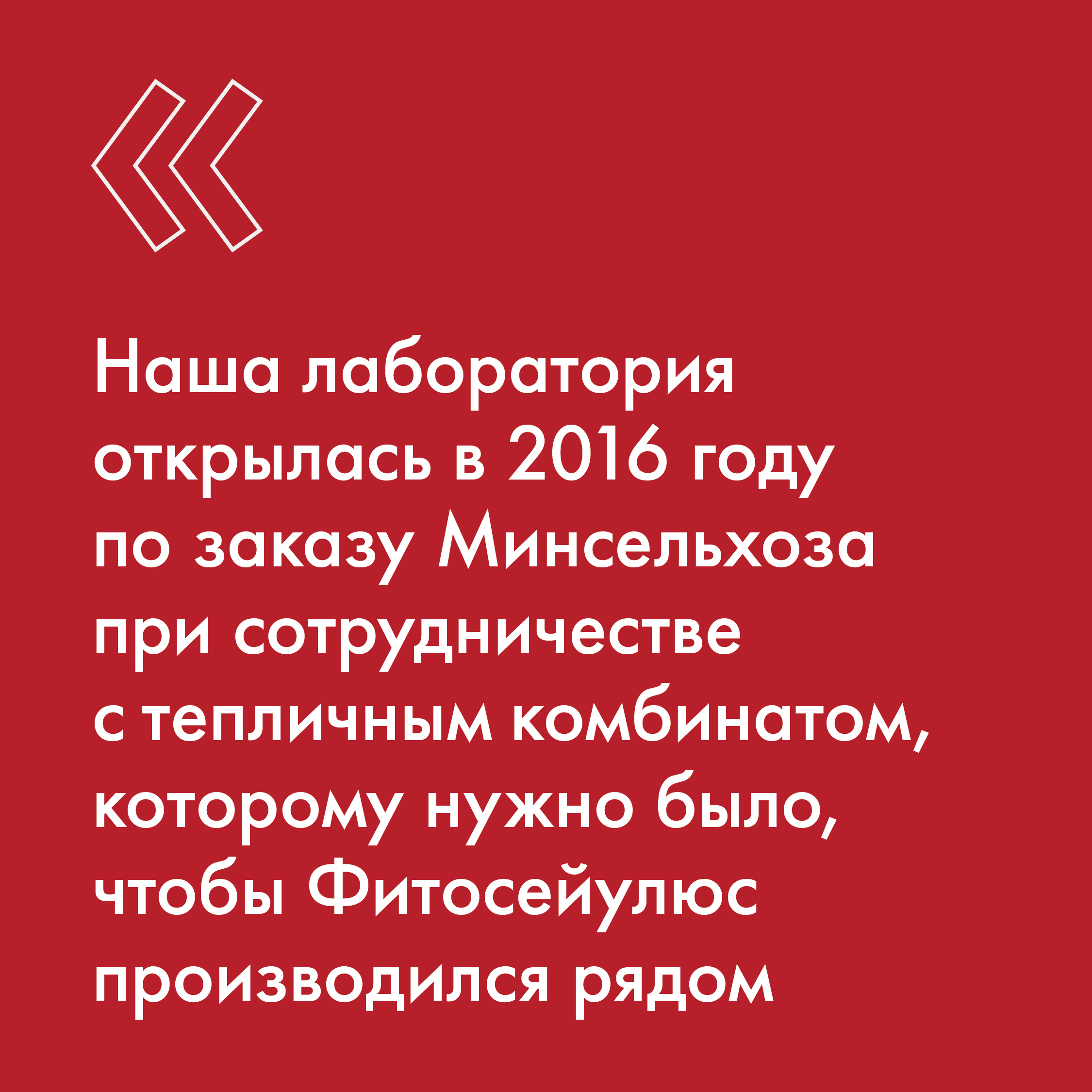 Наша лаборатория открылась в 2016 году по заказу Минсельхоза при сотрудничестве с тепличным комбинатом, которому нужно было, чтобы Фитосейулюс производился рядом. Сегодня мы не стоим на месте, не останавливаемся на Фитосейулюсе, постоянно обновляем маточные культуры хищников, которые применяются против других вредителей.