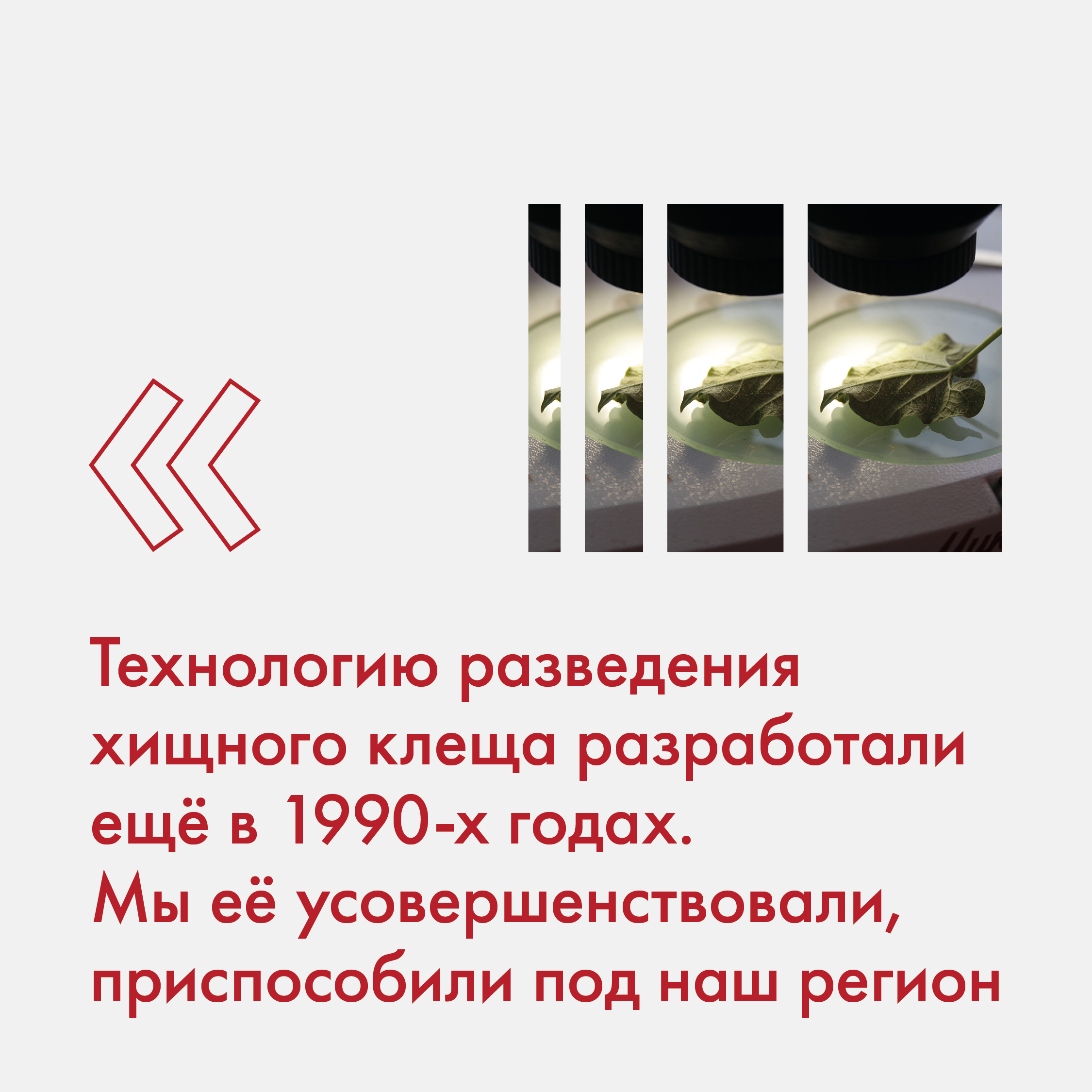 — В природе против каждого вредителя есть хищник, который его уничтожает. Фитосейулюс — это естественный враг обыкновенного паутинного клеща. Этот вредитель поражает посадки в теплицах. Как вредители, так и хищники были завезены из тёплых стран. Хищного клеща Фитосейулюса обнаружили в Чили и привезли в Россию. Маточную культуру мы взяли у всероссийского научно-исследовательского института защиты растений в городе Пушкине.