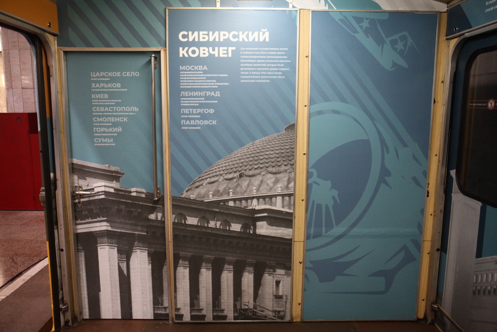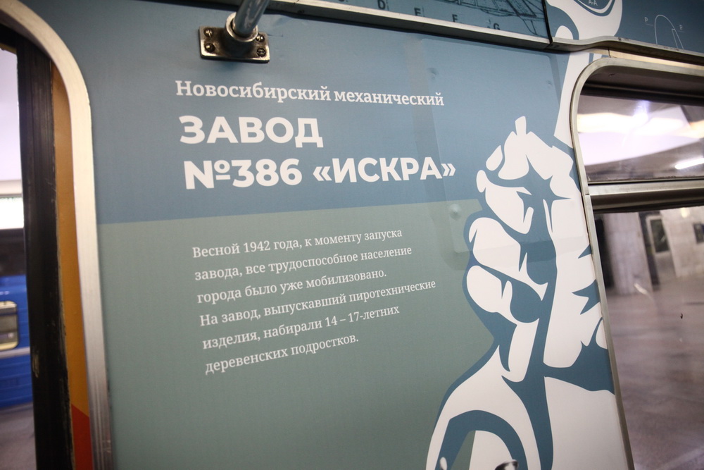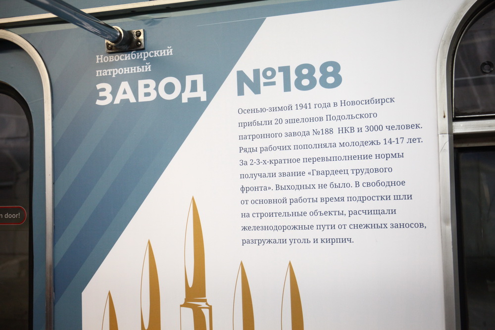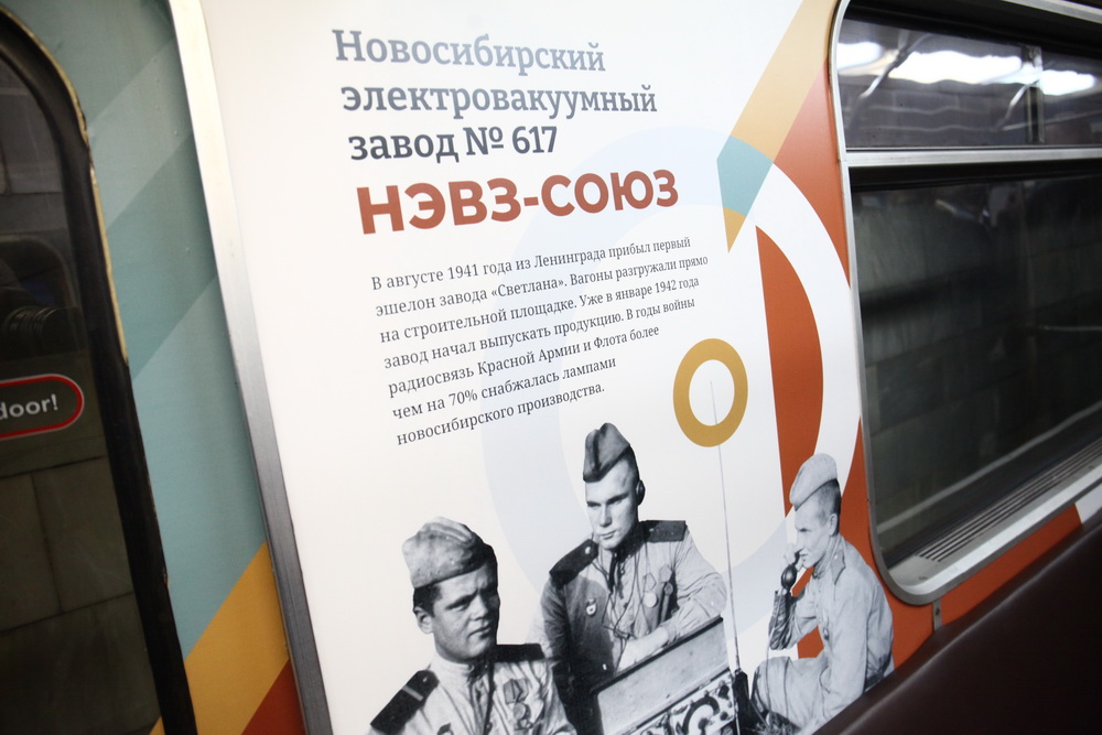 Новосибирск в этом году получил звание «Город трудовой доблести». В честь этого события — выставка в метрополитене. В вагонах — плакаты с рассказами о тех, кто помог выстоять в тяжёлое военное время.