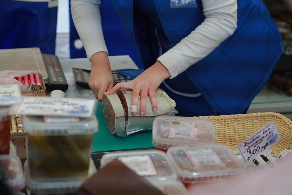 «Колбаса „Чёрная жемчужина“: свинина, говядина и чёрный уголь. Очень популярный продукт в Белоруссии. Предлагаем и вам, новосибирцам. Внешний вид интересный. Мы за натуральность, за качество, поэтому и привезли вам самое натуральное, самое вкусное, самое качественное», — представила свой товар продавец Юлия Халейко.