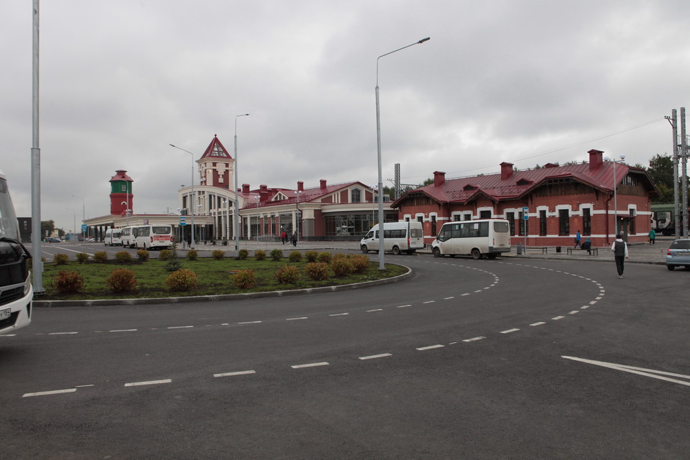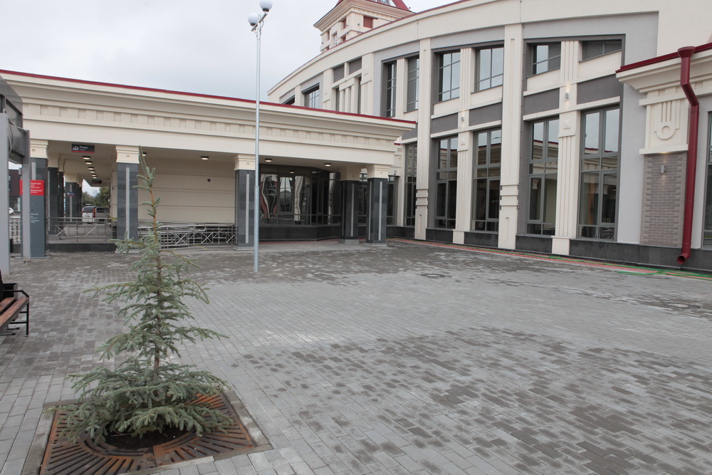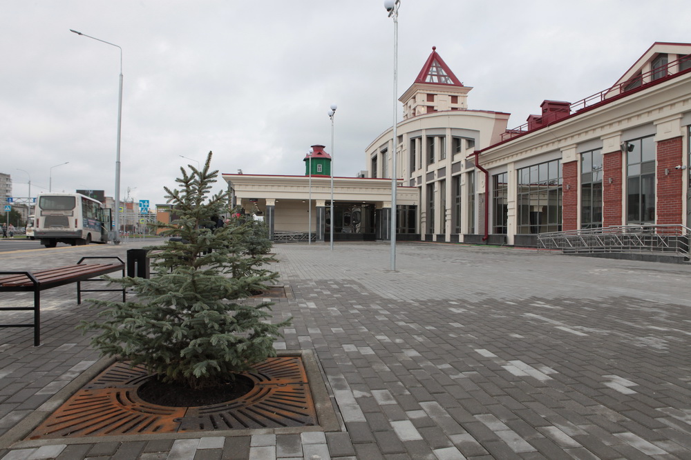 Привокзальную территорию замостили новой плиткой, вдоль проезда высадили голубые ёлочки, установили скамейки, урны и смонтировали освещение.