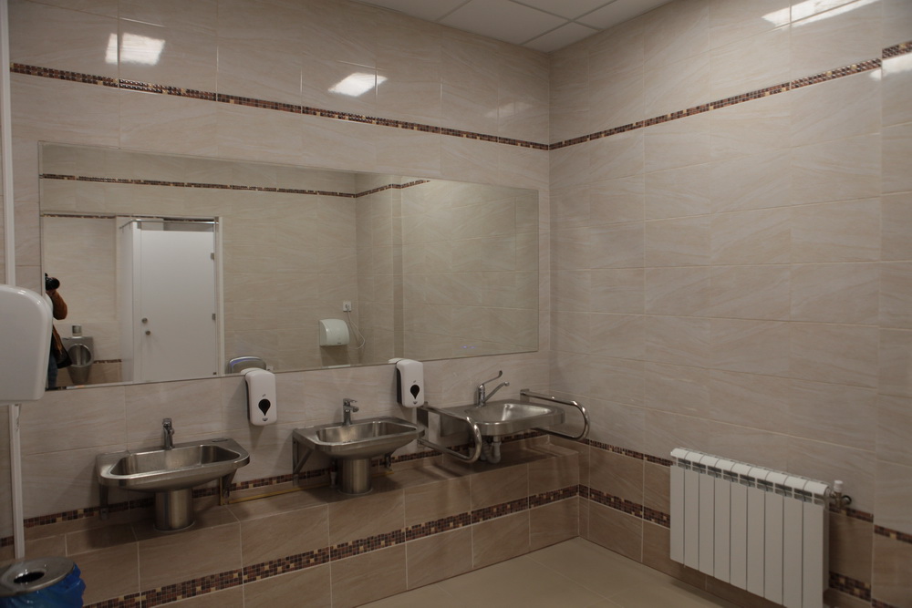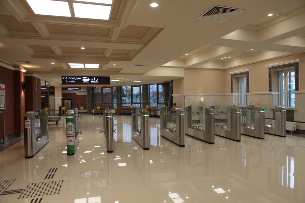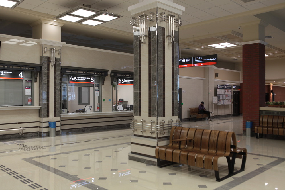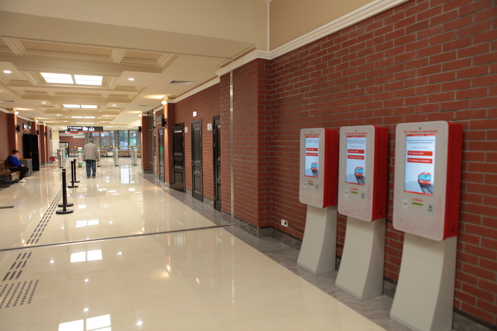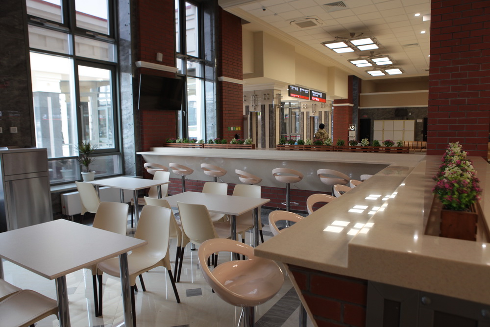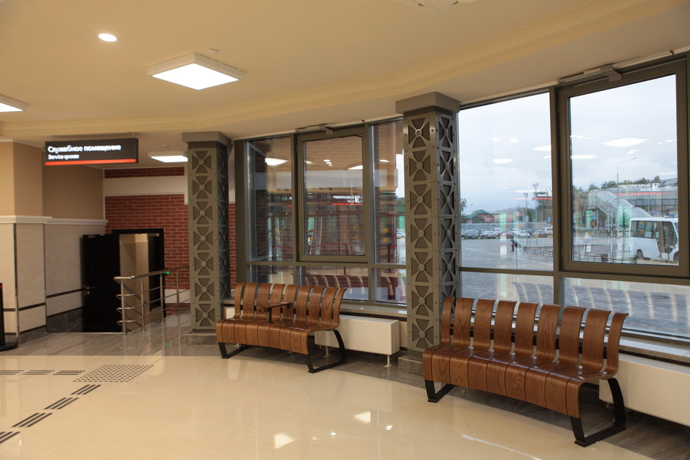 Кроме залов ожидания с билетными кассами в здании предусмотрели комнату для пассажиров с детьми, кафе, туалет. Установлены билетопечатающие автоматы, турникеты, рамки-металлоискатели, терминал для зарядки гаджетов.