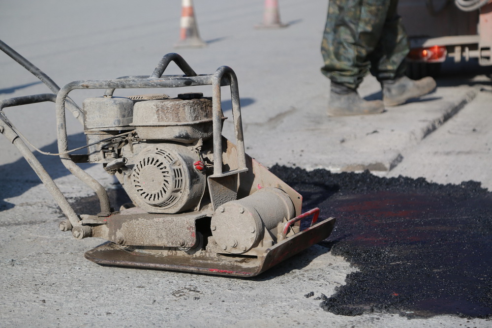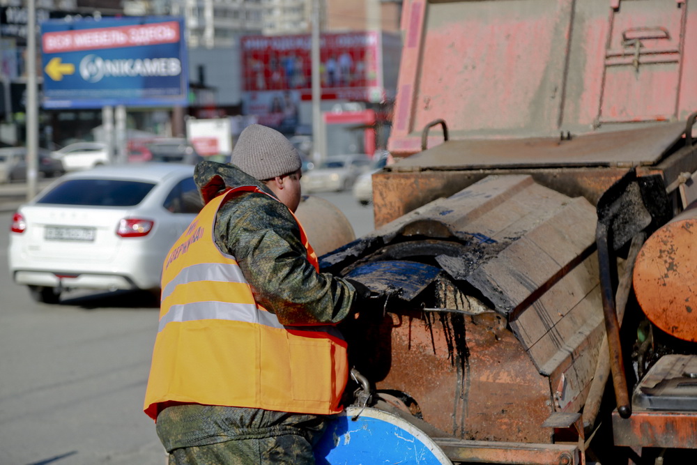 «Качество работ довольно-таки хорошее. Потому что асфальт сам по себе горячий, и тут же он выгружается на место работ, на саму яму, не остывает — и тут же укатывается всё», — объясняет начальник участка по озеленению и благоустройству МКУ «Дзержинка» Сергей Никулин.