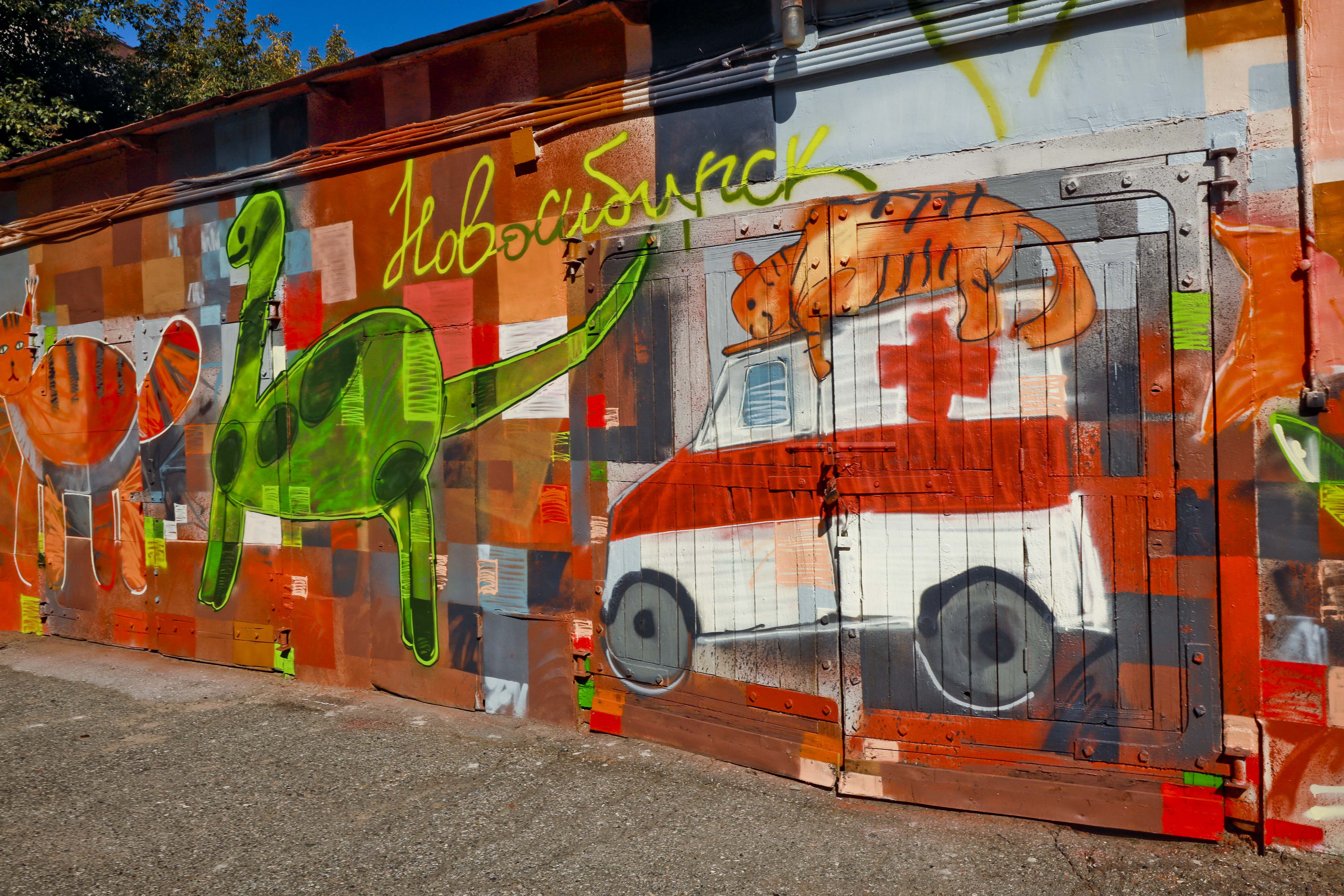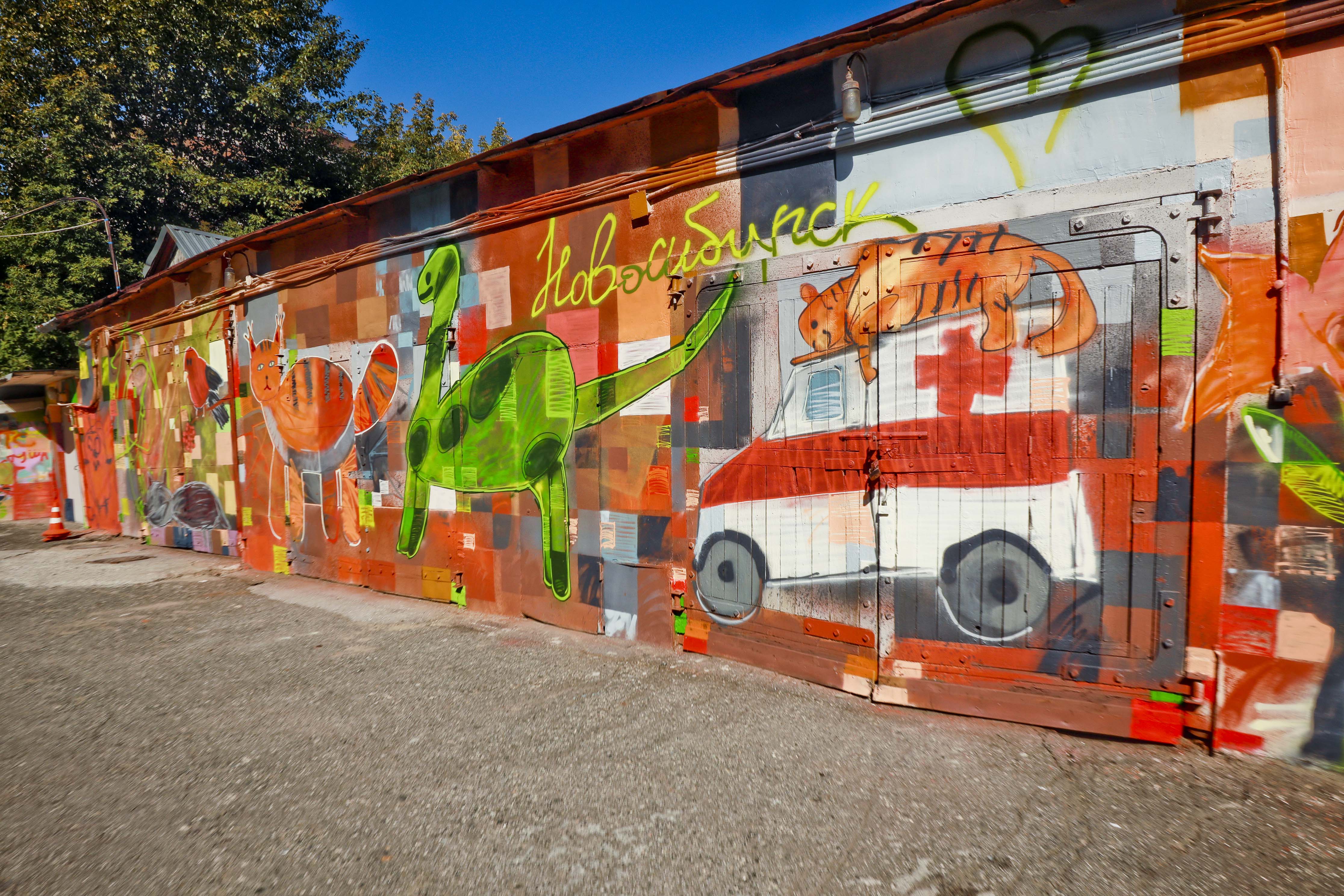 Во дворе детской больницы скорой помощи на Красном проспекте, 3 художники разрисовали стены хозяйственных корпусов картинами на основе рисунков маленьких пациентов стационара. Теперь малышам будет гораздо веселее смотреть в окно. Проект реализован общественной организацией «Больничные клоуны НОС» при поддержке фонда президентских грантов в рамках «Соц-арт проекта „Город во дворе“». Темой рисунков стал наш город. В финальный эскиз помимо узнаваемых объектов Новосибирска Бугринского моста, оперного и кукольного театров вошли кареты скорой помощи, коты, белки и даже динозавры.
