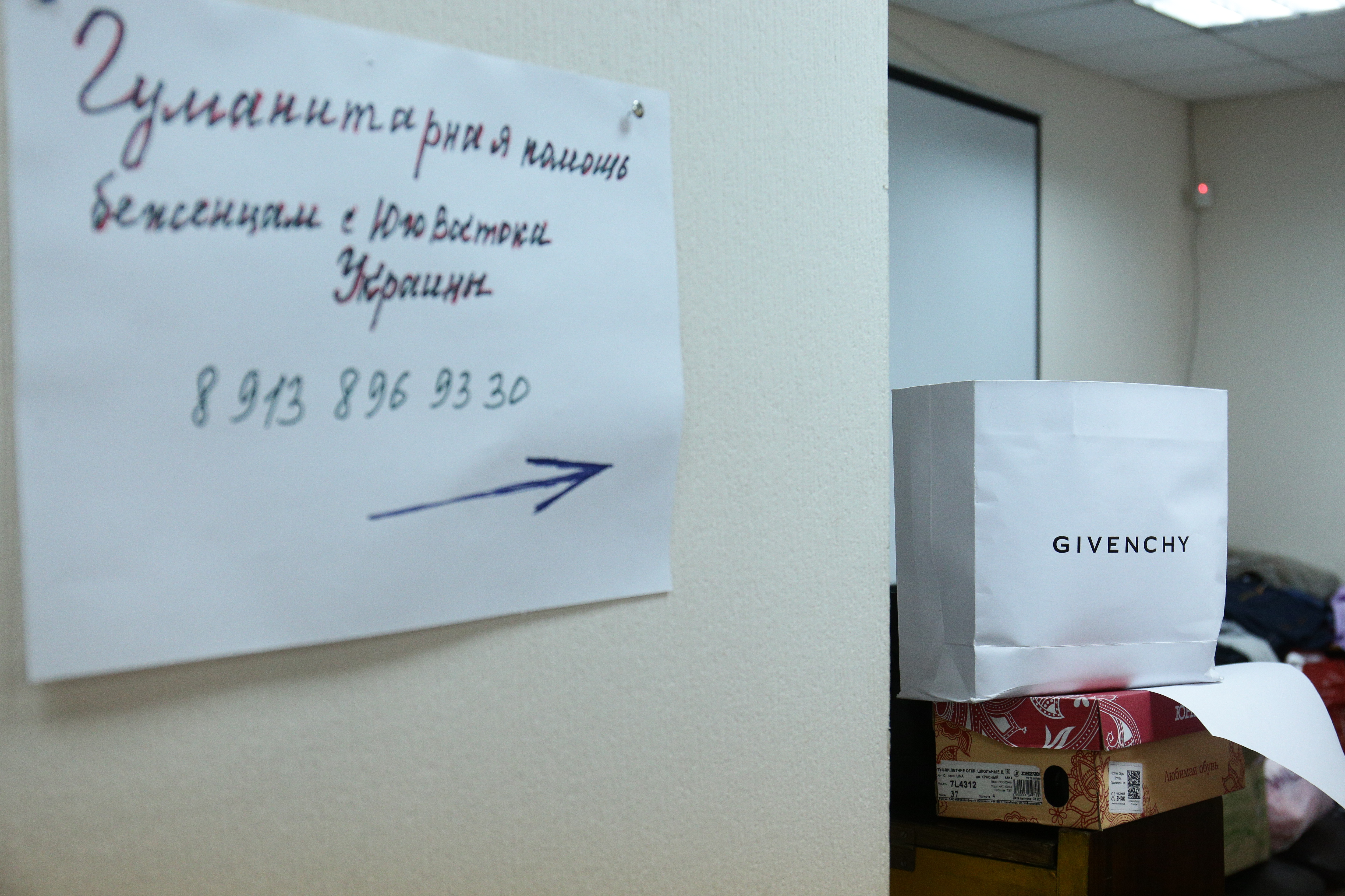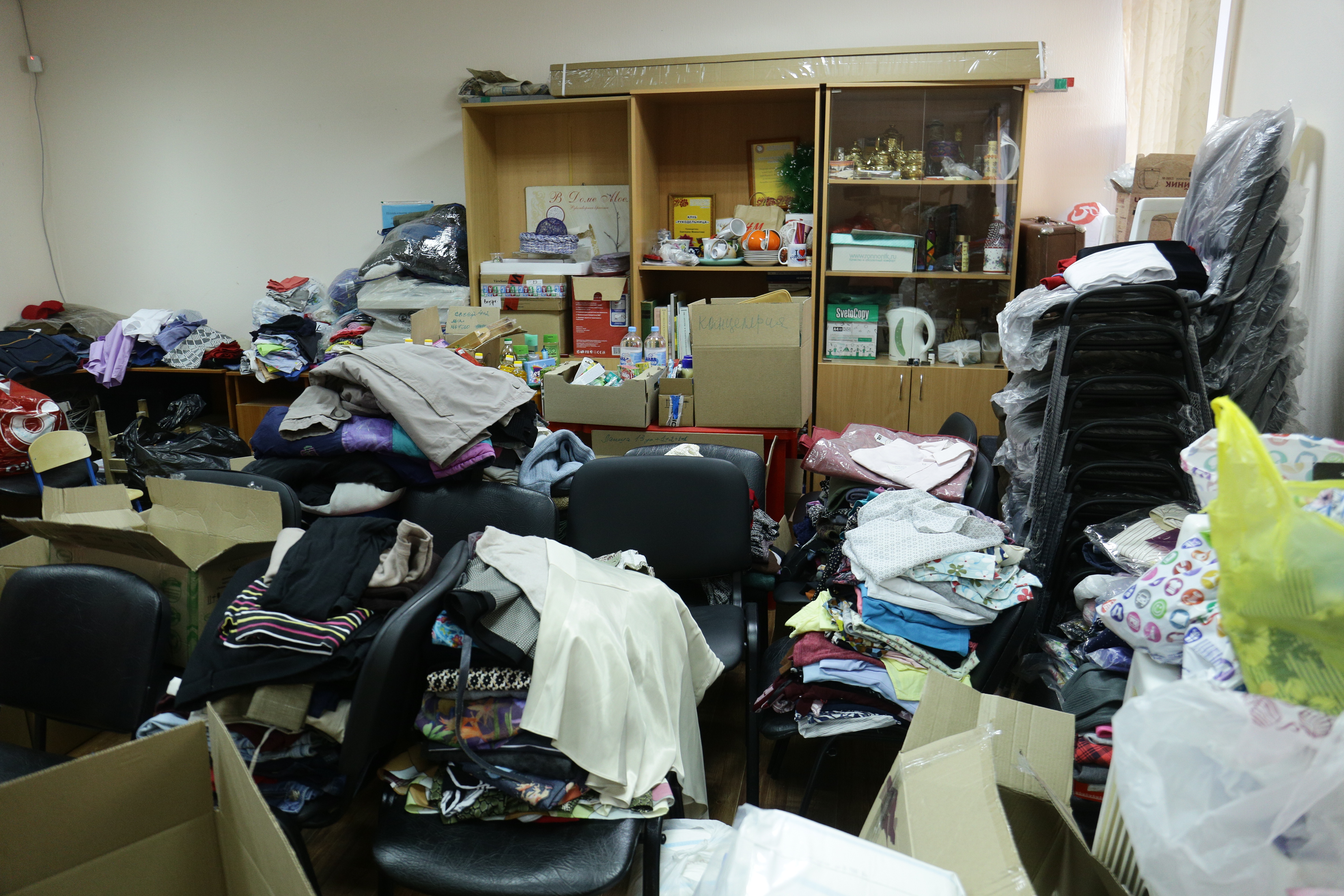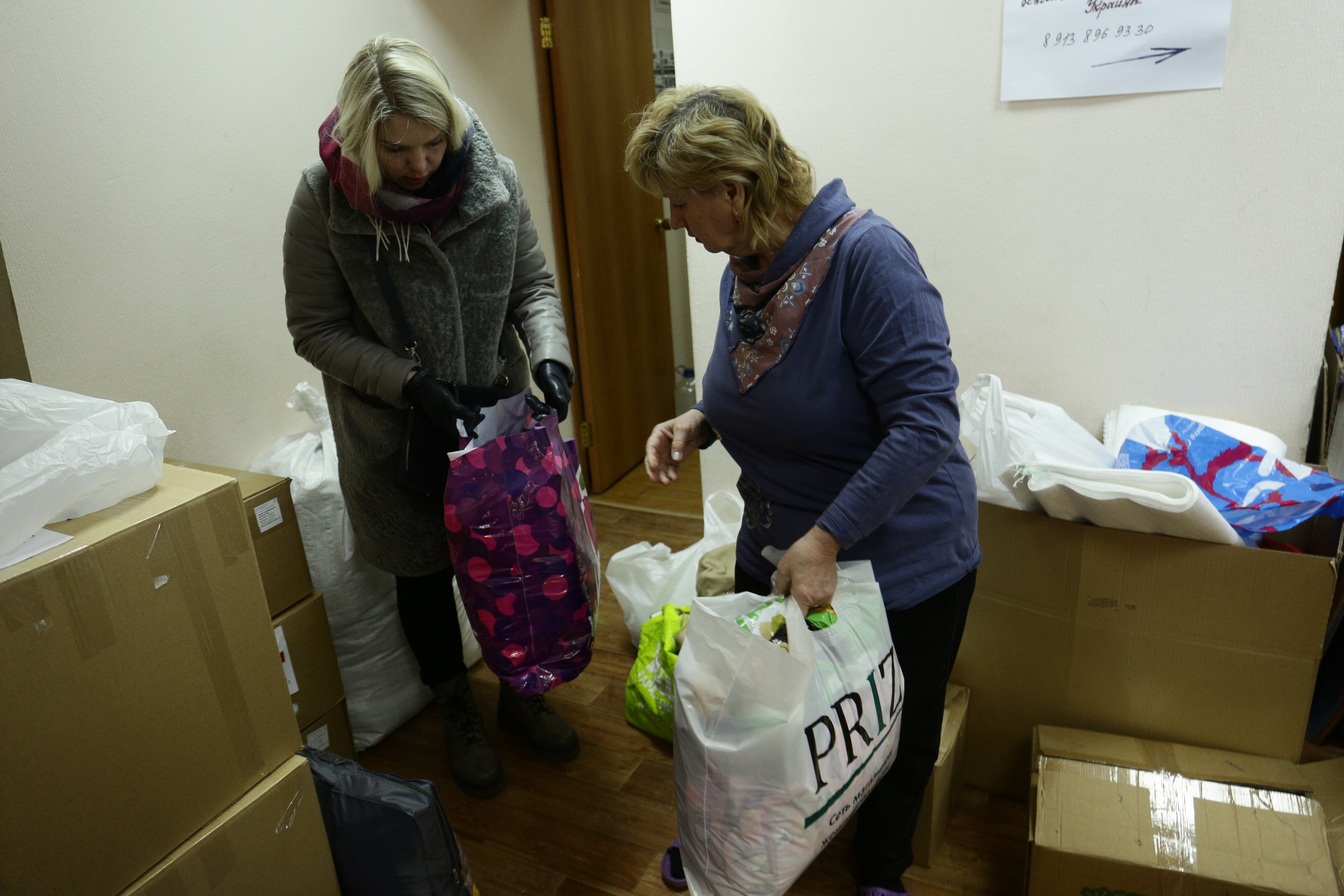 В этом зале ресурсного центра общественных объединений Железнодорожного района раньше собирались пенсионеры на лекции и уроки компьютерной грамотности. Сегодня стулья и столы сдвинуты в сторону. Теперь здесь точка приёма гуманитарной помощи.