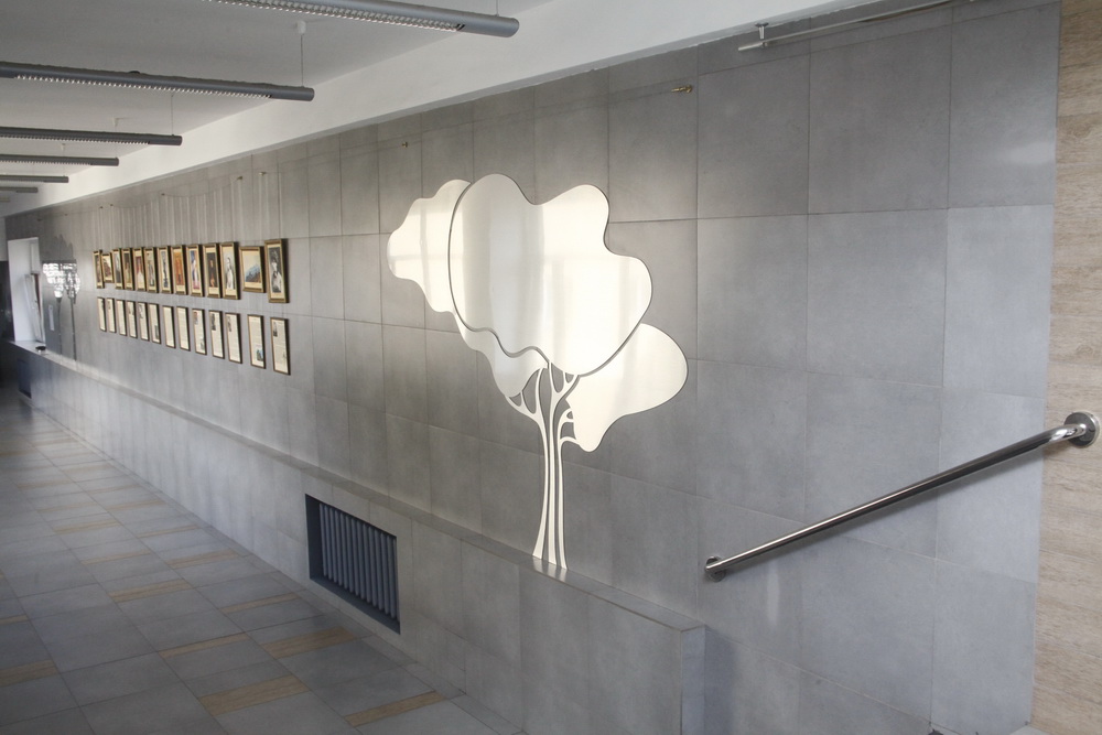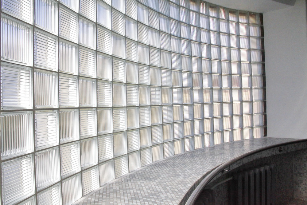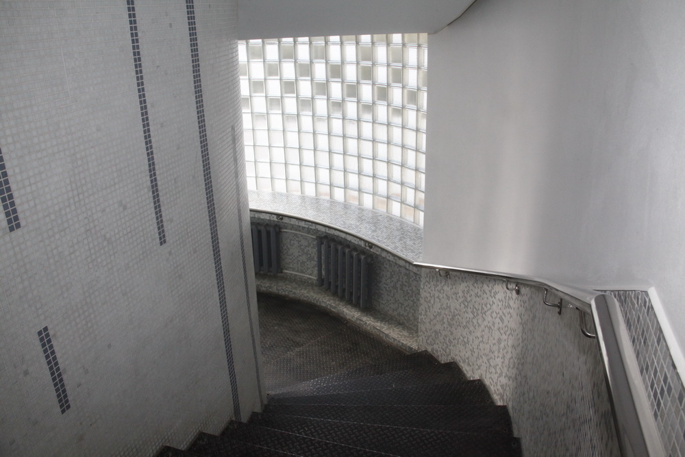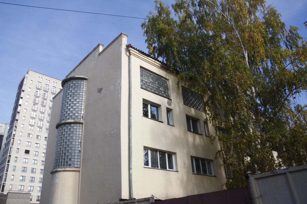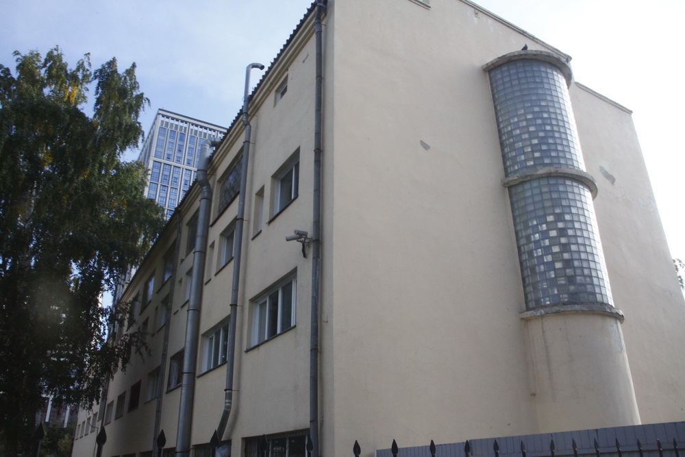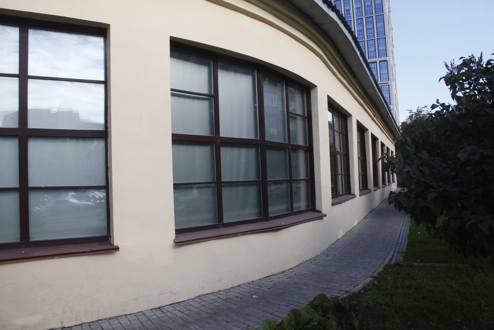 Выразительность фасаду придают «лежачие» окна и полукруглая лестничная клетка с широкой винтовой лестницей. Она выделена в объёме здания в виде башни-пристройки из стеклоблоков. Несколько лет назад витражи обновили. Стеклянные кирпичи пришлось заказывать из-за границы.