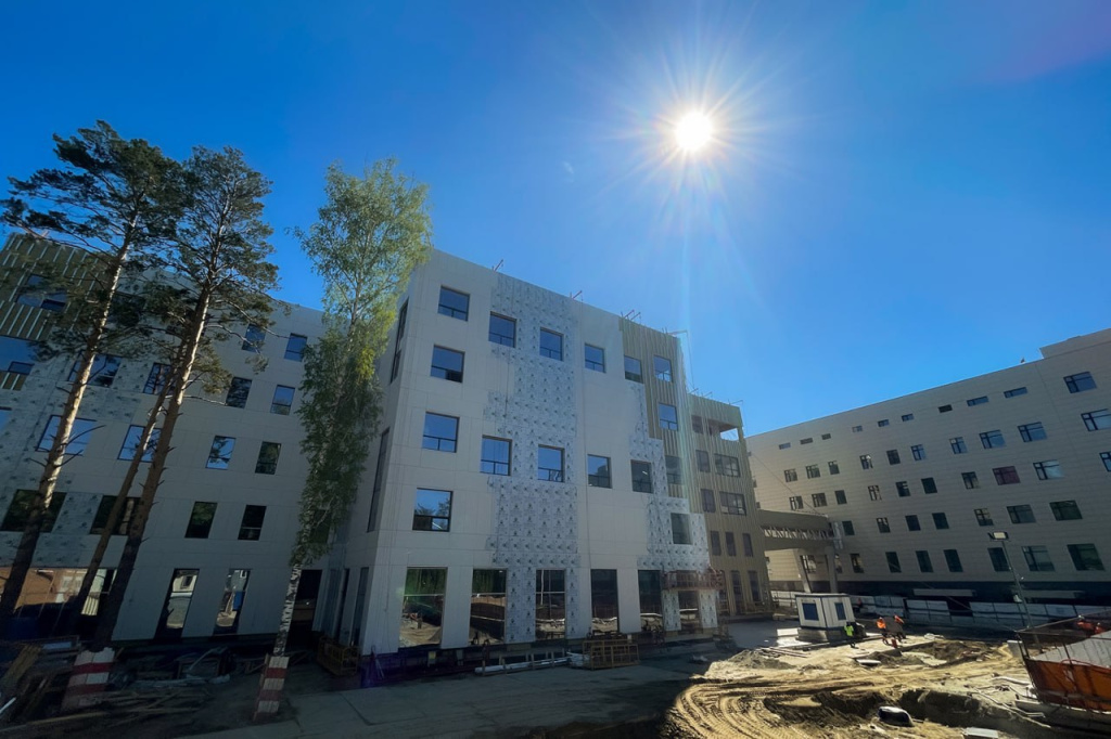 На территории корпуса сейчас монтируют ливневую канализацию, хладоснабжение, внутренние инженерные системы. Практически завершены работы по прокладке системы вентиляции. Облицовано 70% фасада, снаружи укладывают тротуарную плитку и обустраивают парковку.