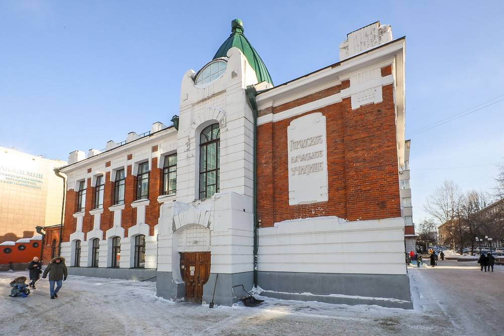 Это здание находилось рядом с вокзальной площадью, там, где сейчас стоит жилой дом с адресом Ленина, 59. Оно было построено по тому же проекту, что и школы на Якушева и на Ядринцевской. Художник Василий Касаткин изобразил это утраченное сооружение акварелью.