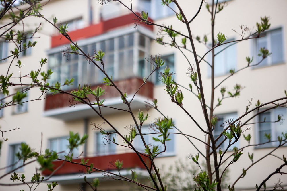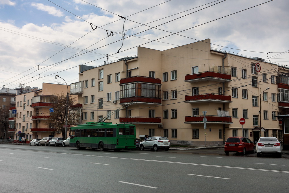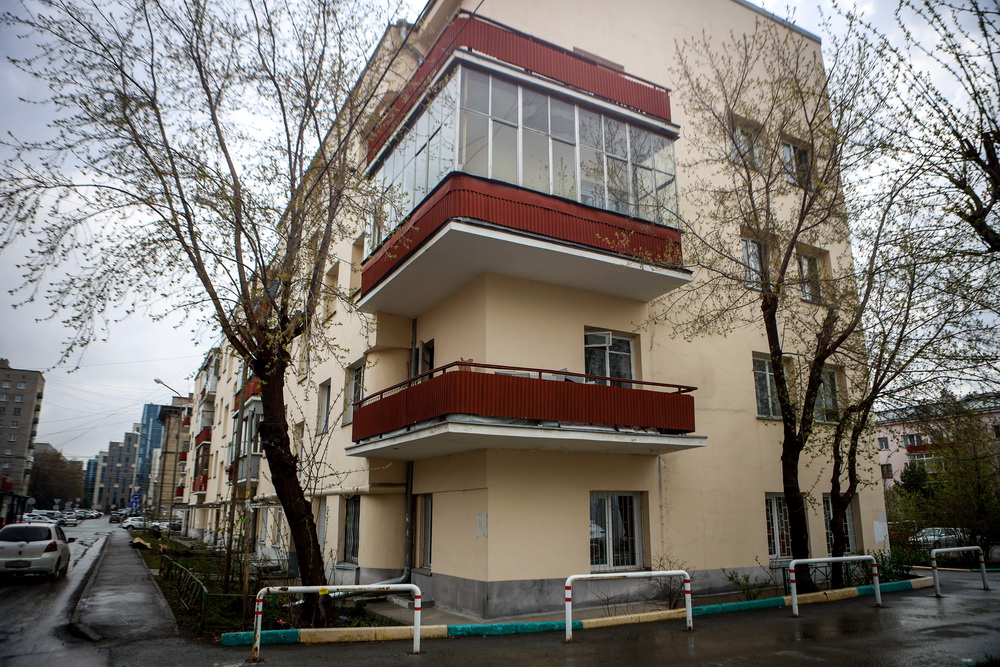Два жилых дома имеют несколько балконных решений: одни заглублены между выступами, другие рассчитаны не на одну квартиру, а на две. Просторные балконы «обнимают» углы зданий, что характерно для городской застройки 30-х годов.