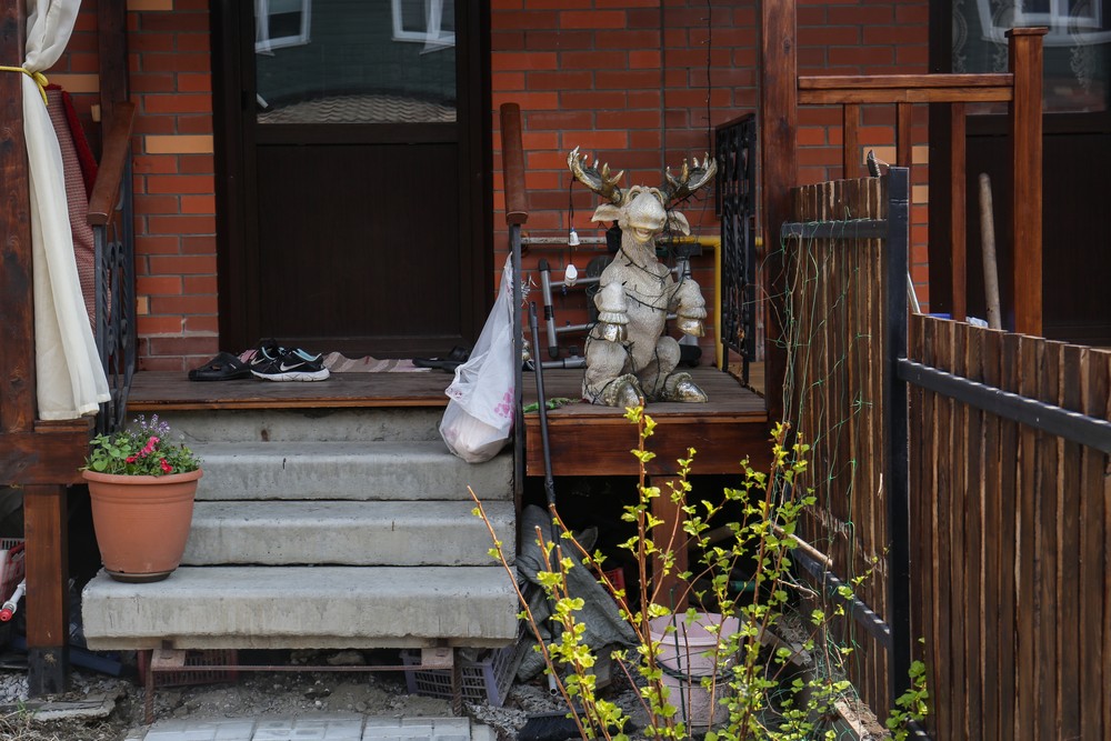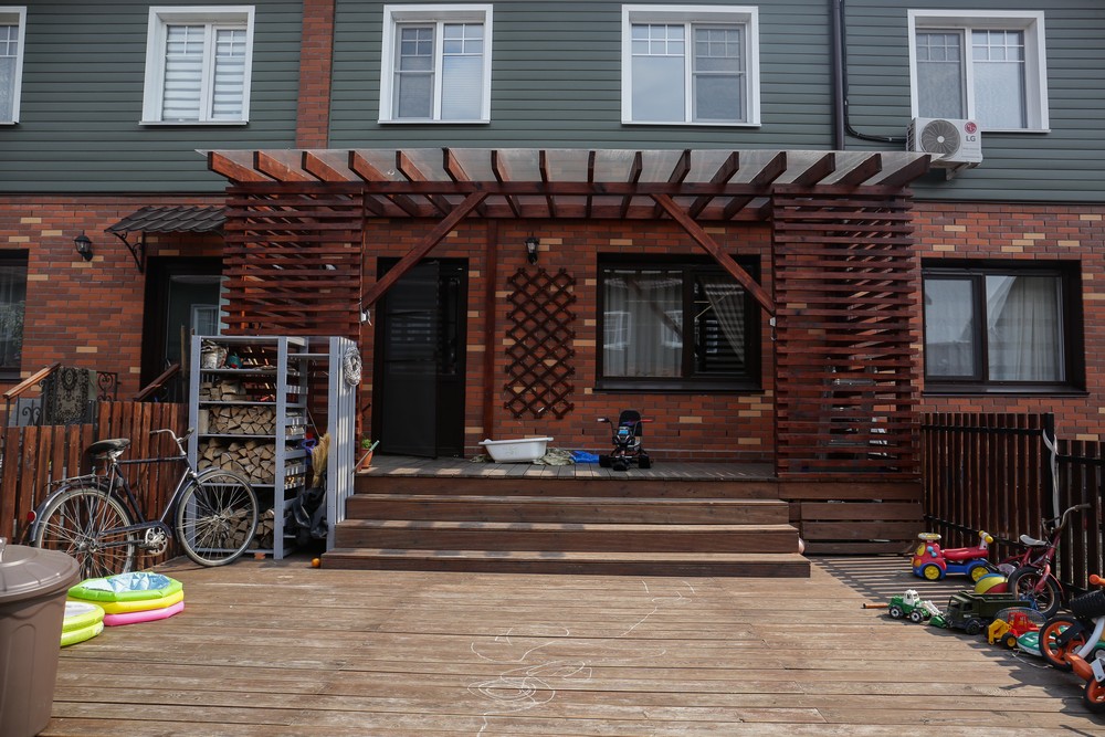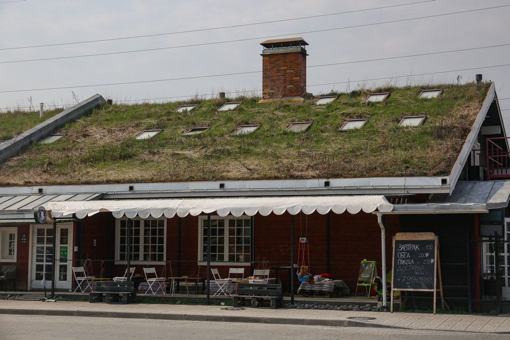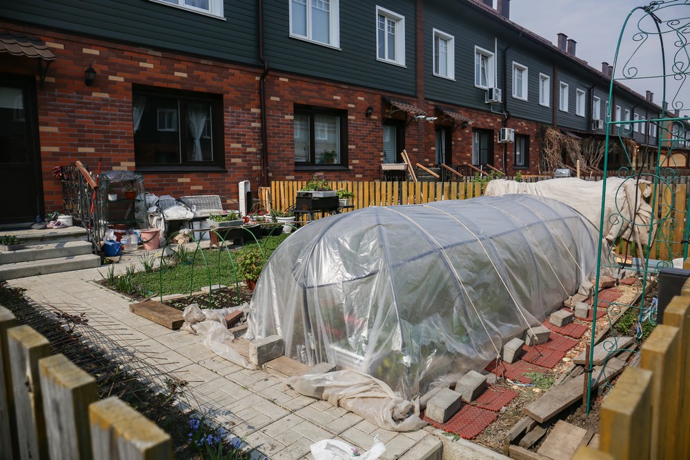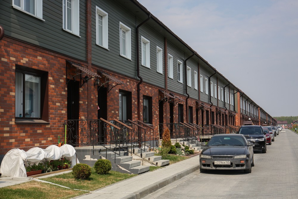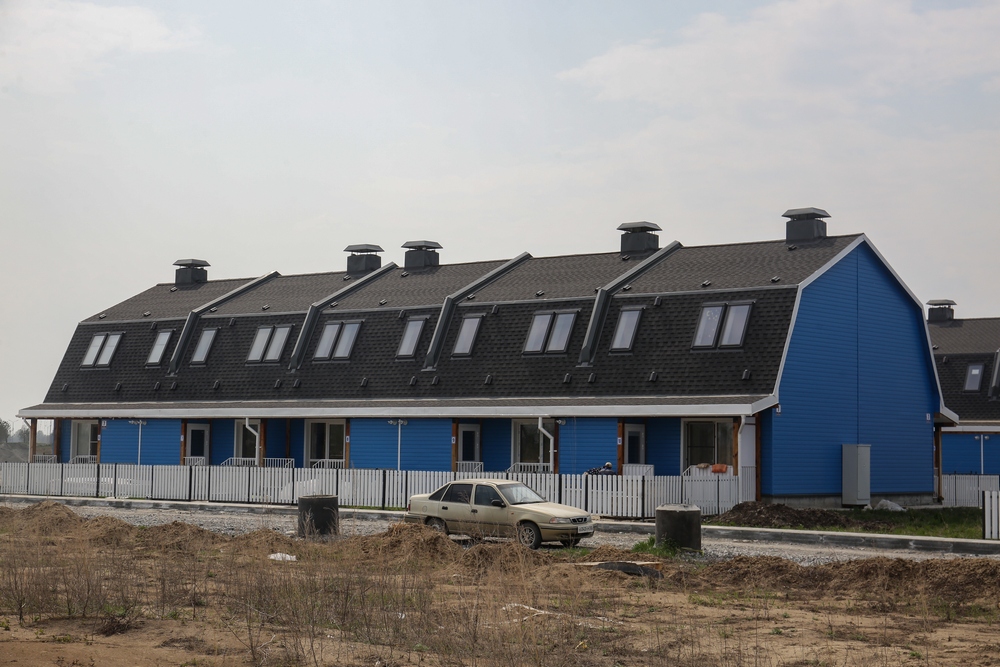 В квартале Королёва дома совсем другие. Это одноэтажные таунхаусы с мансардными этажами. Фасады отделаны яркой синей вагонкой. У каждого таунхауса есть свой небольшой дворик, огороженный белым забором. Первые жильцы уже успели посадить на 15 квадратных метрах цветы, клубнику, а кое-кто даже лук и щавель. Всего в квартале Королёва построят шесть домов по пять таунхаусов в каждом.
